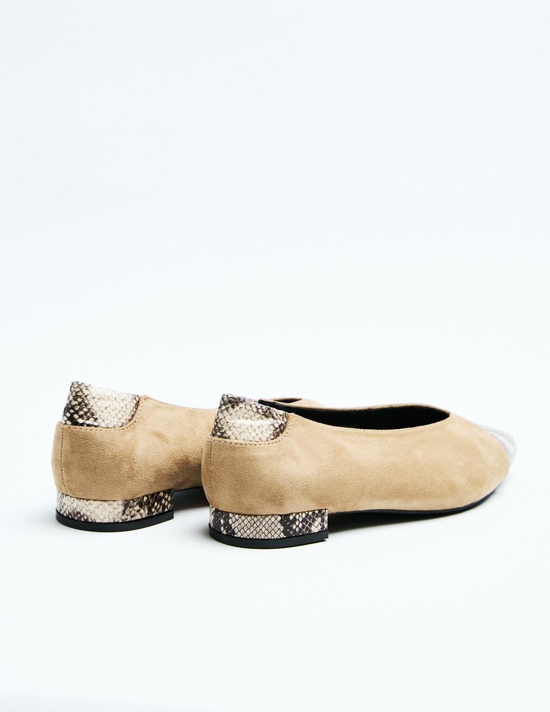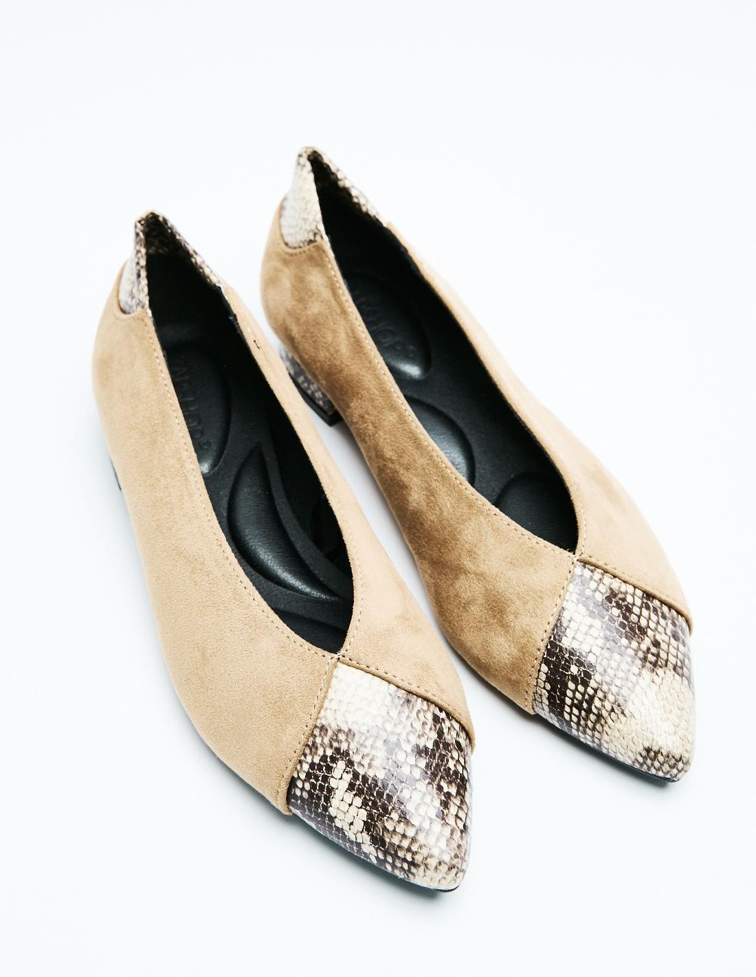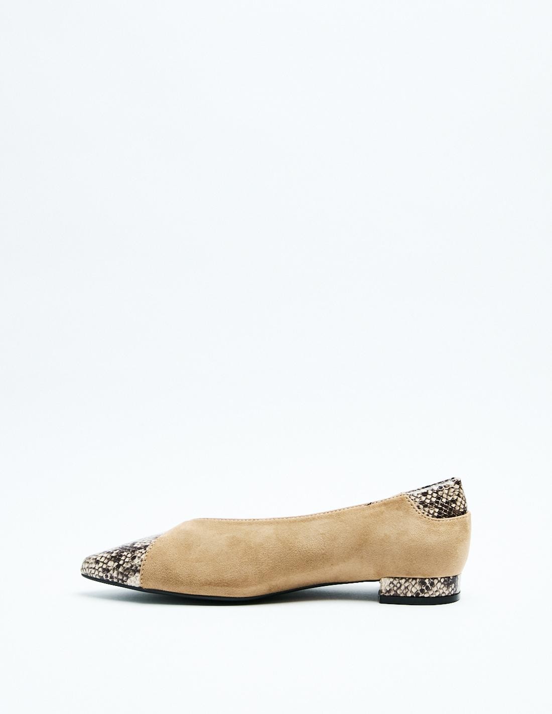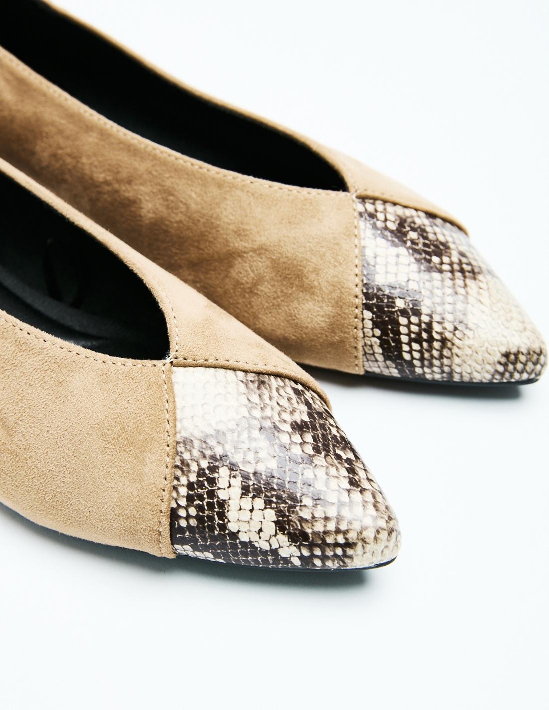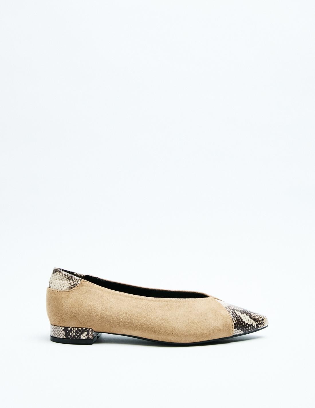 Zapato tipo manoletina en efecto piel, con detalle en punta. Altura tacón: 2 cm