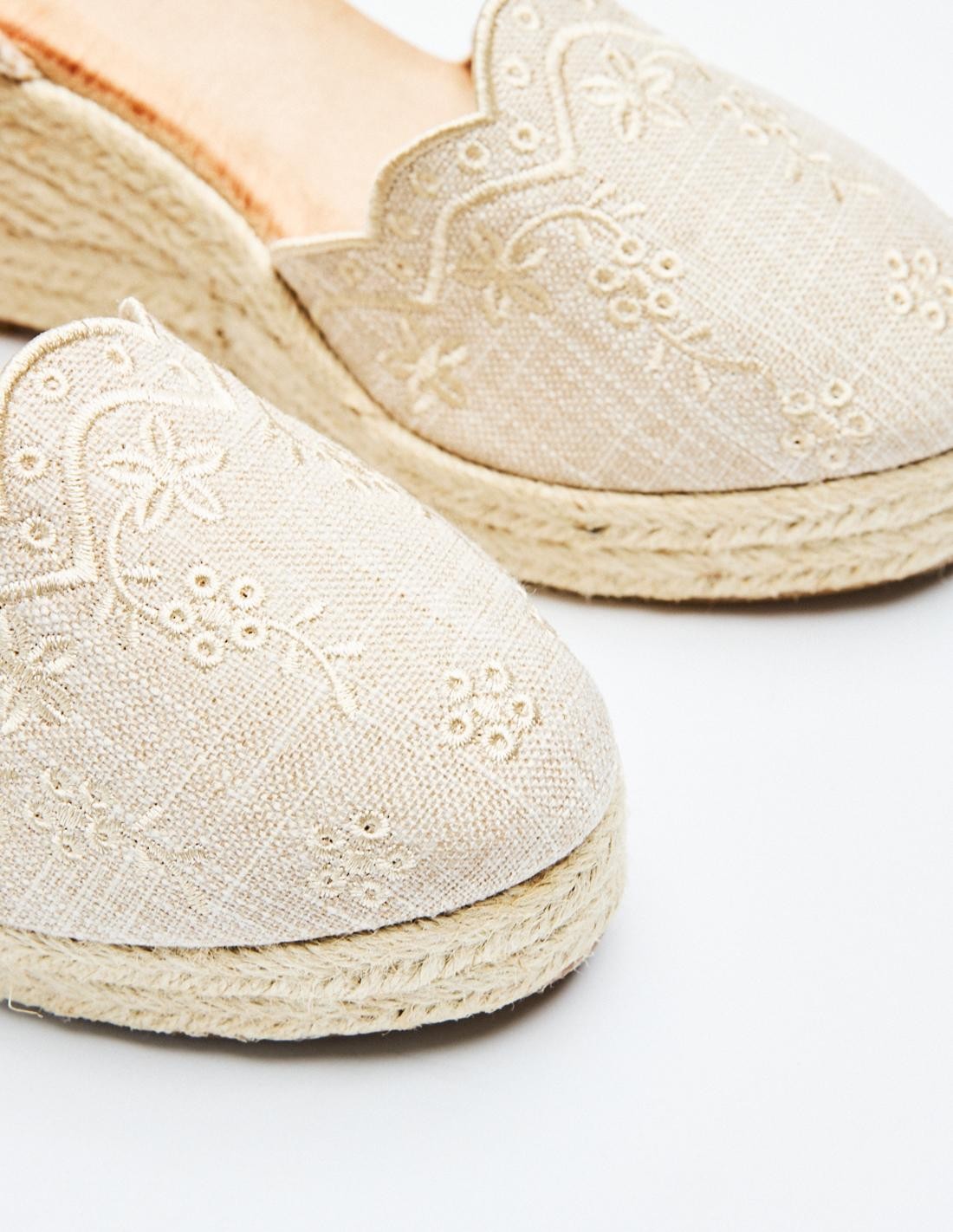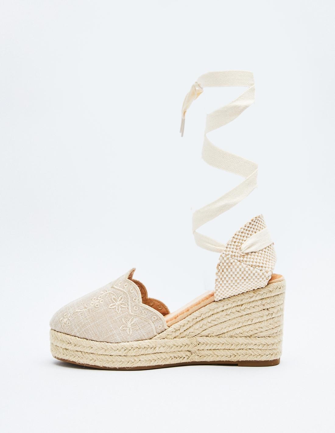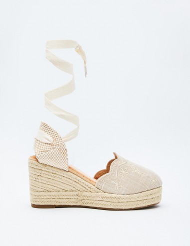 Alpargata tipo cuña con diseño tejido floral. Suela forrada de yute. Cierre mediante cinta a lo largo de la pierna .