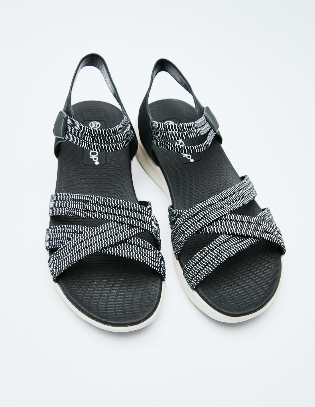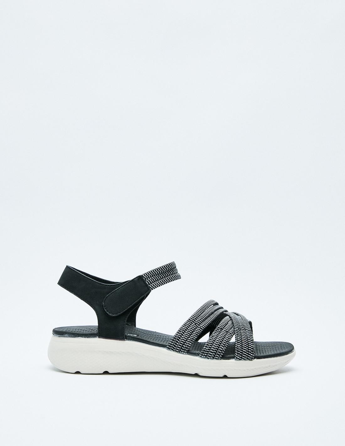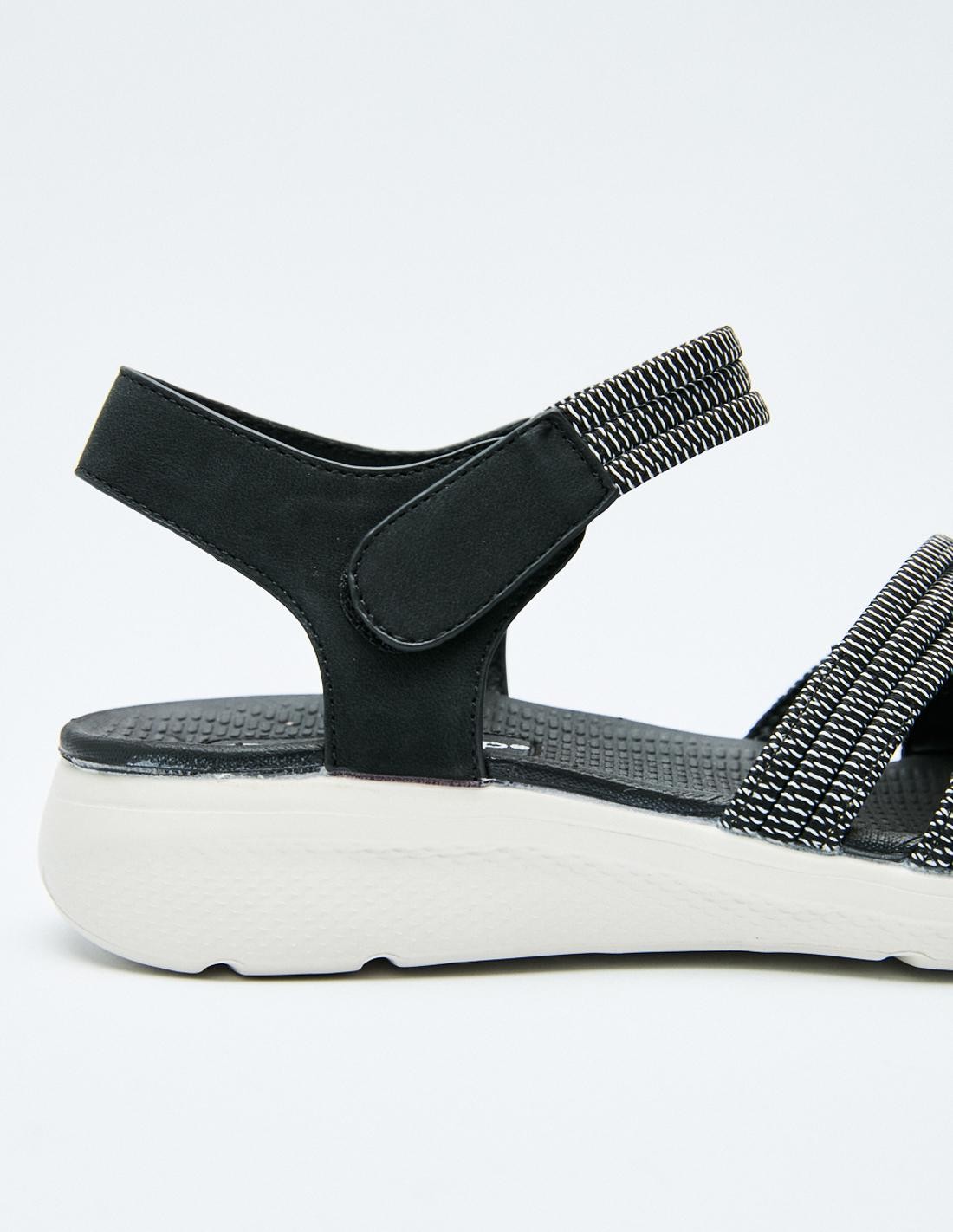Sandalia plana con tiras finas y gruesas mediante combinación de material. Cierre mediante velcro en la parte trasera.