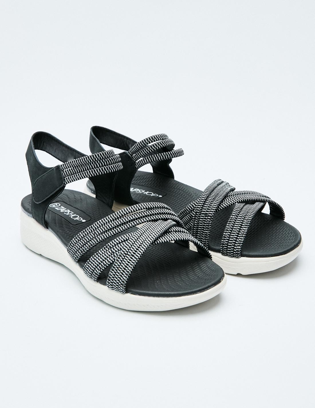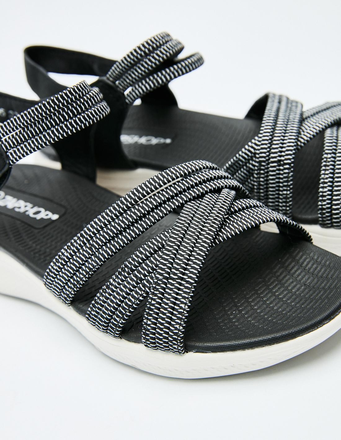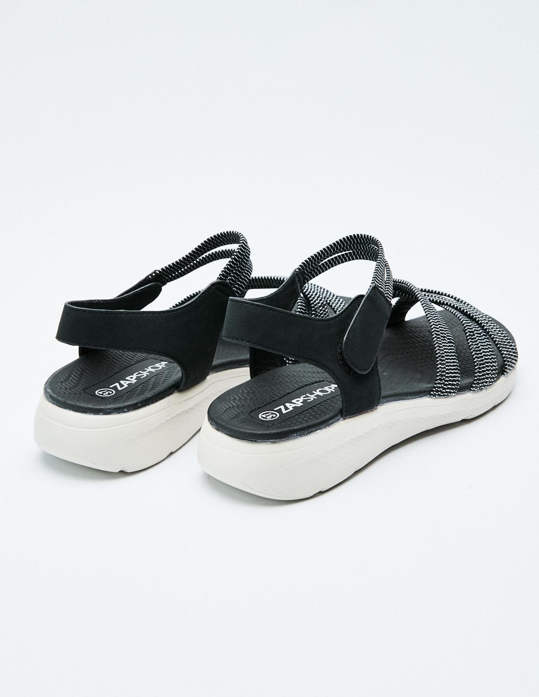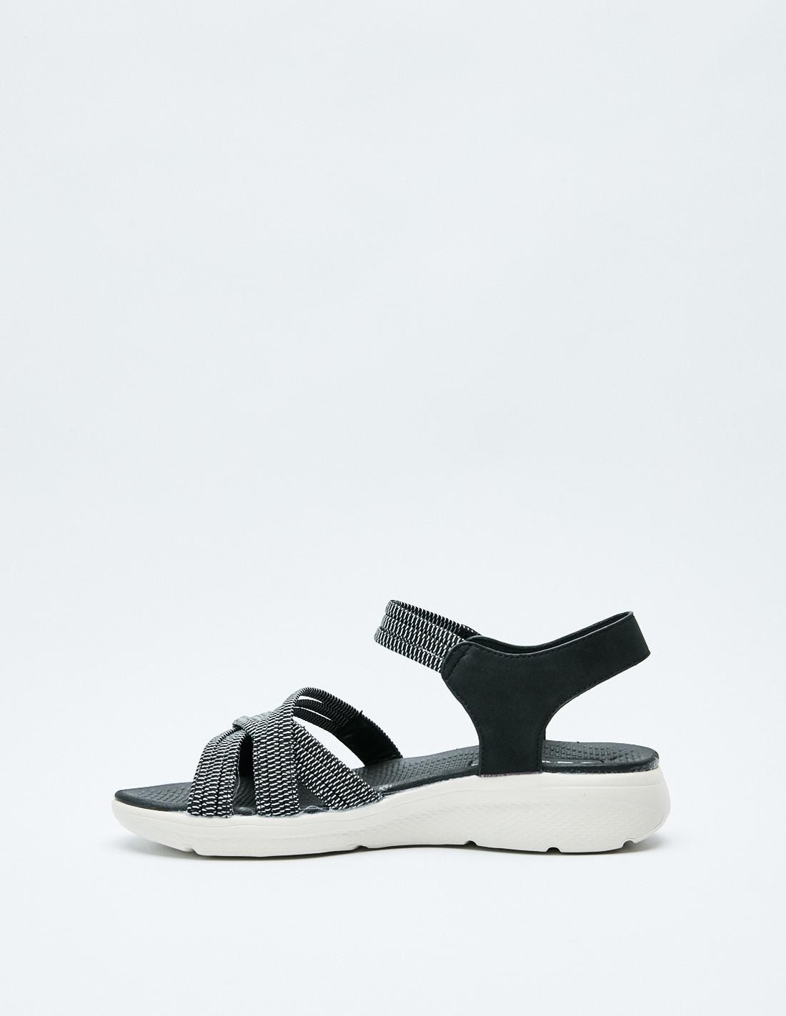 Sandalia plana con tiras finas y gruesas mediante combinación de material. Cierre mediante velcro en la parte trasera.