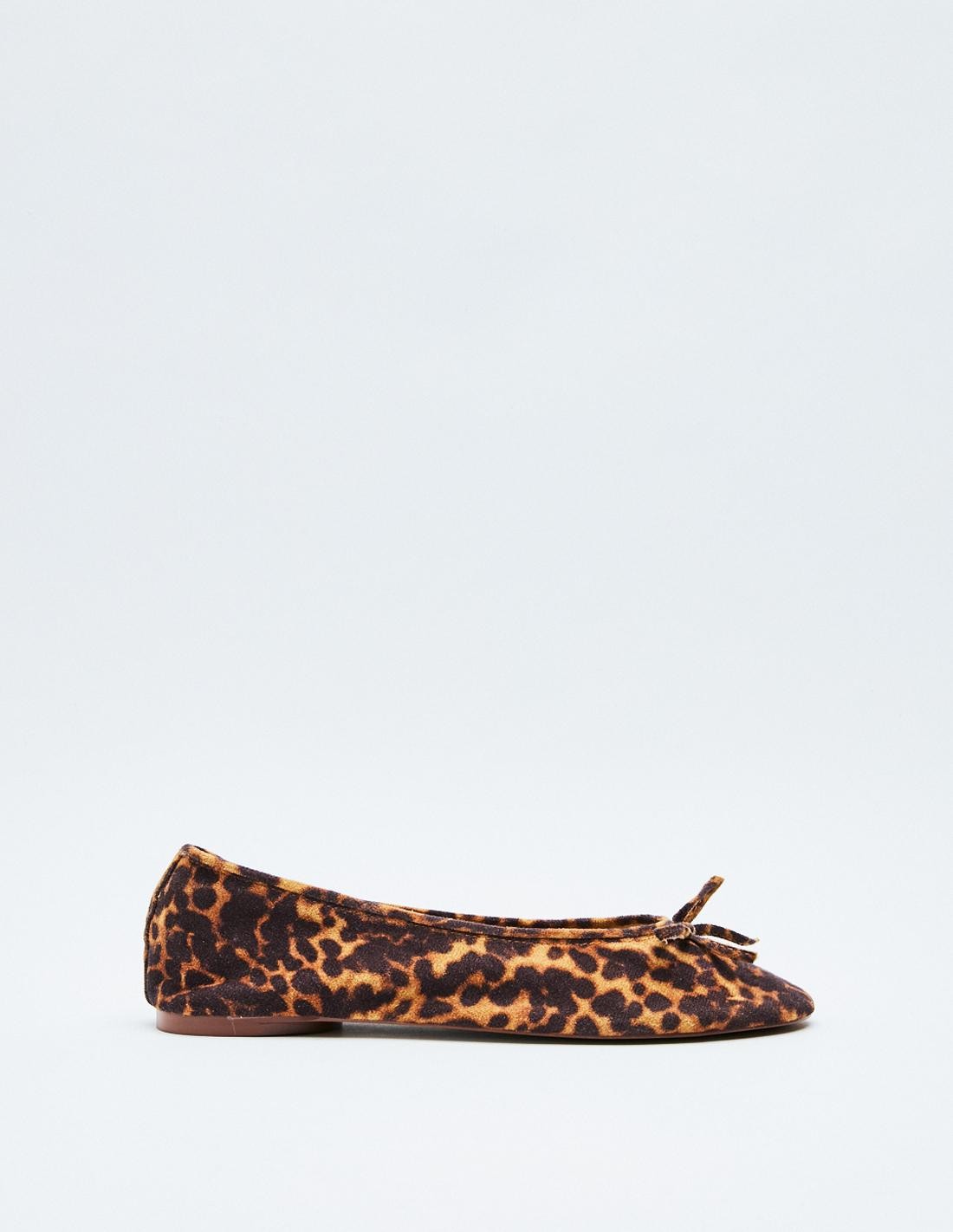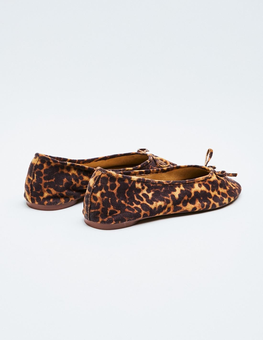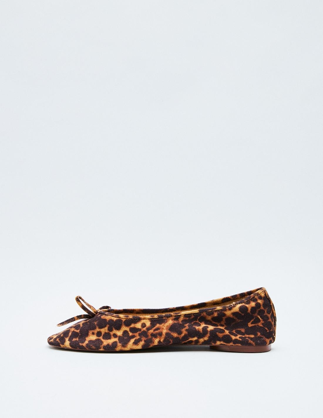 Zapato plano tipo bailarina en efecto serraje . Estampado animal. Detalle de pespunte en corte. Acabado en punta redonda.