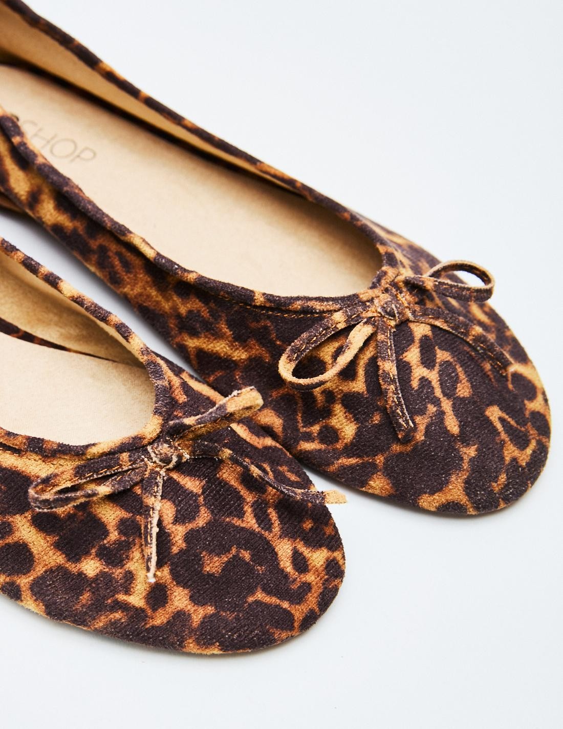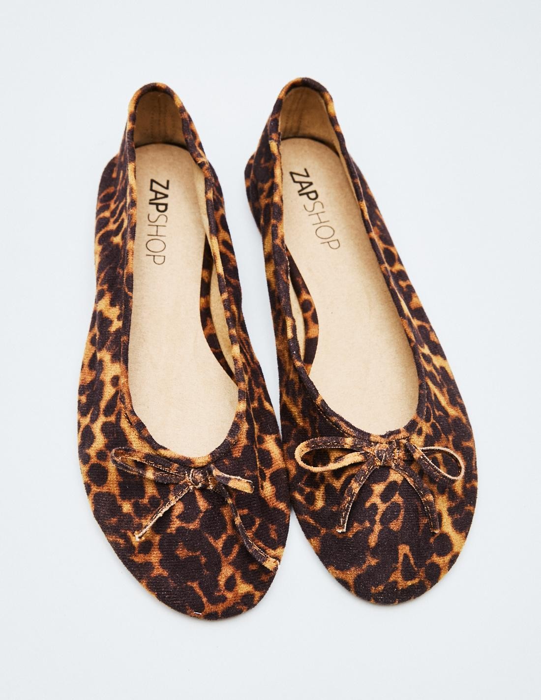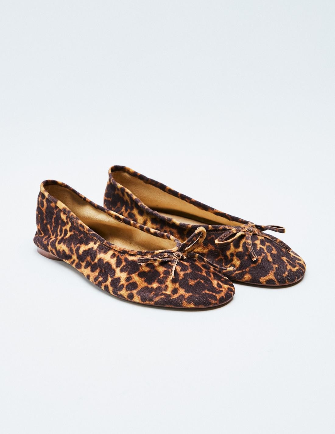 Zapato plano tipo bailarina en efecto serraje . Estampado animal. Detalle de pespunte en corte. Acabado en punta redonda.