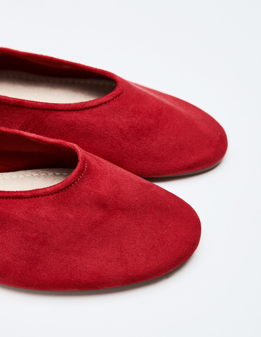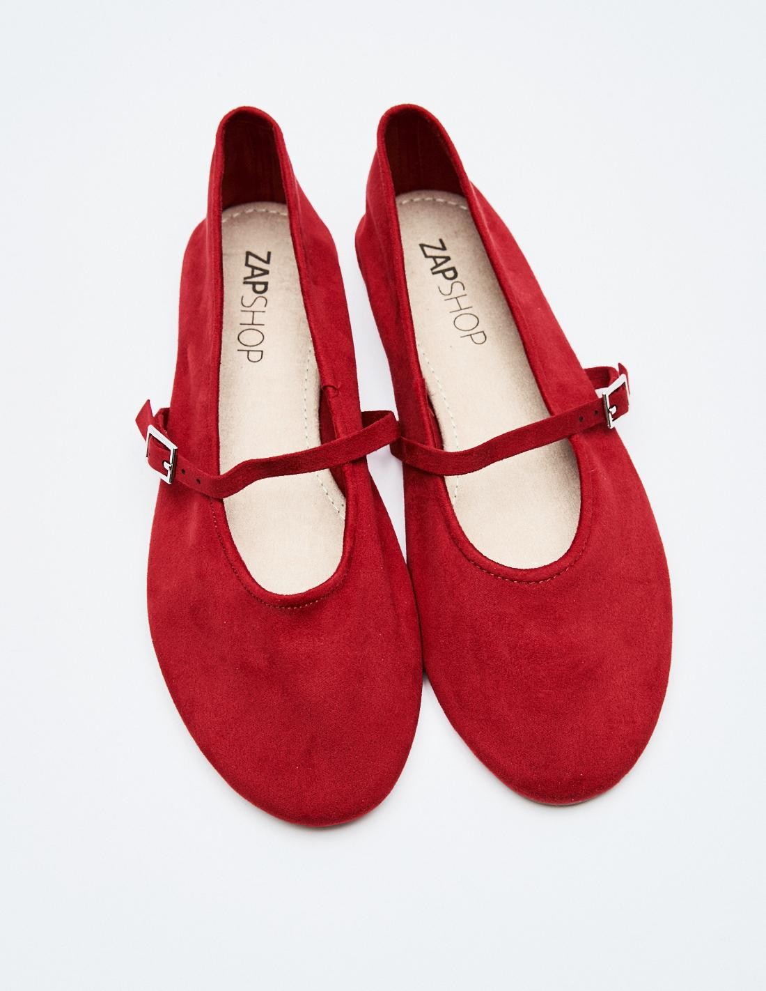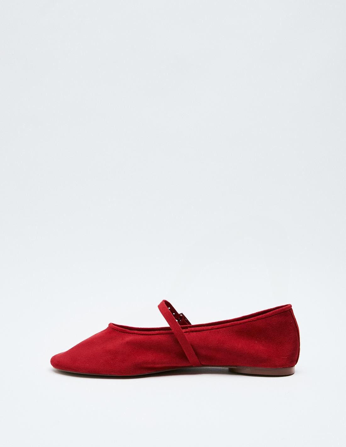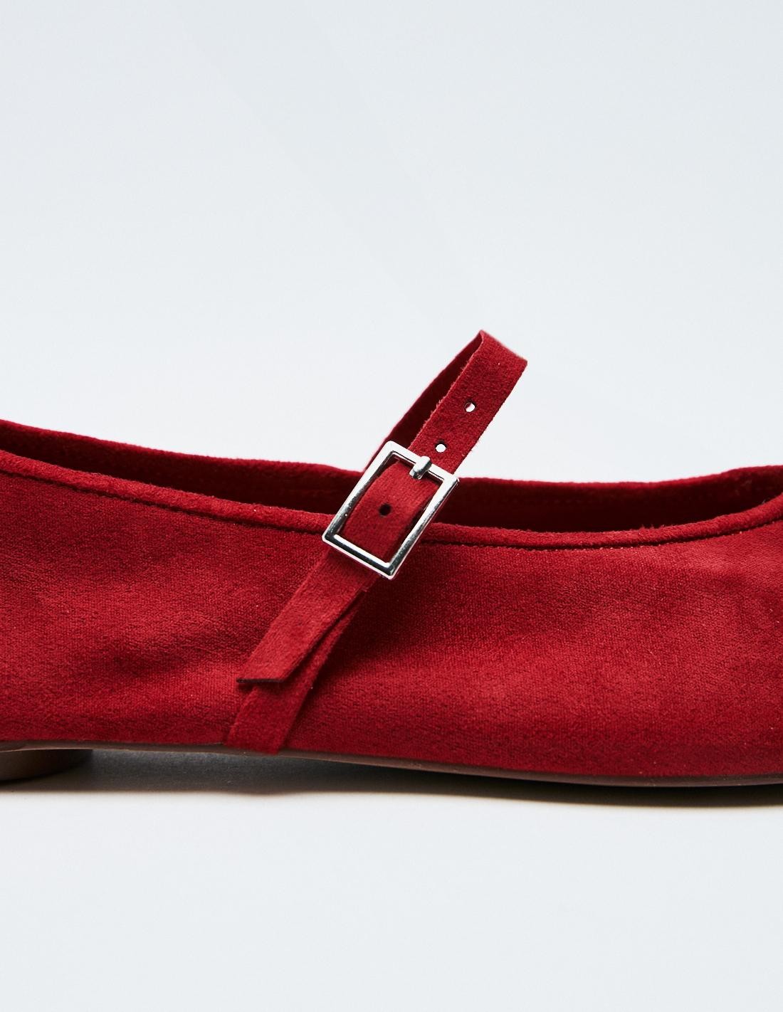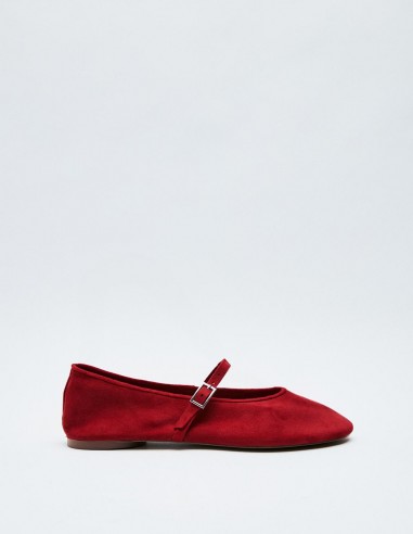 Zapato tipo bailarina en efecto serraje. Tira con hebilla en la parte delantera. Acabado en punta. Altura de la suela: 0,5 cm