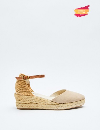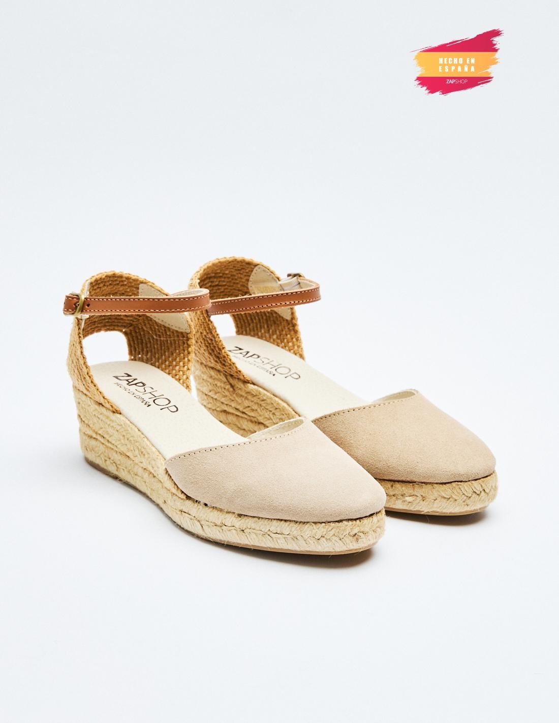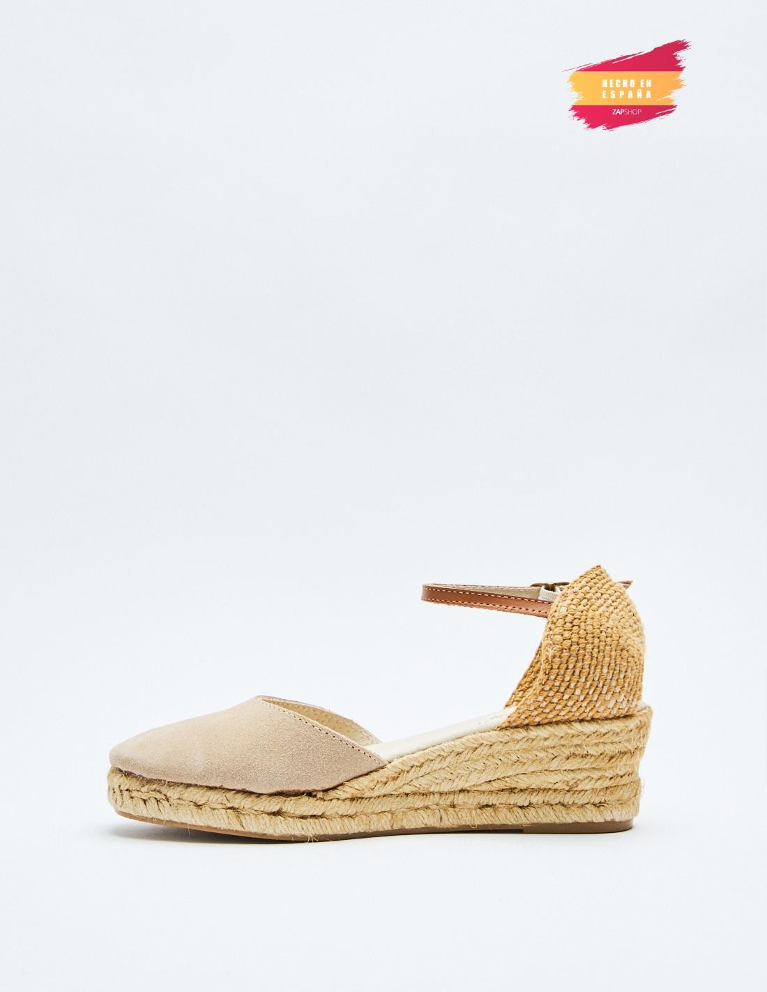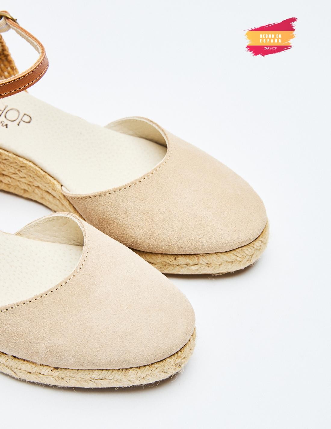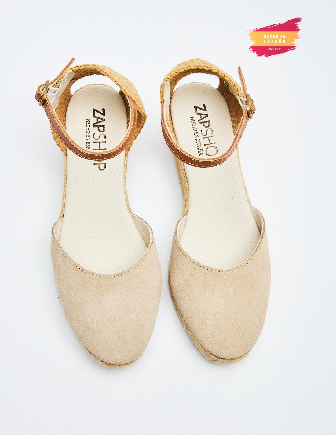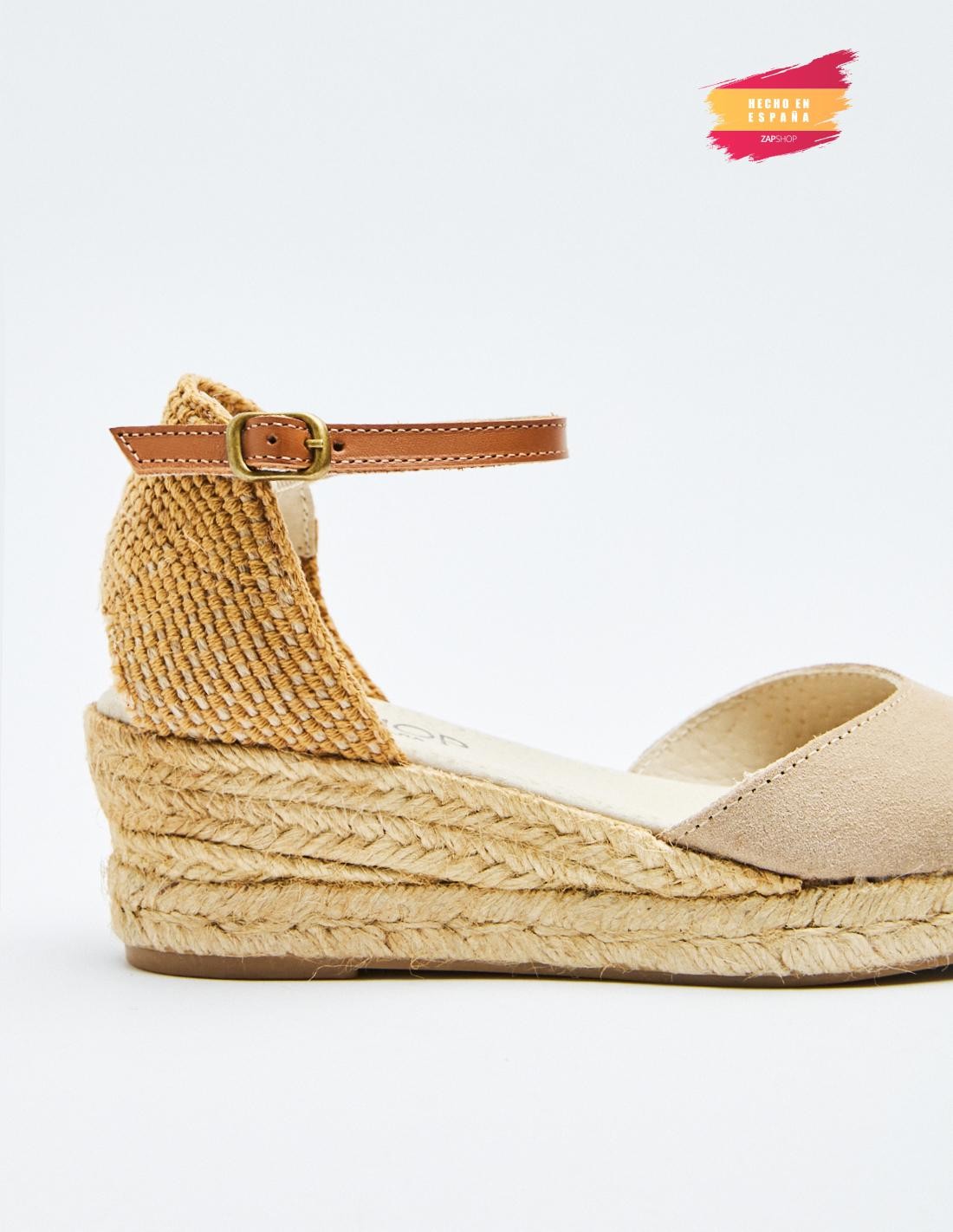 Zapato destalonado con tacón tipo cuña en tejido piel. Cierre mediante hebilla en la pulsera al tobillo. Altura del tacón: 5 cm.