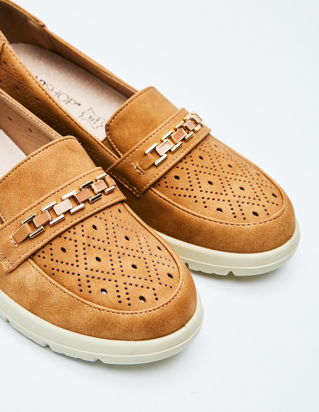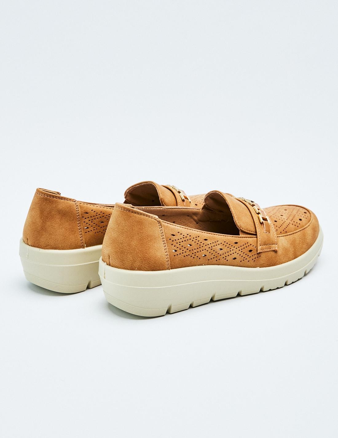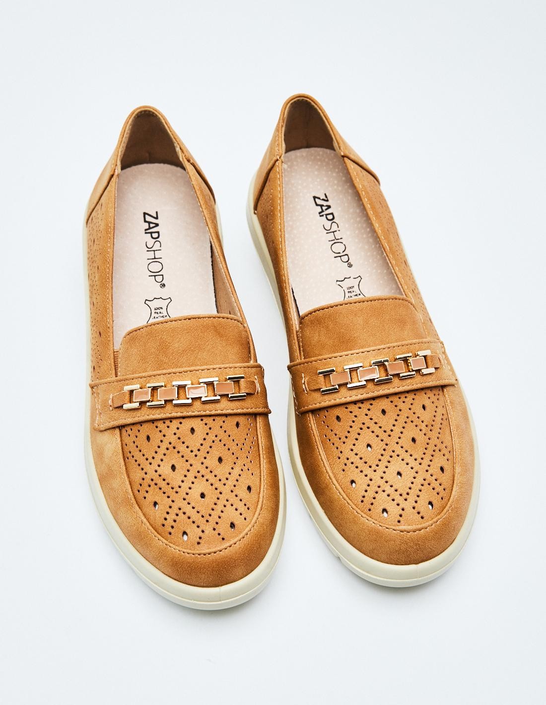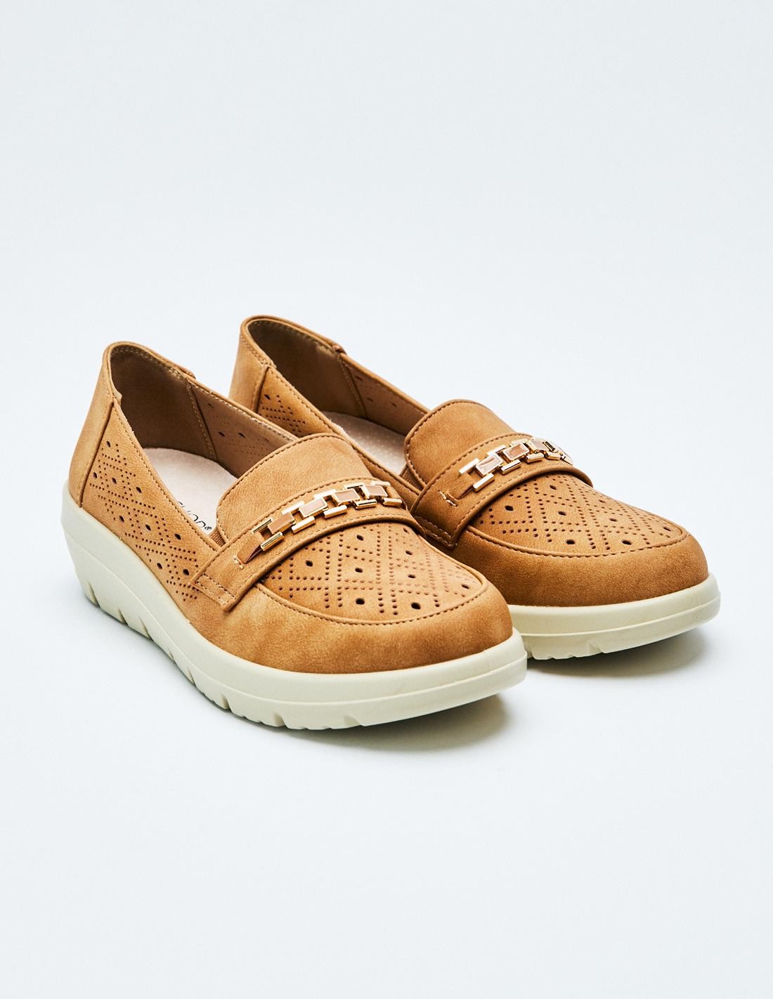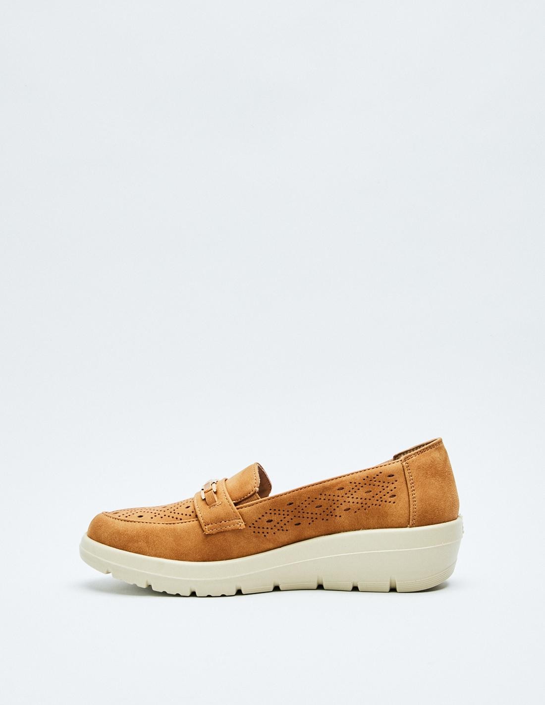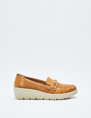 Zapato tipo mocasín en efecto piel mercedita. Modelo ancho y suave para mayor comodidad . Acabado en punta redonda . Suela dentada