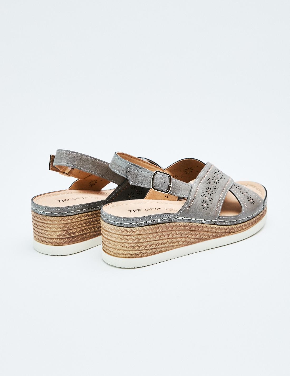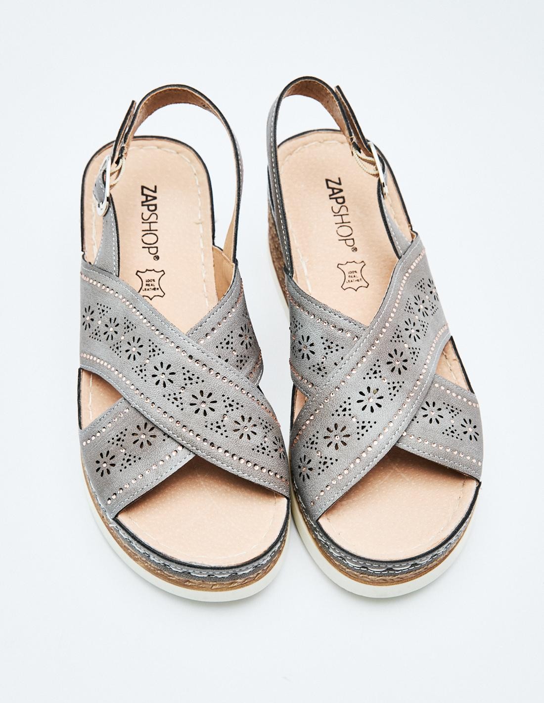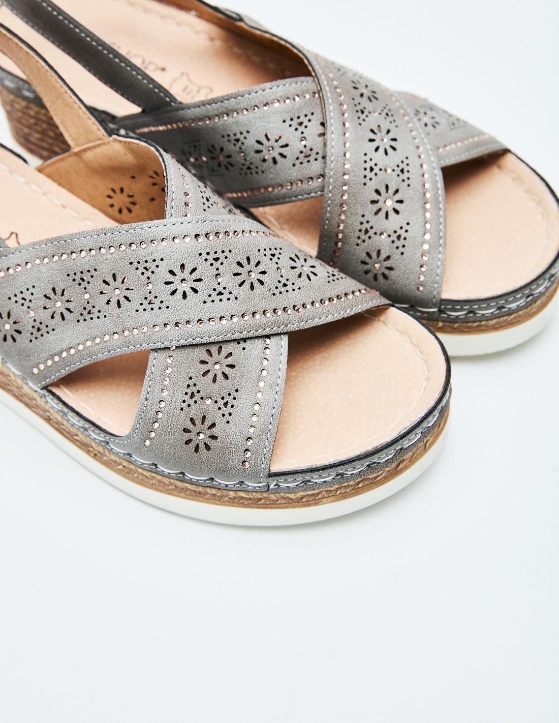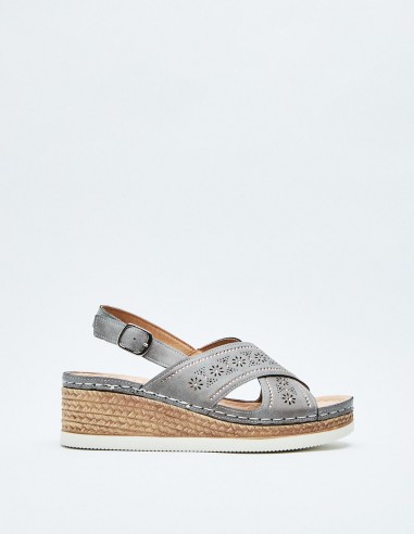 Sandalia plana con tiras anchas cruzadas. Acabada en punta redonda. Altura de la suela: 5,6 cm.