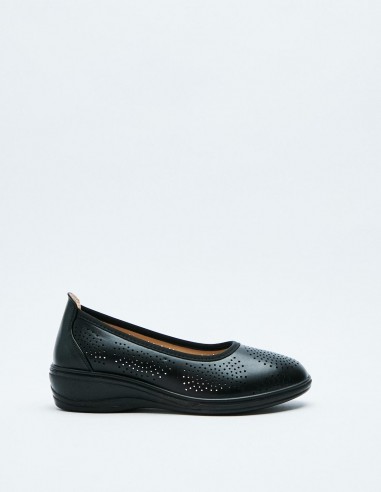 Zapato tipo mocasín en efecto piel mercedita. Modelo ancho y suave para mayor comodidad . Acabado en punta redonda . Suela tipo cuña .