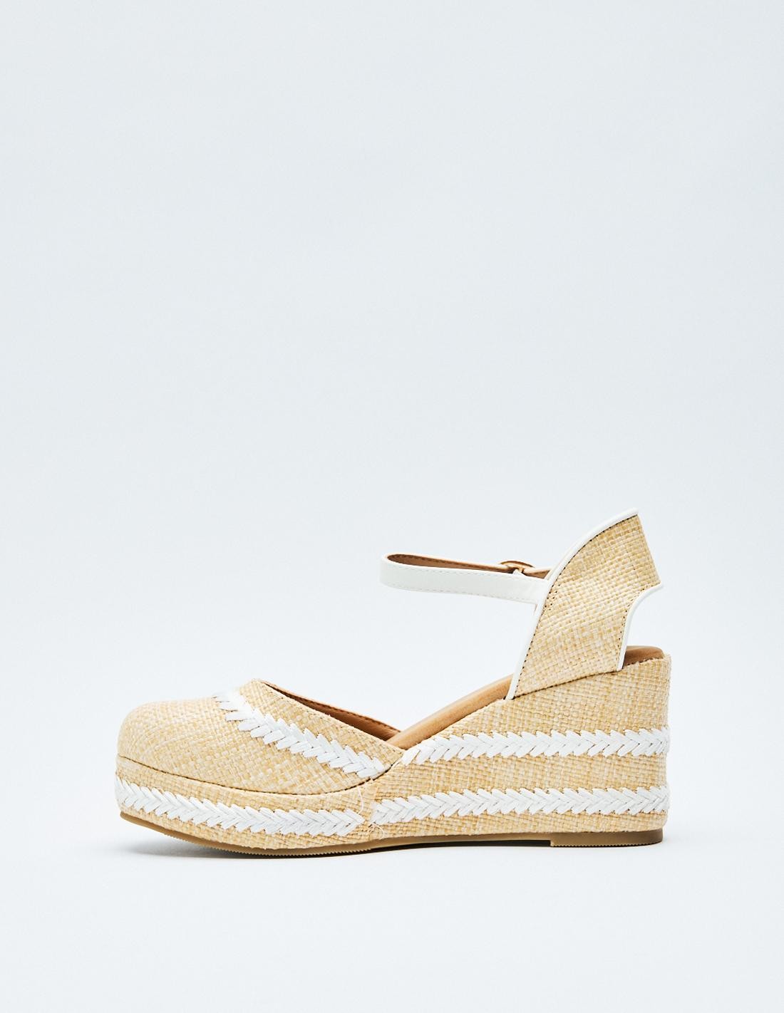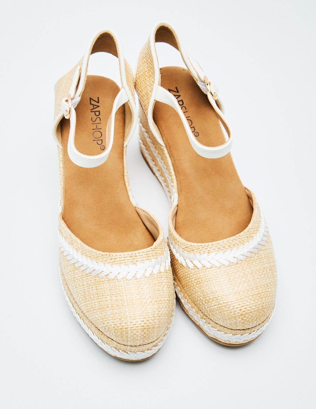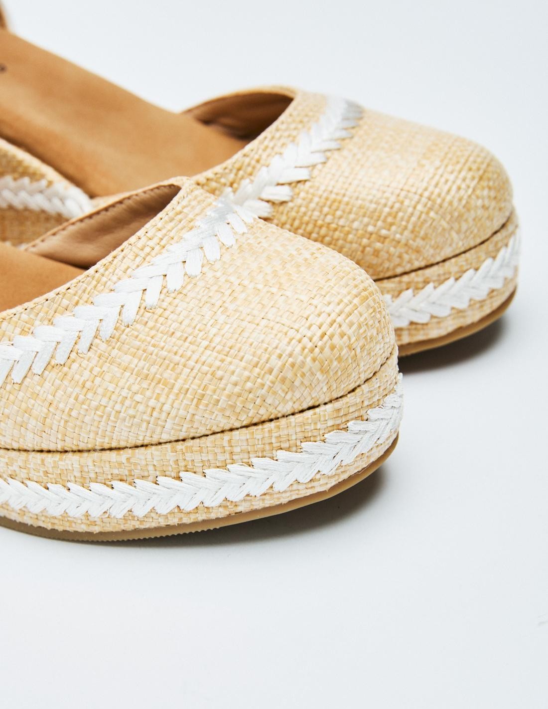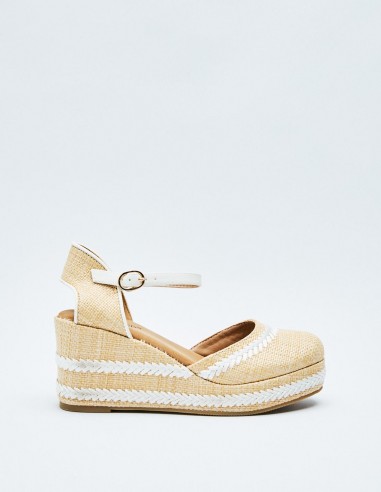 Zapato tipo alpargata en efecto tejido con bordado . Suela de yute en forma de cuña . Cierre mediante pulsera en el tobillo. Altura tacón : 6 cm