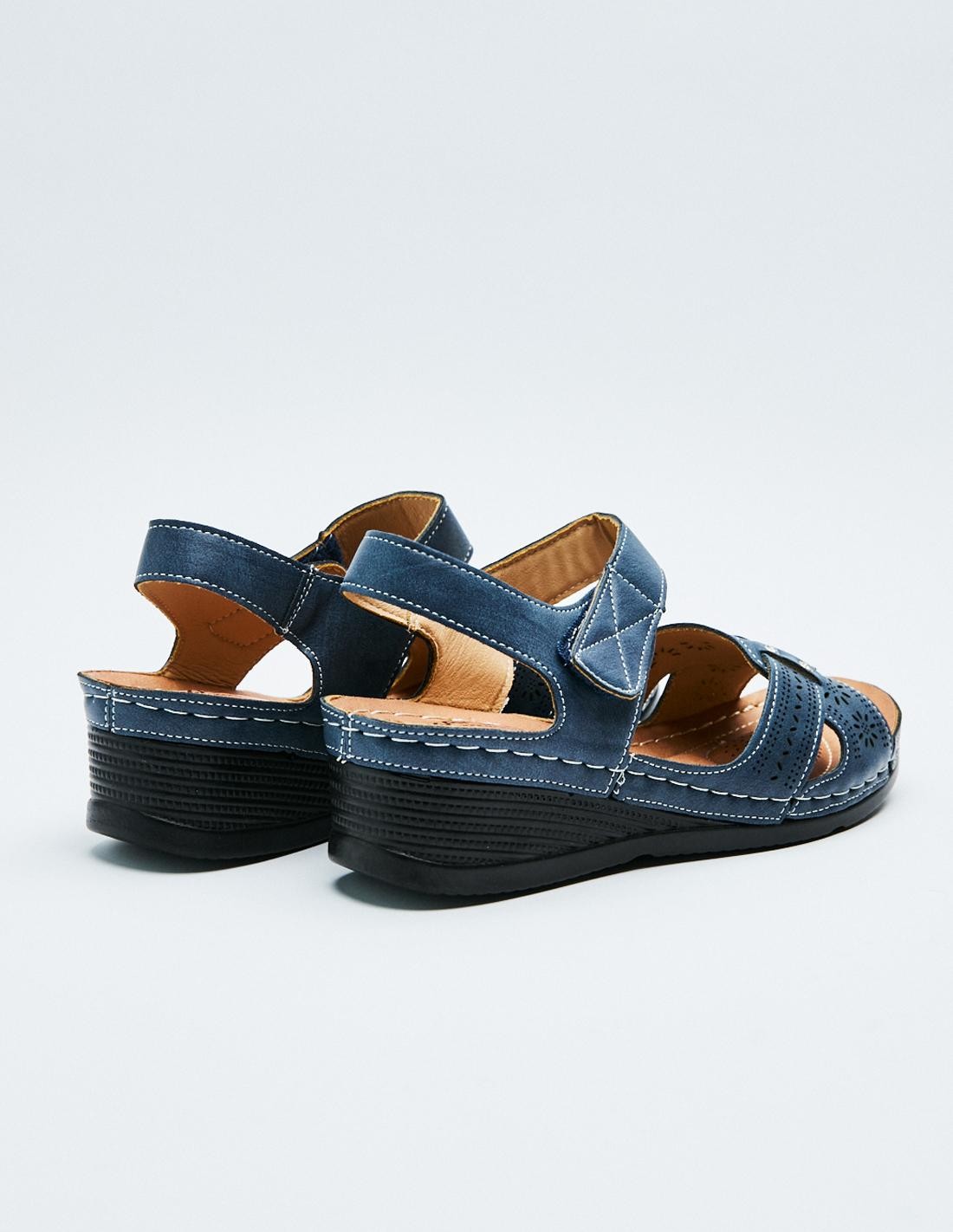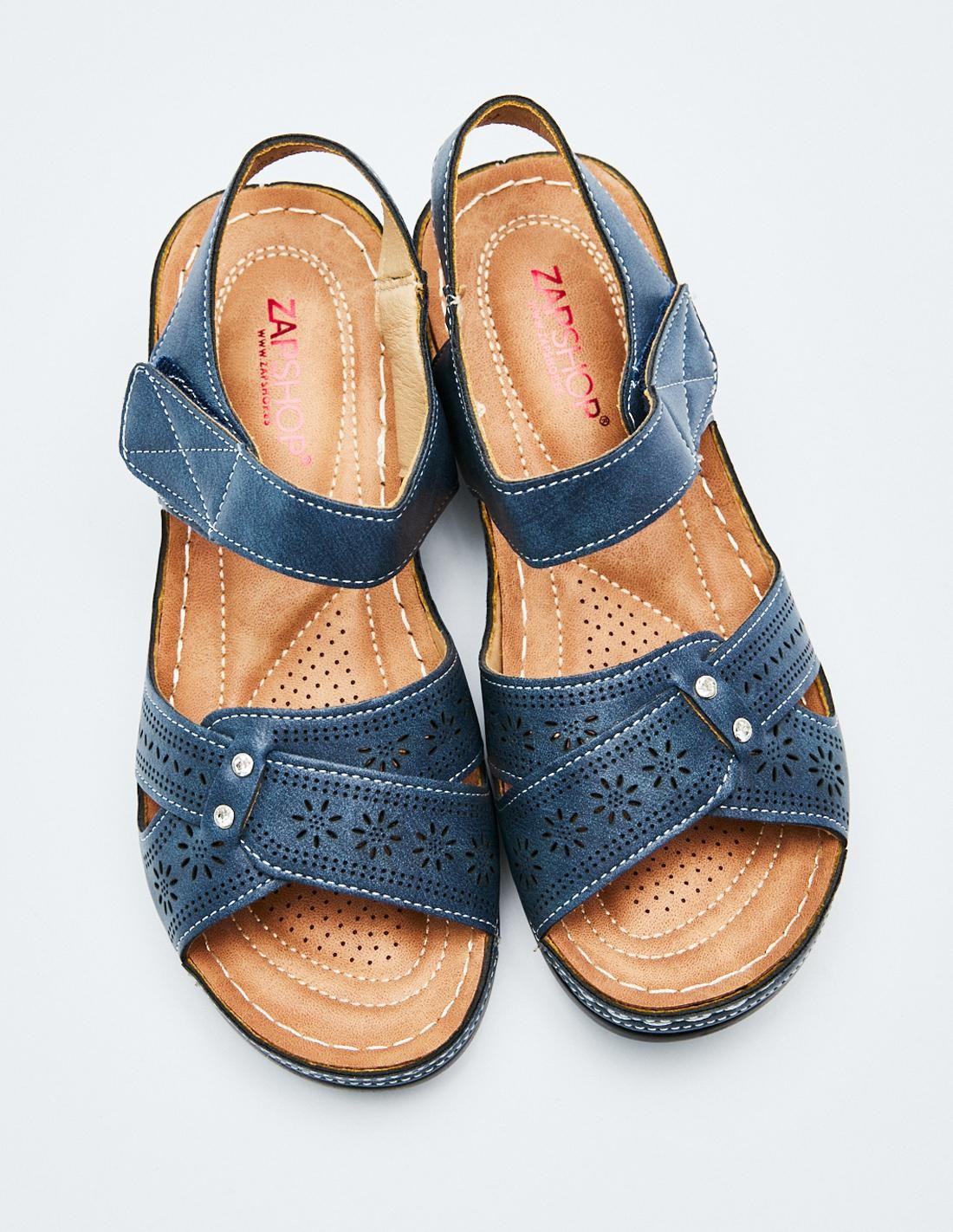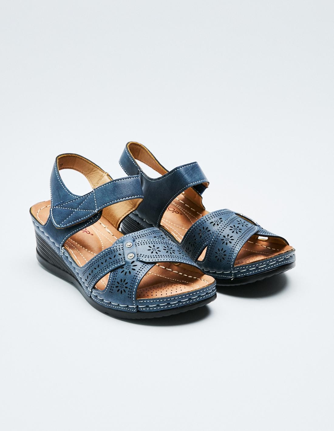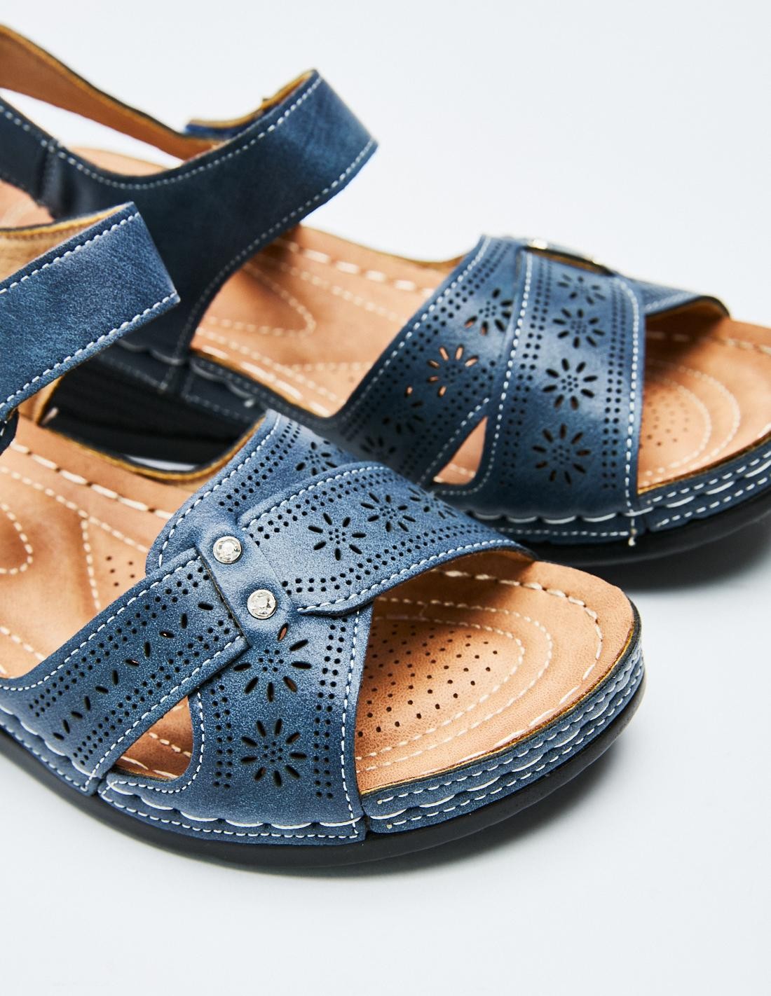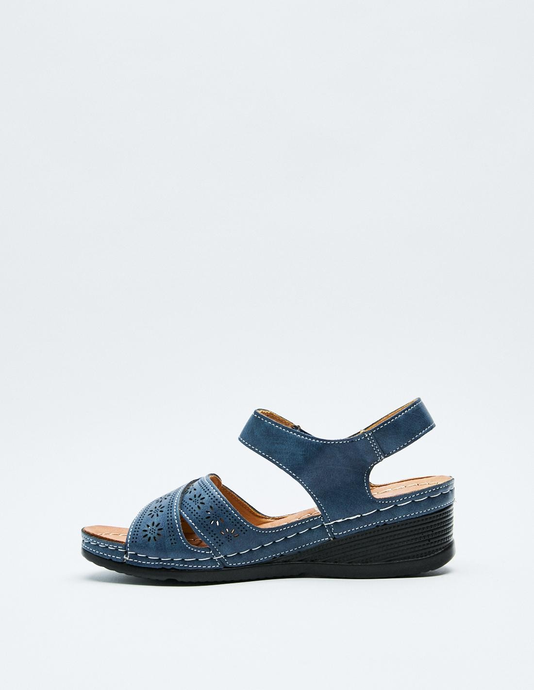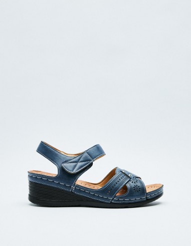 Sandalia plana en efecto piel con tira adhesivas trasera. Suela de goma combinada. Altura de la suela: 2,8 cm.