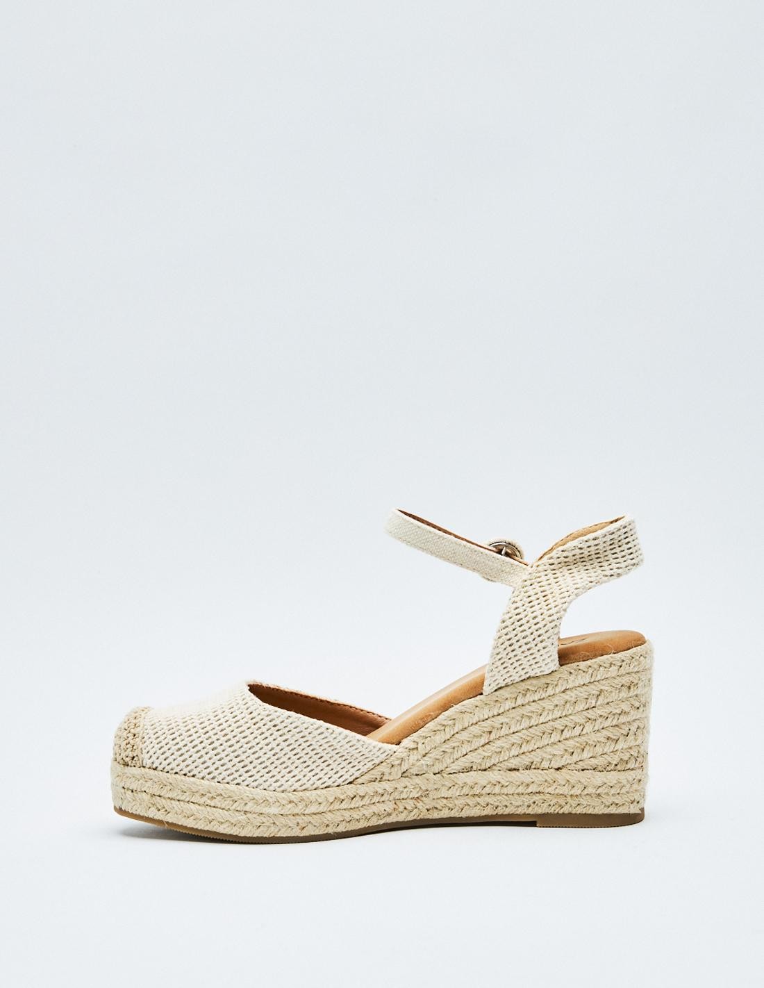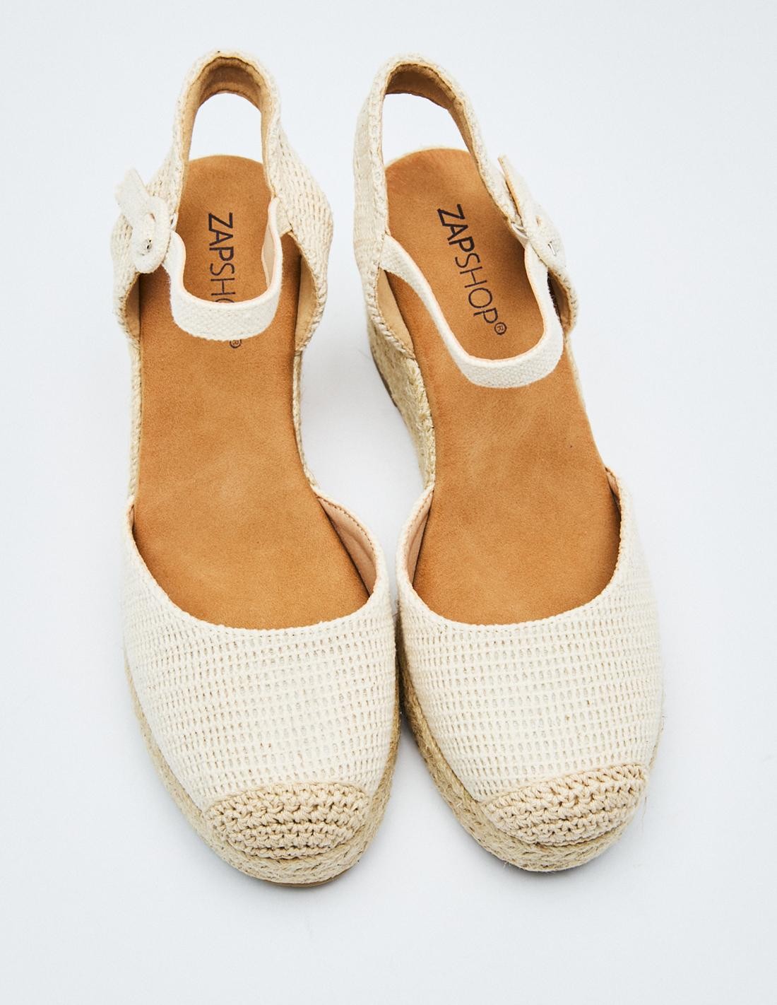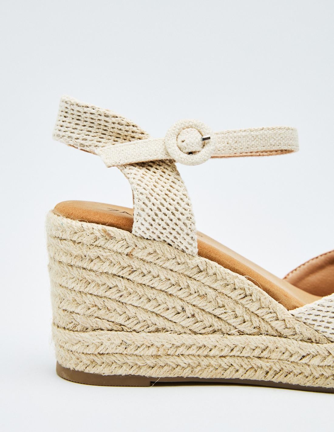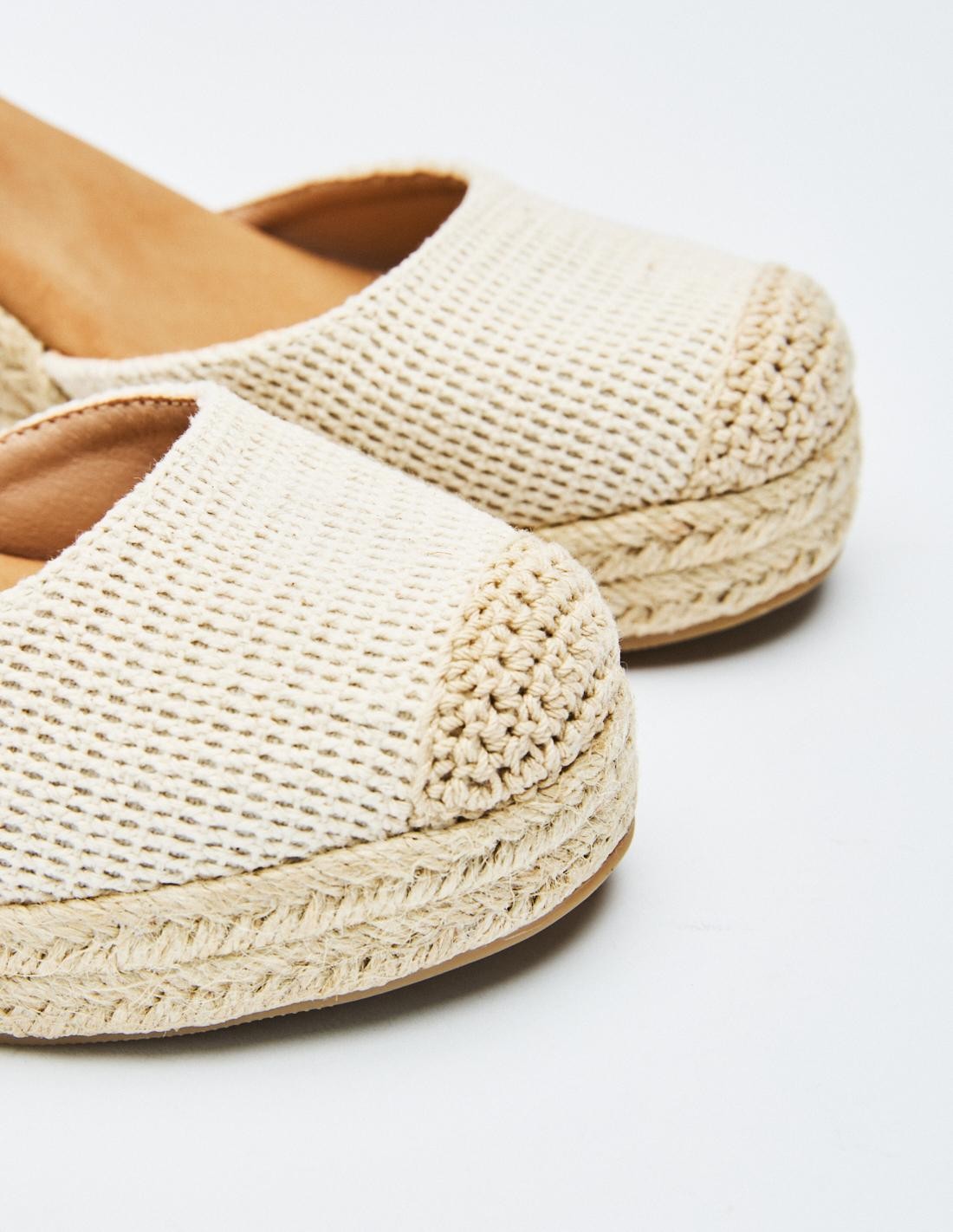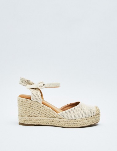 Zapato tipo alpargata en efecto crochet . Suela de yute en forma de cuña . Cierre mediante pulsera en el tobillo.