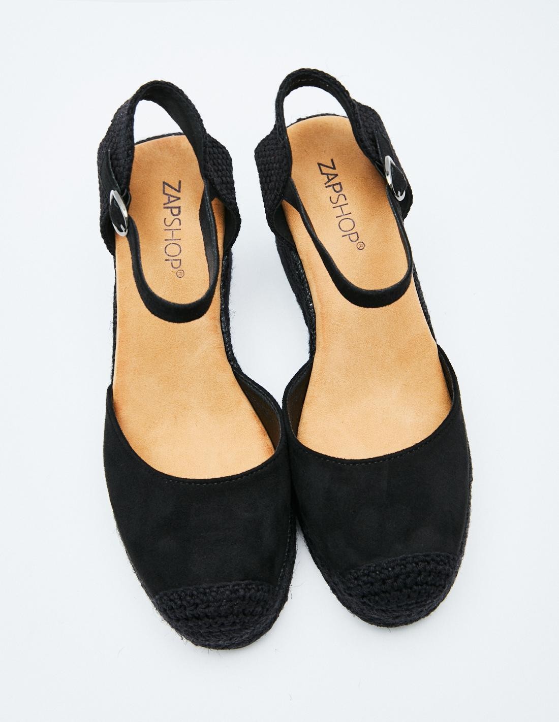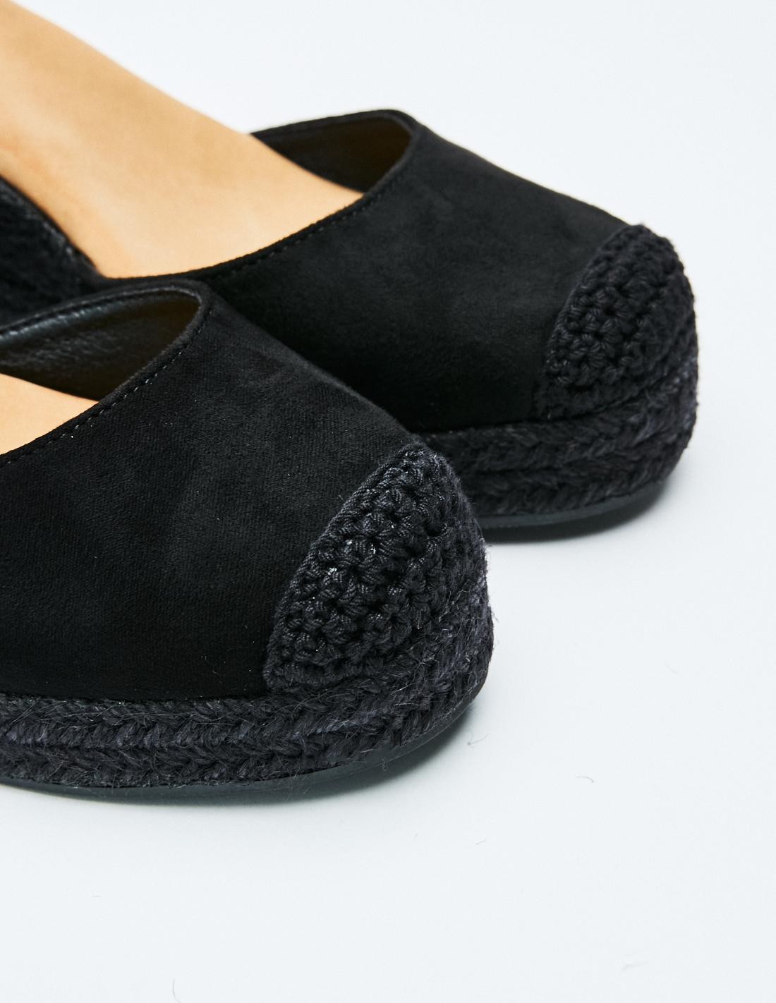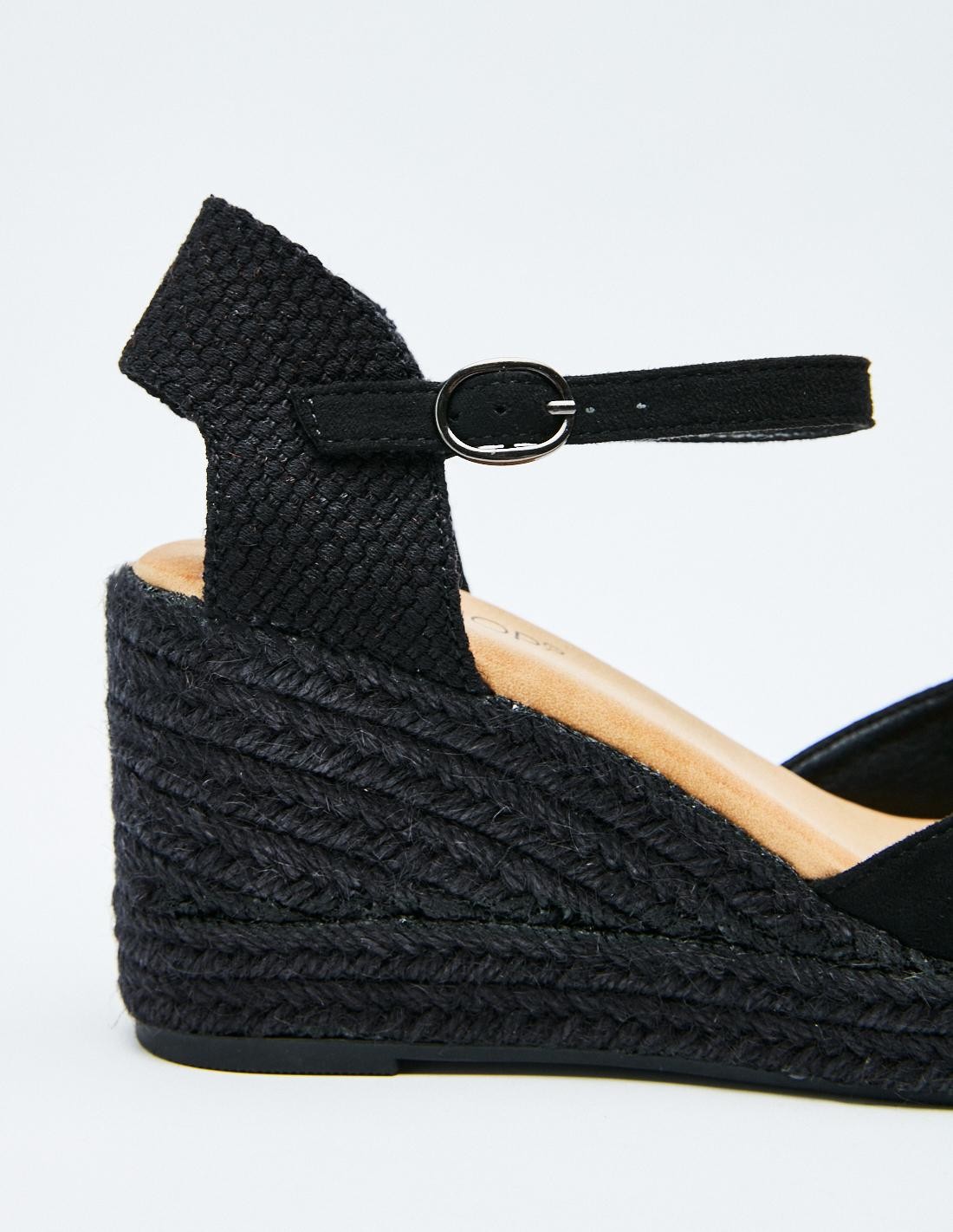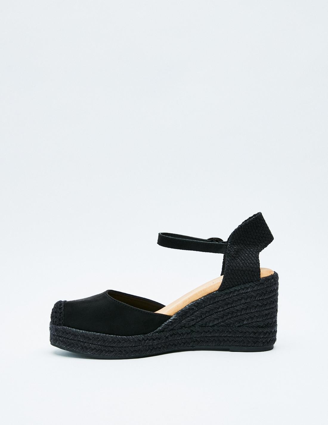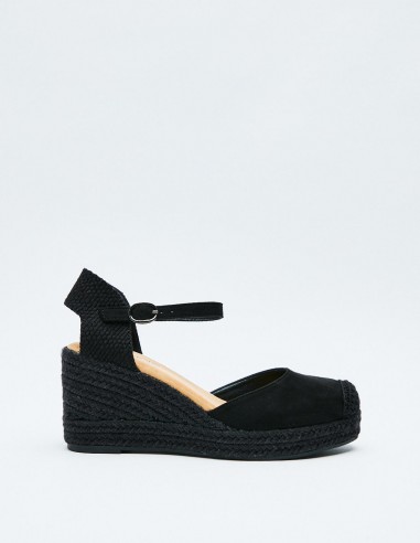 Zapato tipo alpargata en efecto serraje . Suela de yute en forma de cuña . Cierre mediante pulsera en el tobillo.