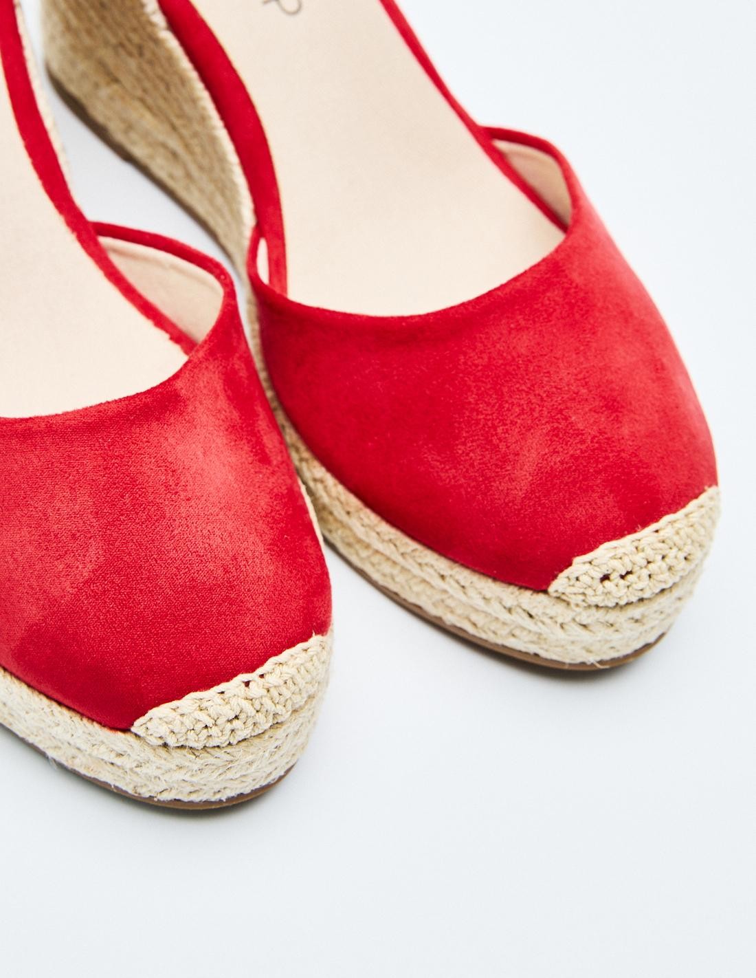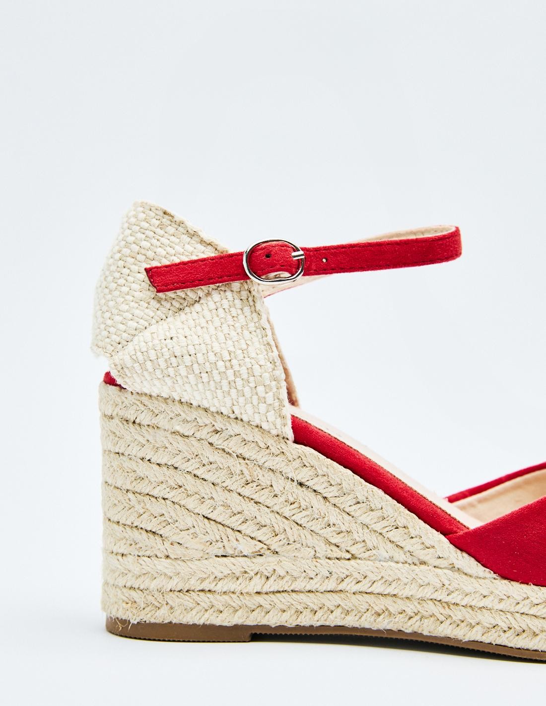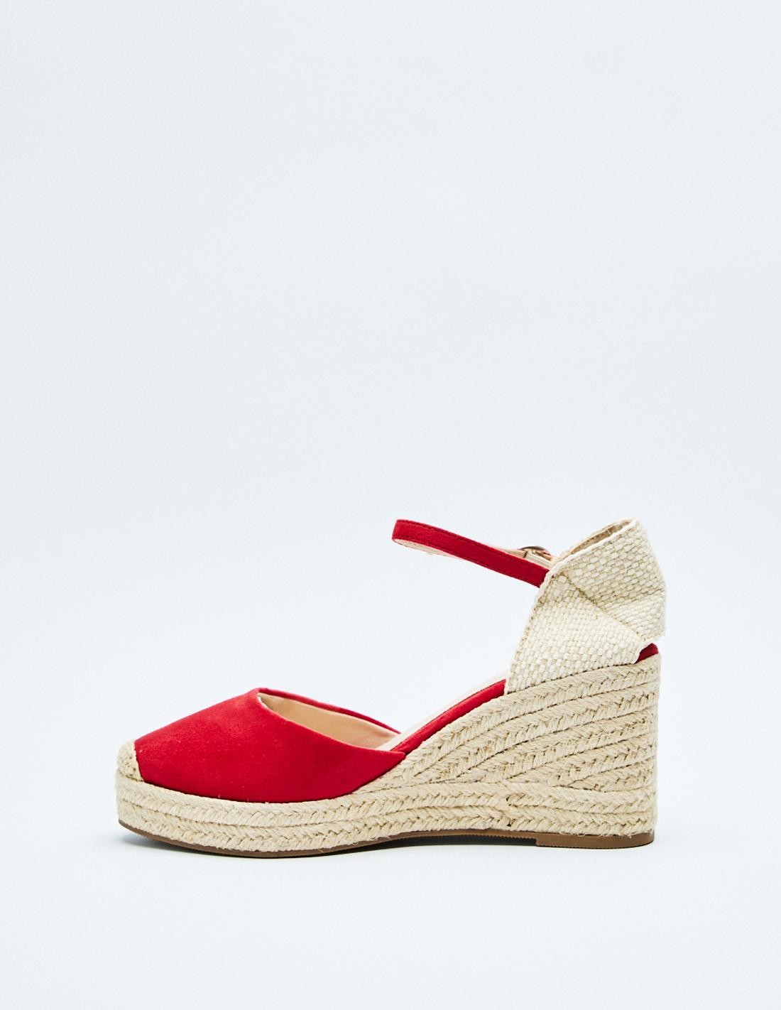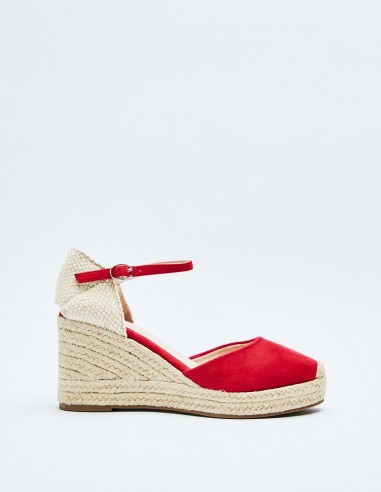 Zapato tipo alpargata en efecto serraje . Suela de yute en forma de cuña . Cierre mediante pulsera en el tobillo. Altura tacón : 6 cm