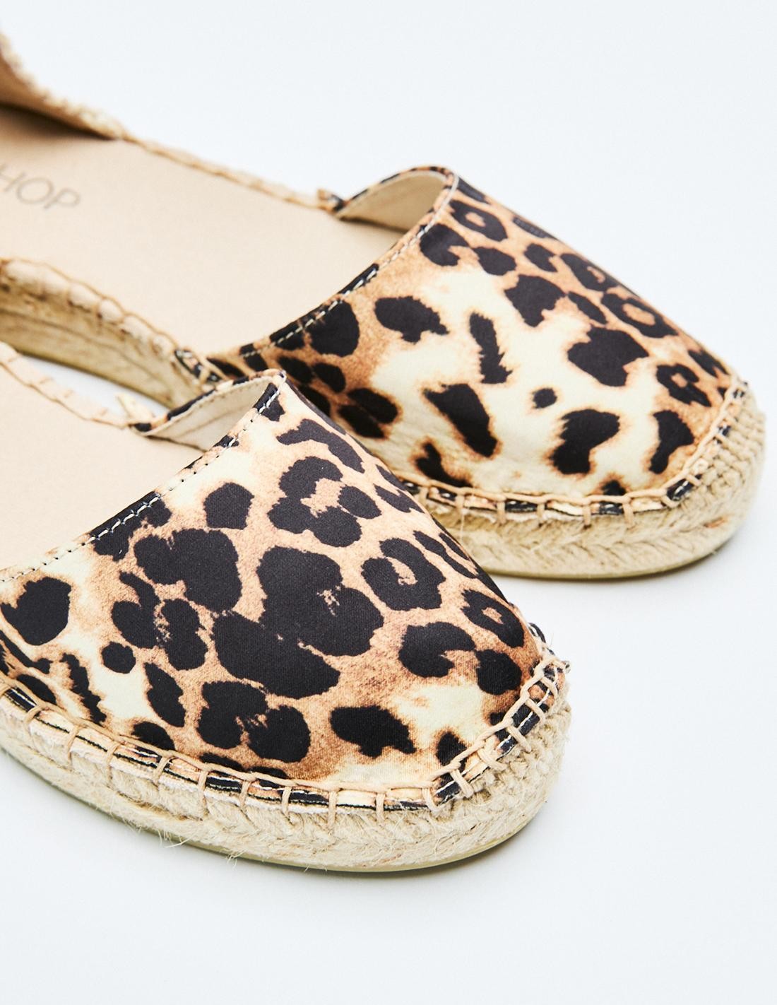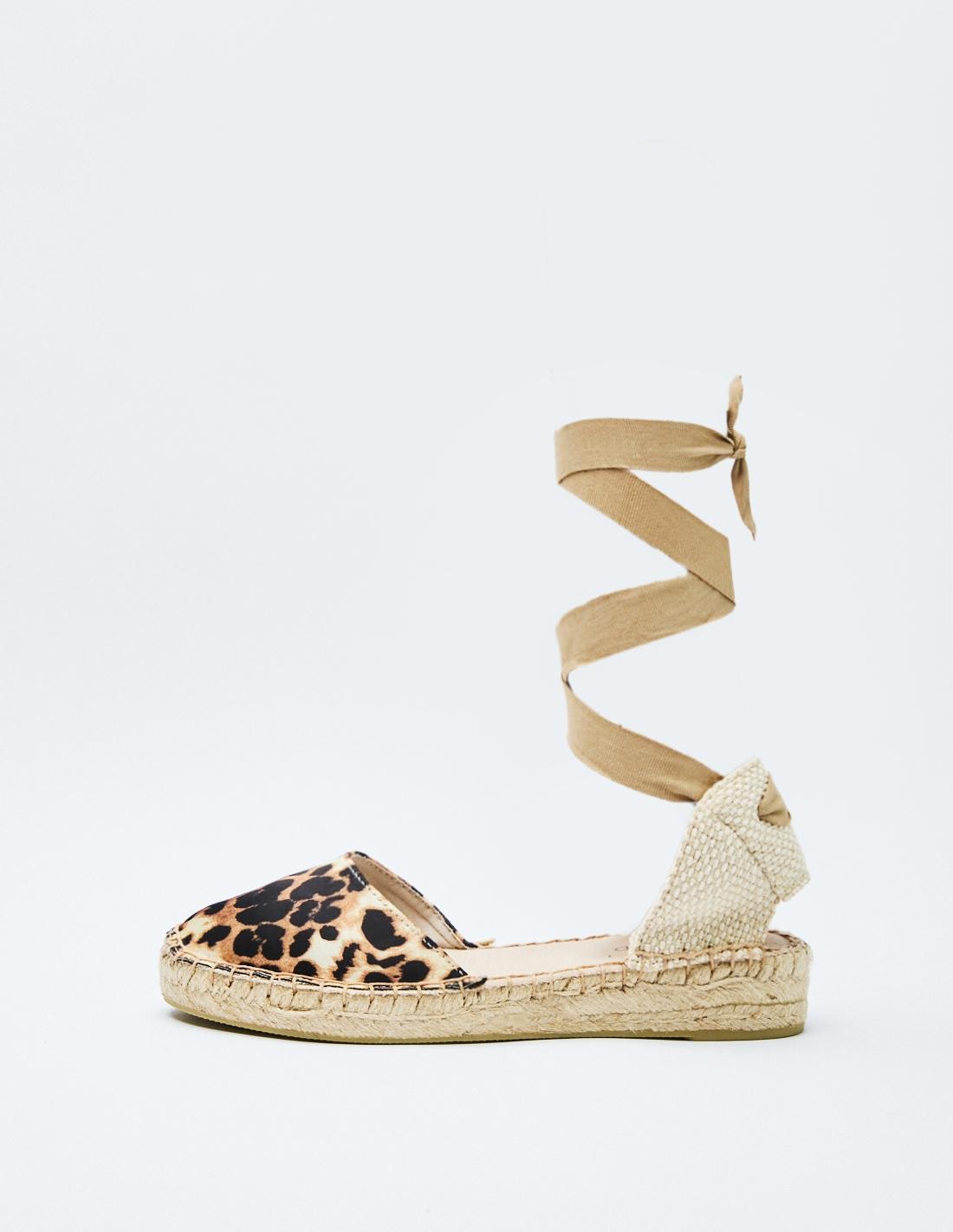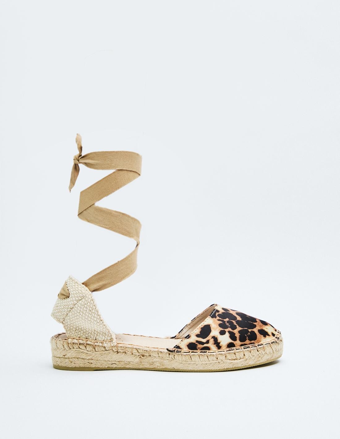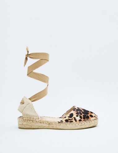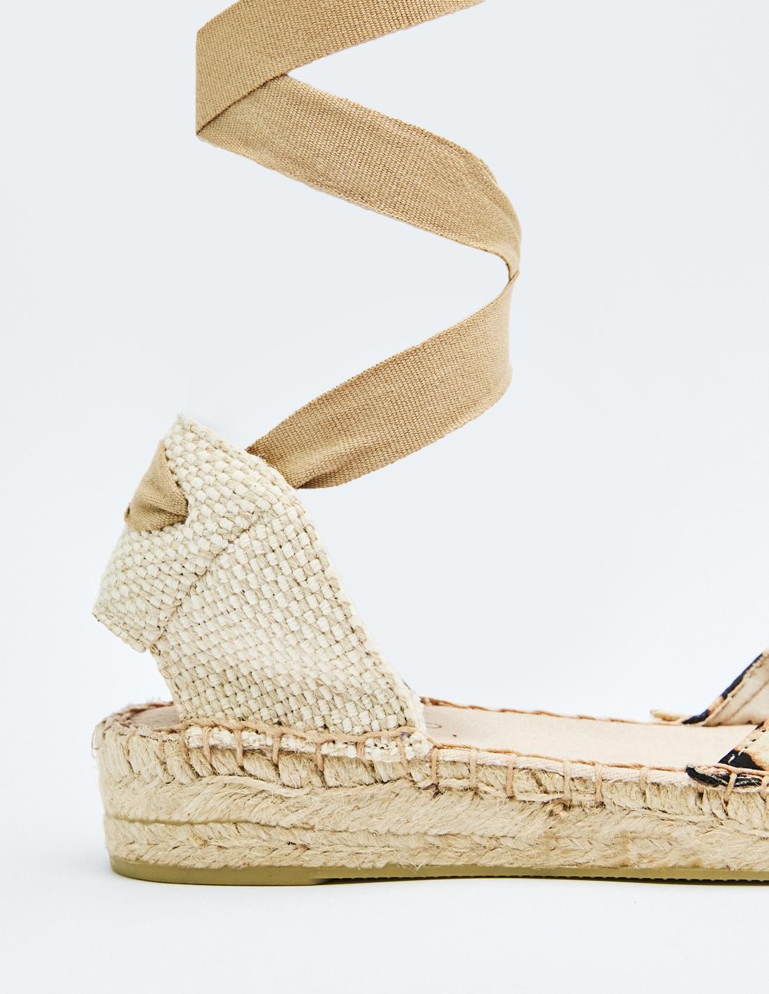 Zapato plano destalonado tipo alpargata. Parte delantera en efecto serraje . Tiras para atar al tobillo.