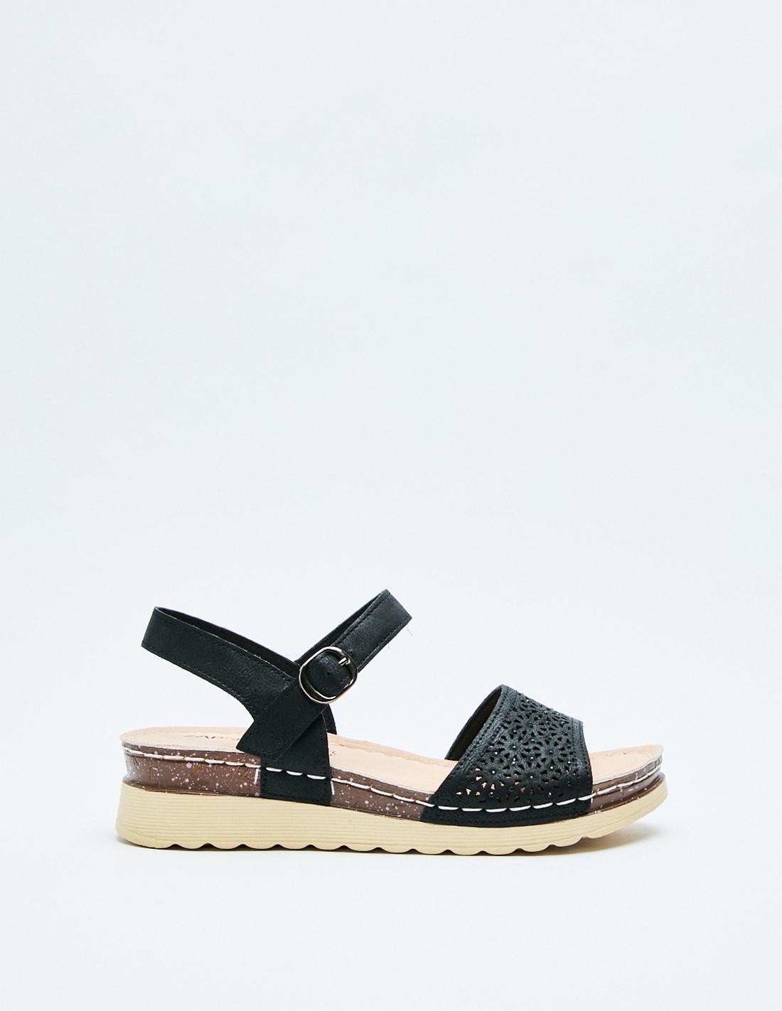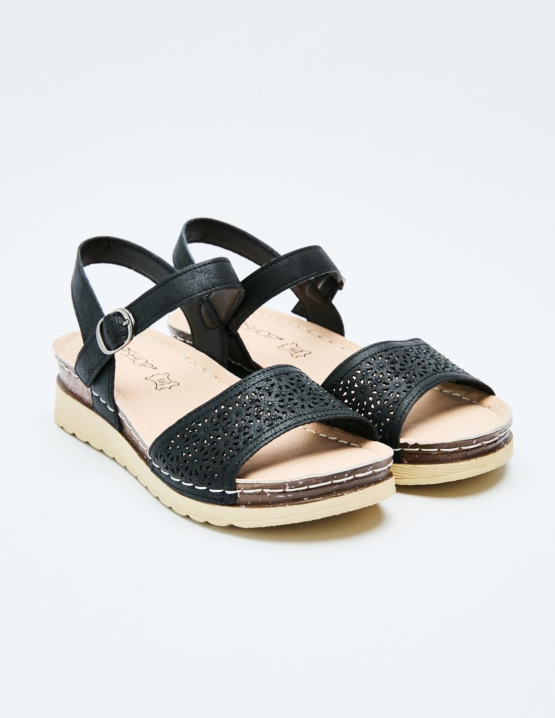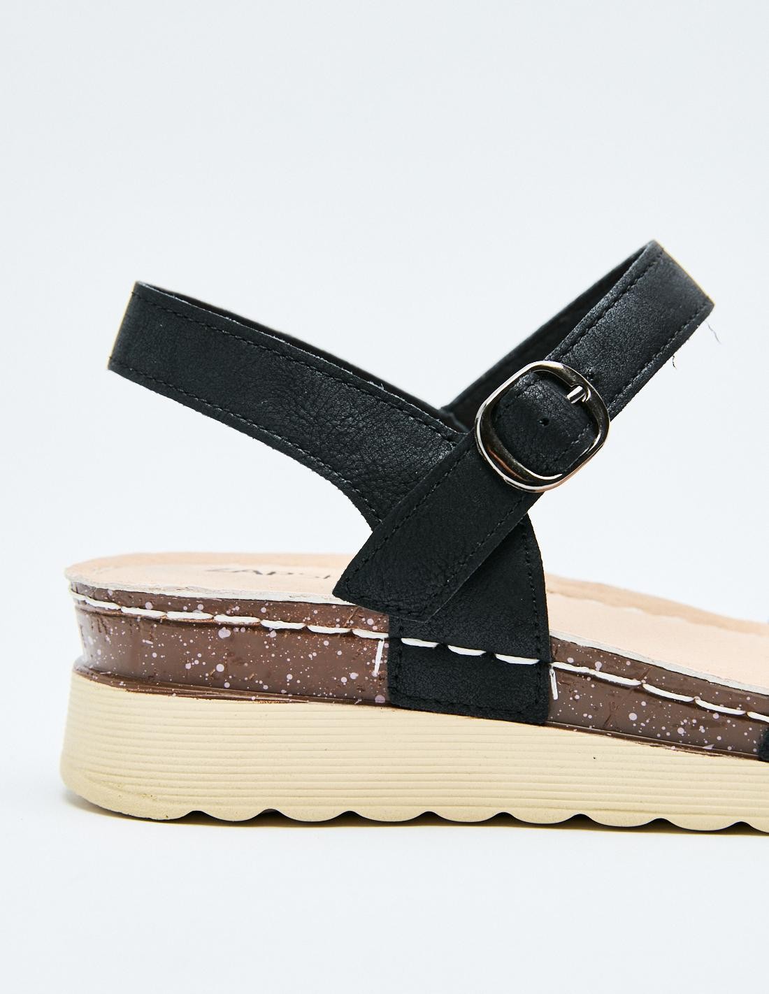 Sandalia plana en efecto piel . Suela de goma combinada. Cierre mediante pulsera en el tobillo. Altura de la suela: 2,8 cm.