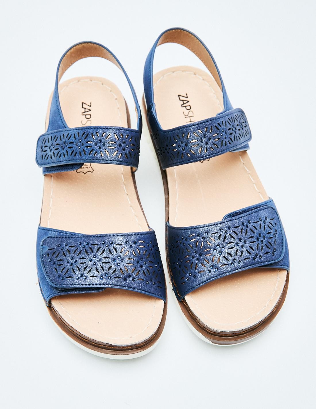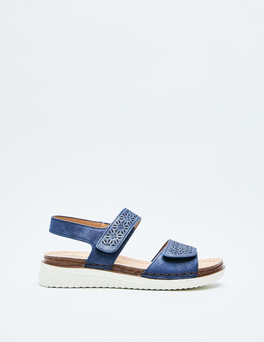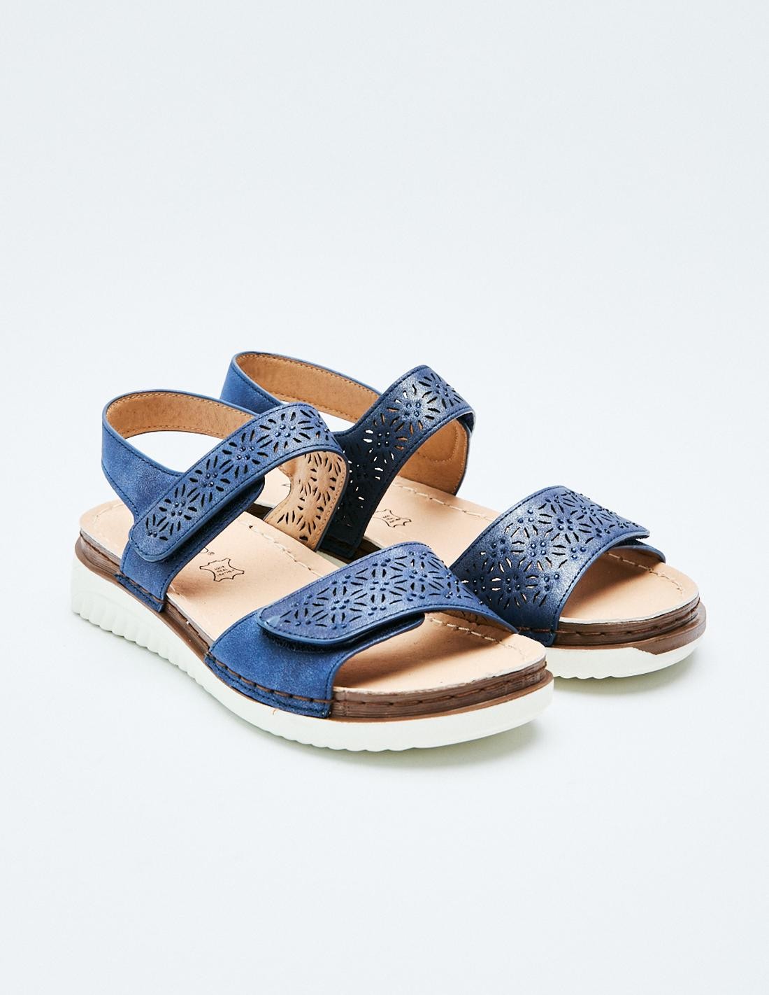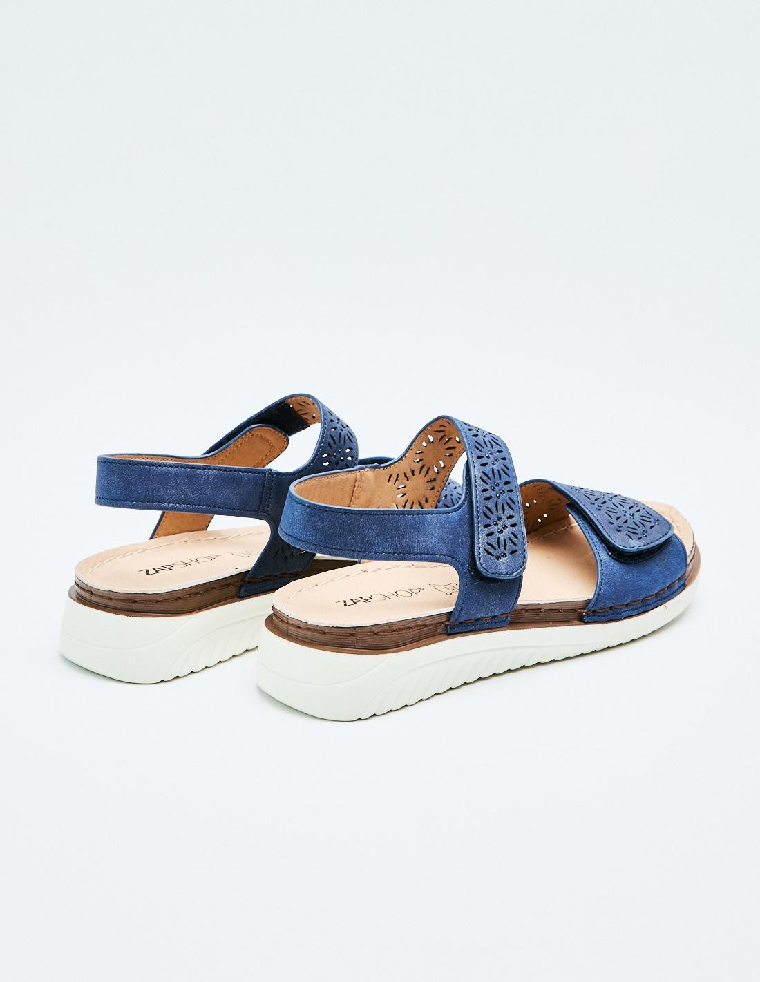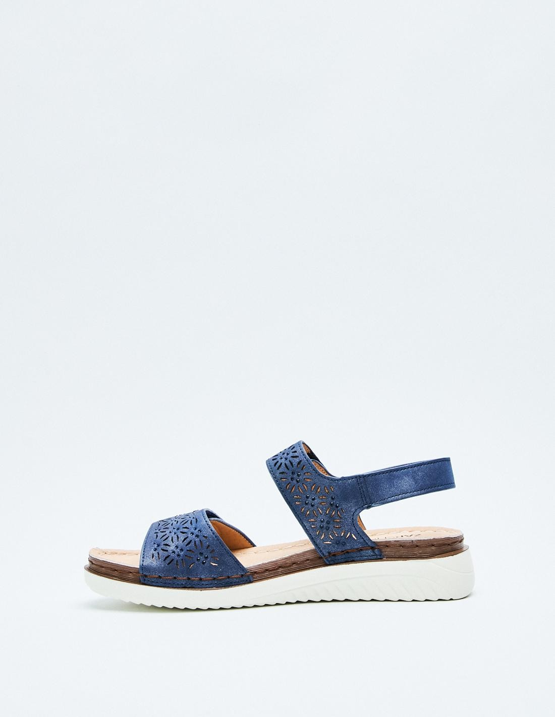 Sandalia plana en efecto piel con tiras adhesivas delanteras y tira trasera. Suela de goma combinada. Altura de la suela: 2,8 cm.