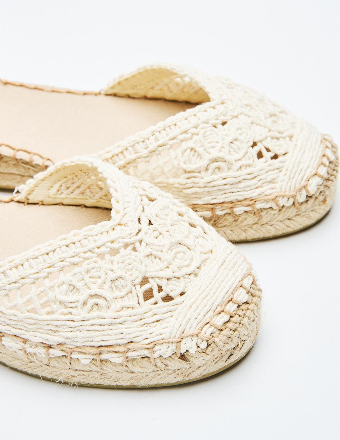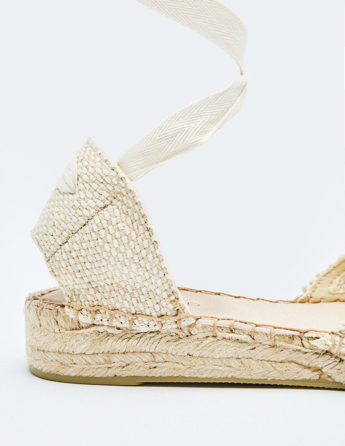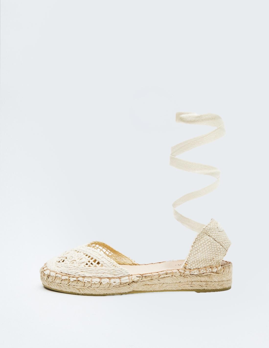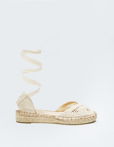 Zapato tipo alpargata en efecto crochet . Combinación de materiales en el corte. Tiras para atar en el tobillo. Altura del tacón: 2 cm.