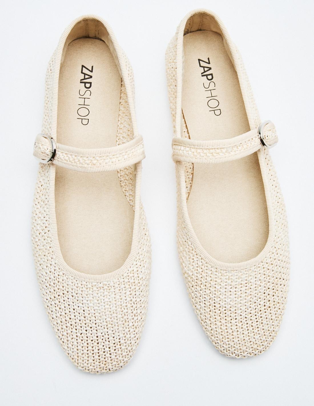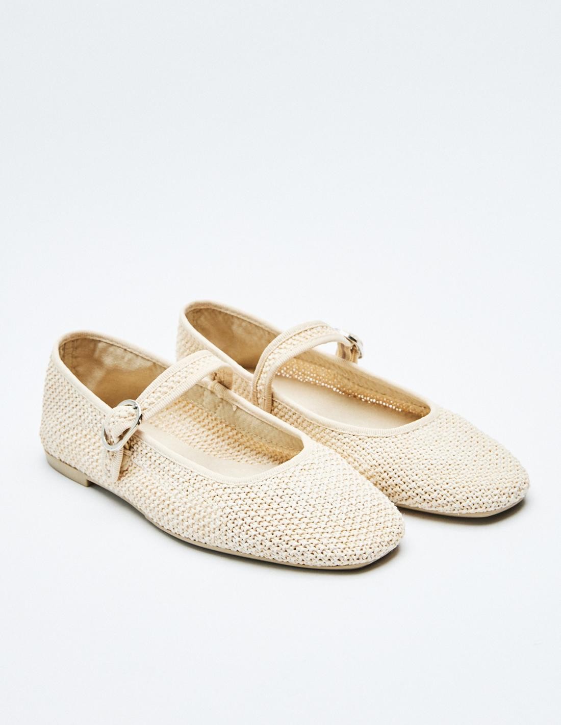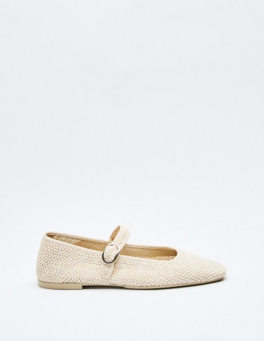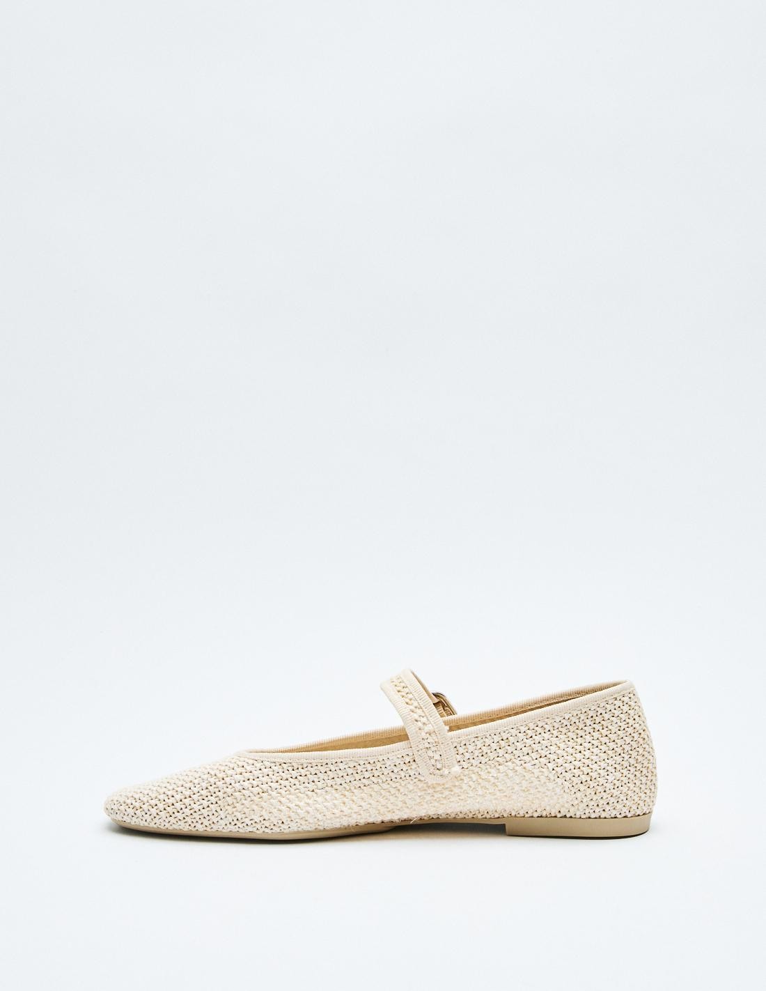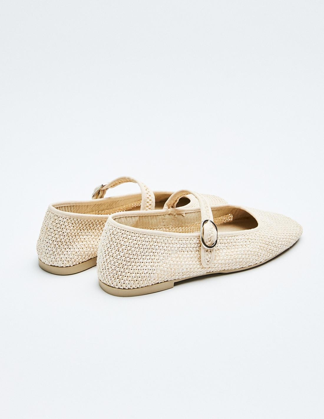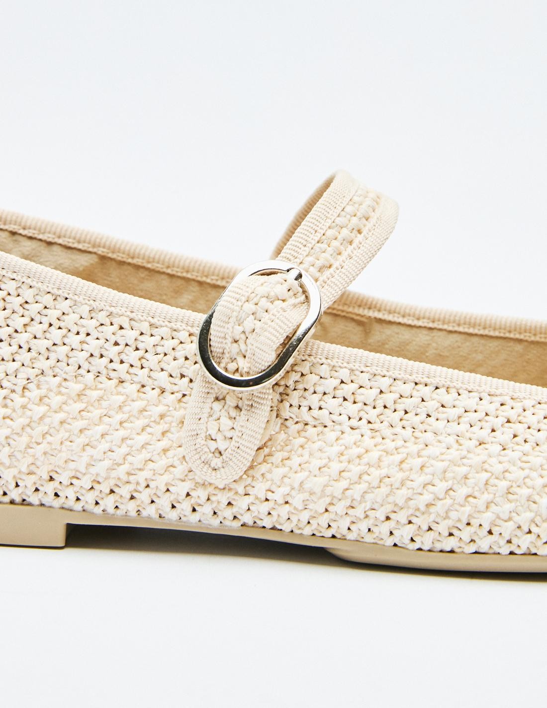 Zapato plano tipo bailarina en efecto trenzado en el cuerpo. Tira con hebilla en la parte delantera. Acabado en punta.