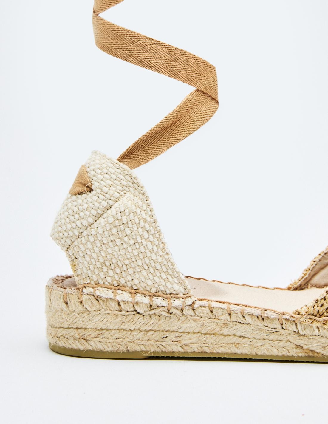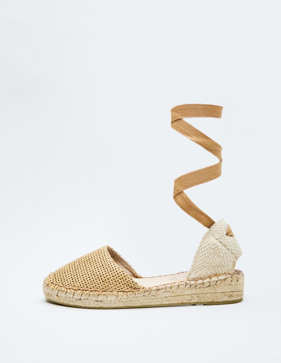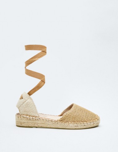 Zapato tipo alpargata en efecto combinado de yute . Combinación de materiales en el corte. Tiras para atar en el tobillo.