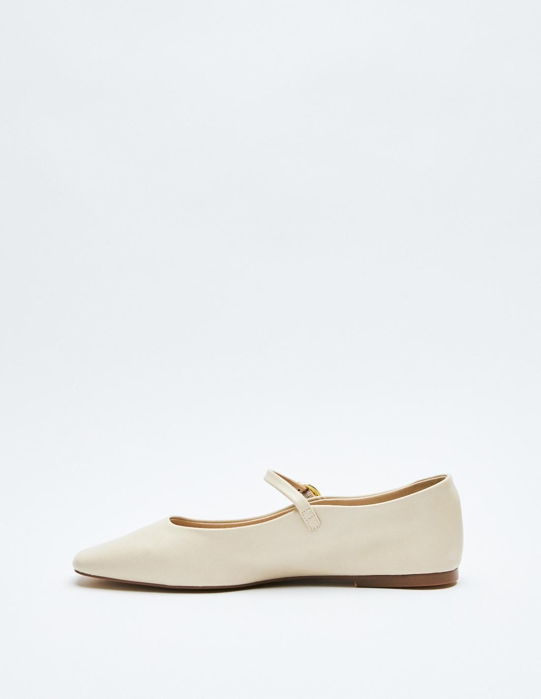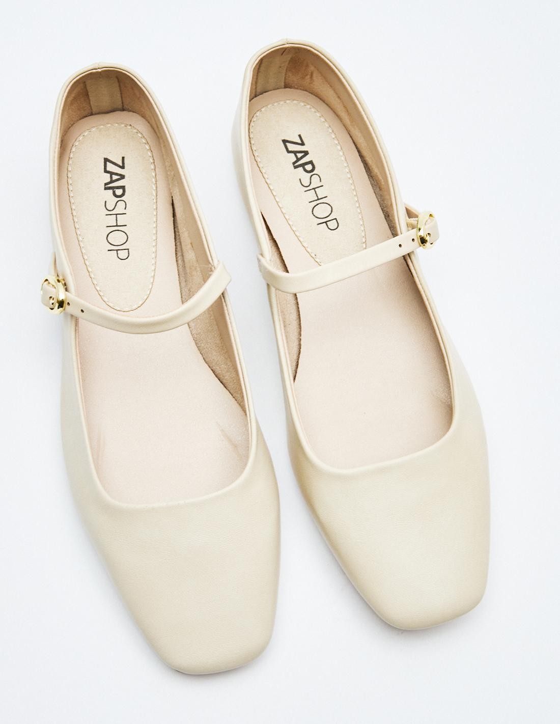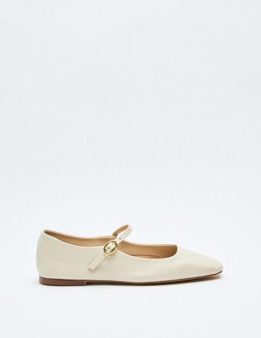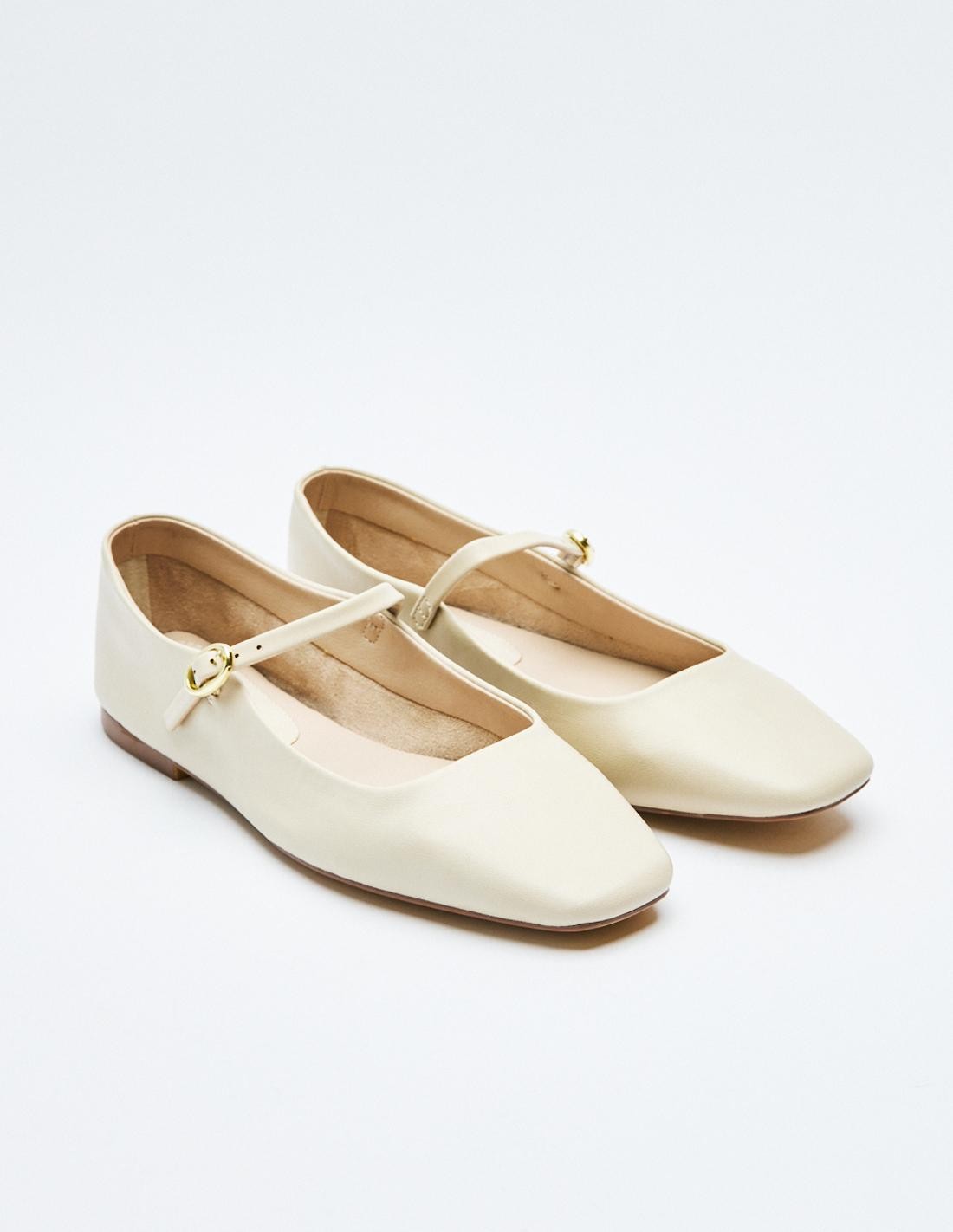 Zapato tipo bailarina en efecto serraje. Tira con hebilla en la parte delantera. Acabado en punta.