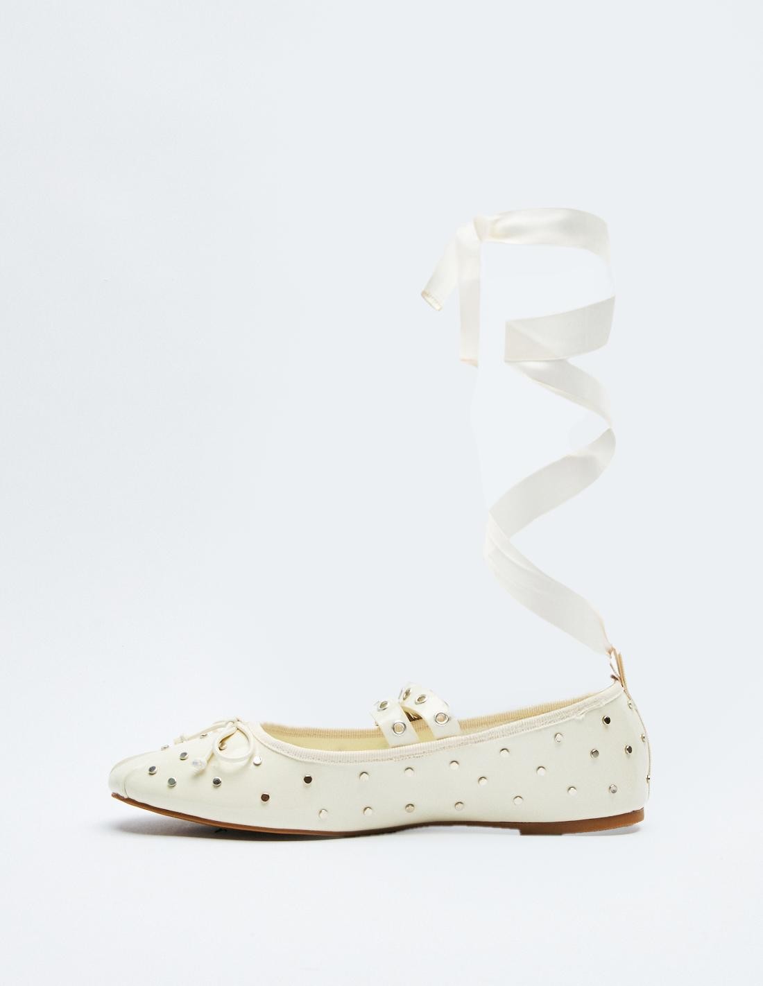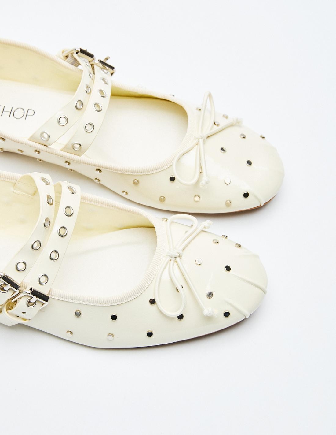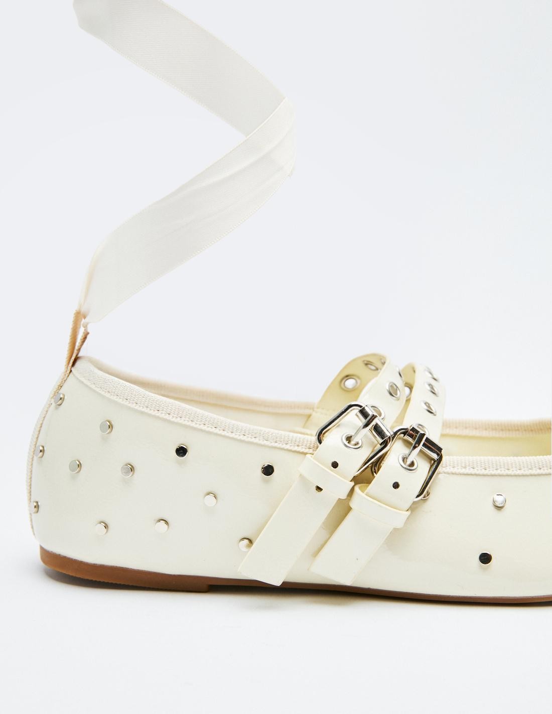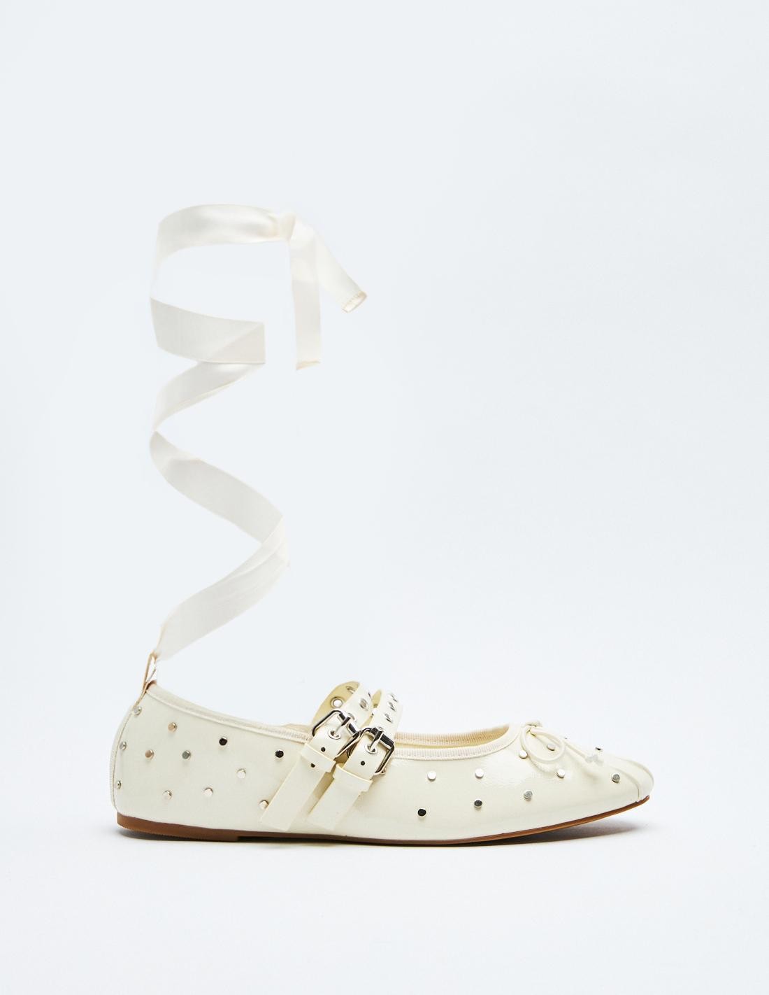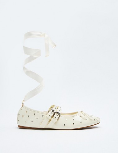 Zapato tipo bailarina en efecto piel . Detalle de tachas en el cuerpo. Doble tira con hebillas ajustables. Acabado en punta redonda. Altura de la suela: 0,7 cm