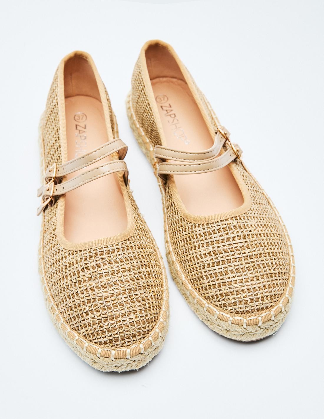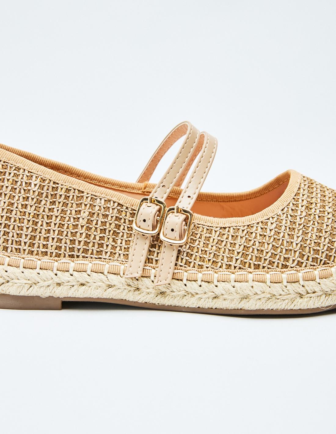 Zapato tipo bailarina . Efecto en tejido. Doble tira con hebilla en la parte delantera. Acabado en punta redonda.
