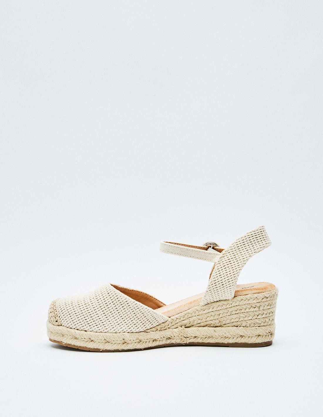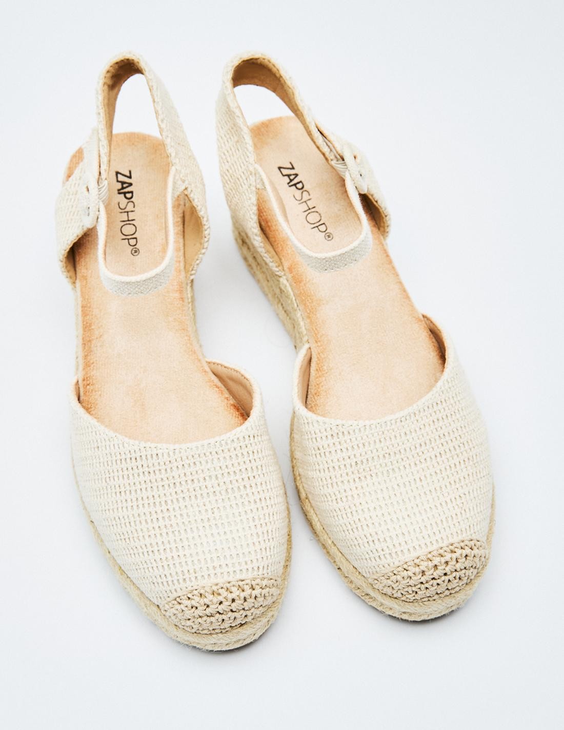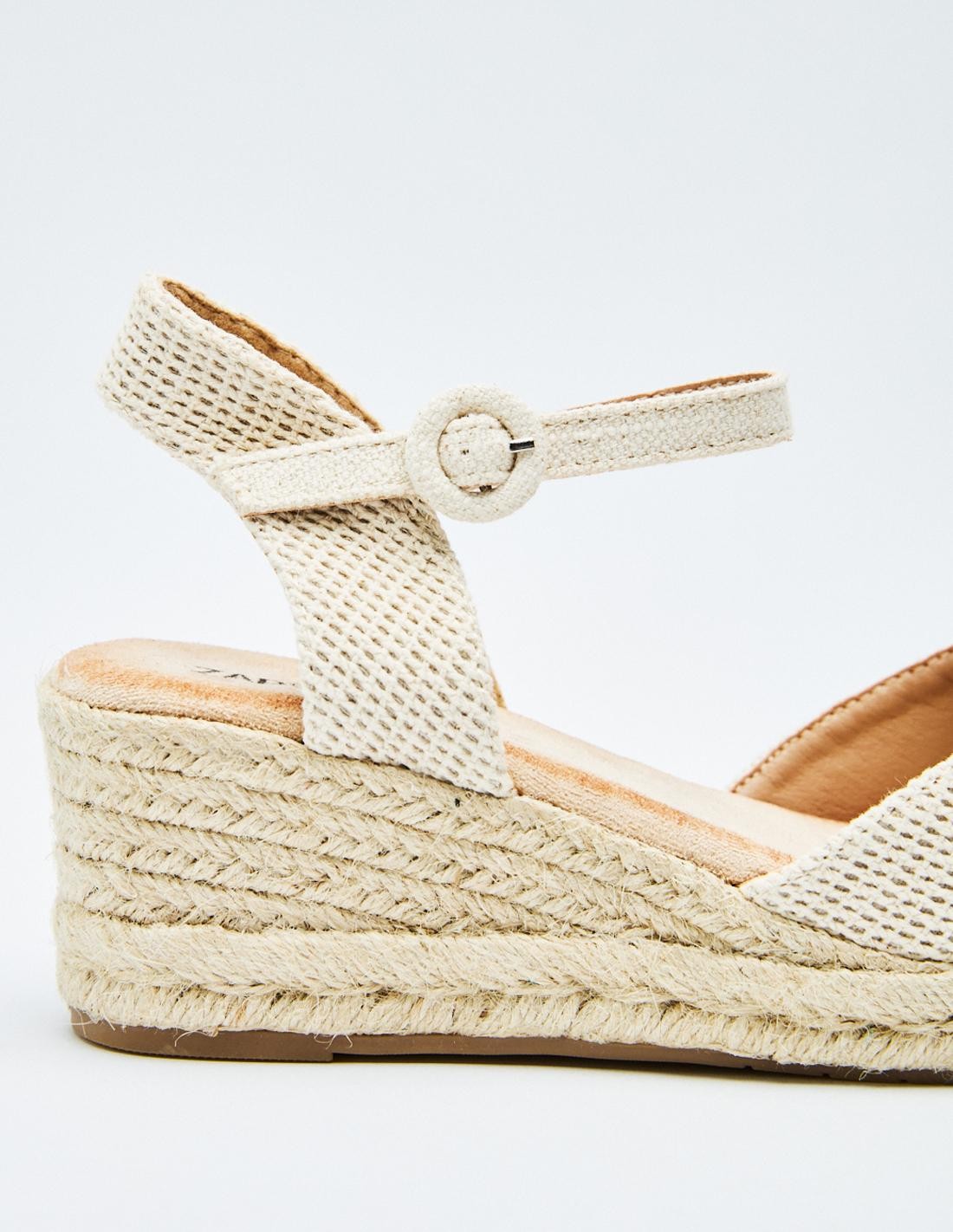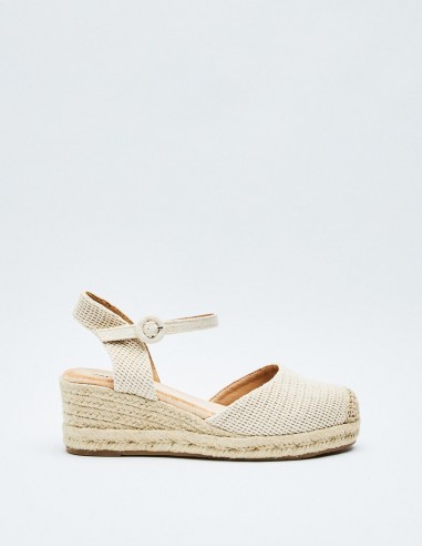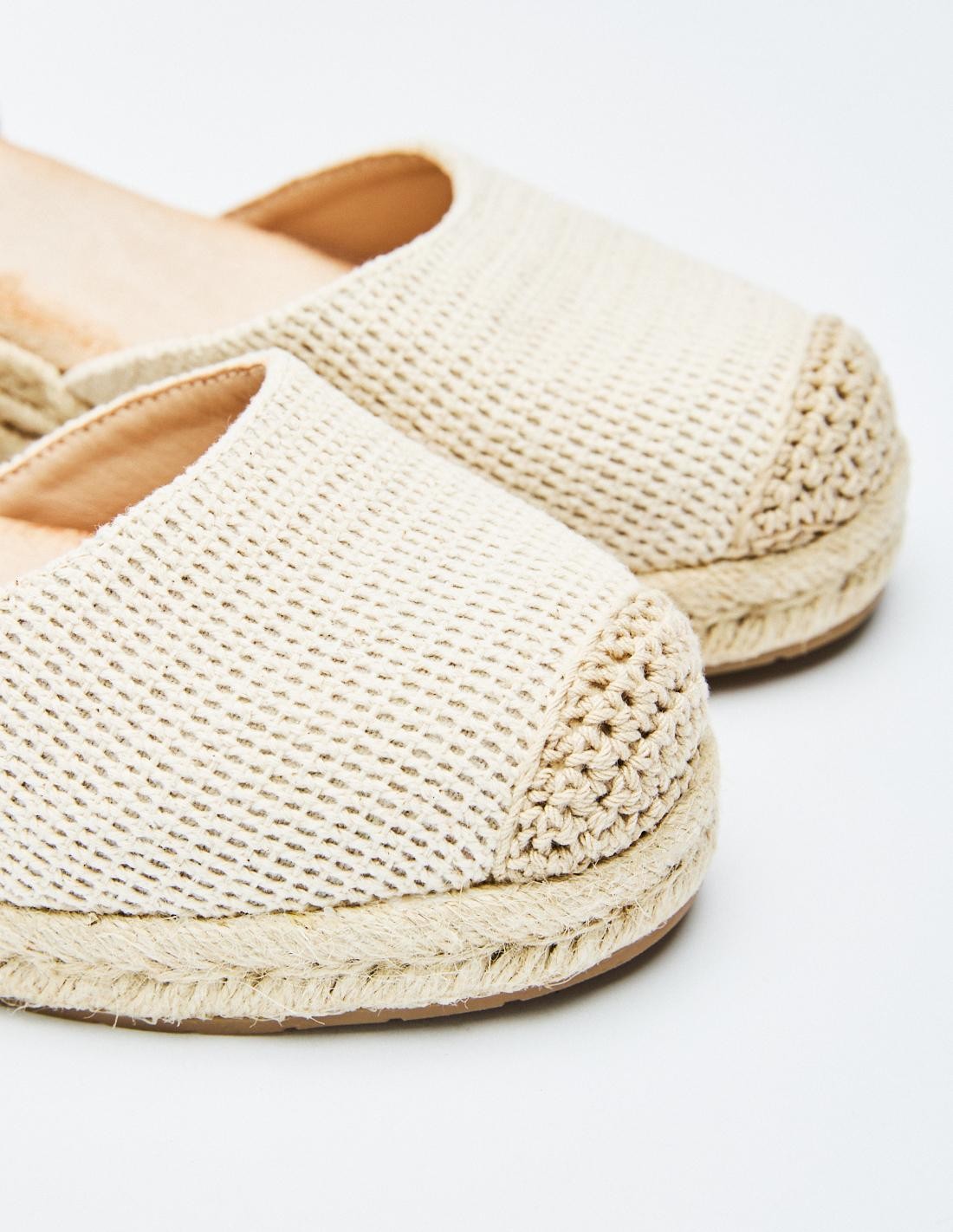 Zapato destalonado tipo alpargata en crochet . Tacón alto en forma de cuña. Cierre mediante pulsera con hebilla en el tobillo. Suela de goma con yute . Altura del tacón: 6.8 cm