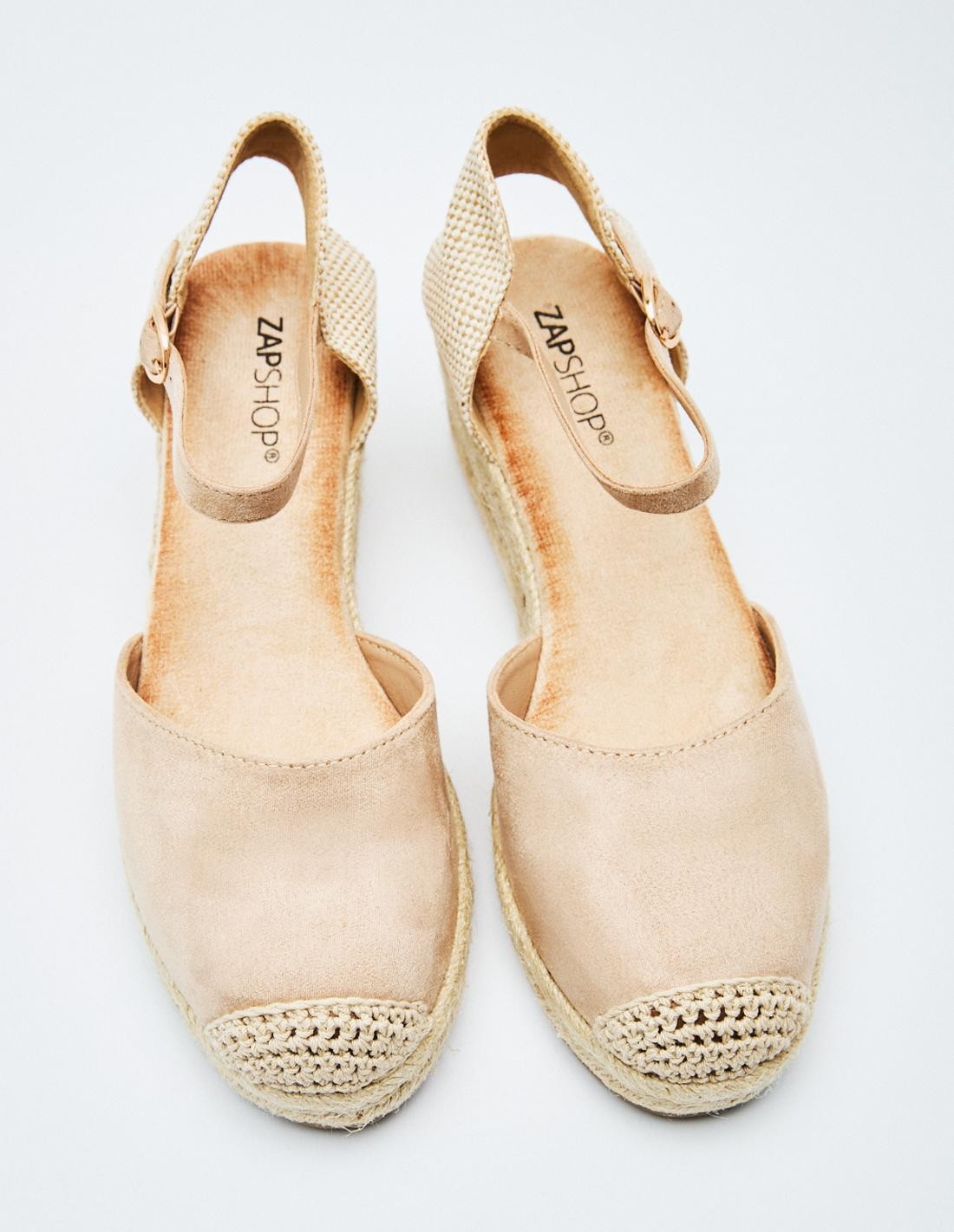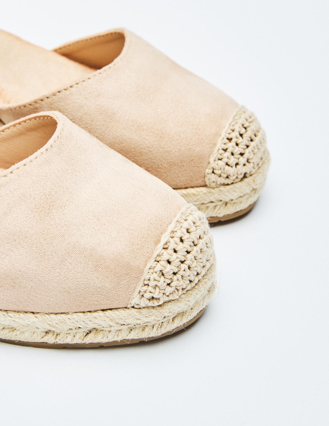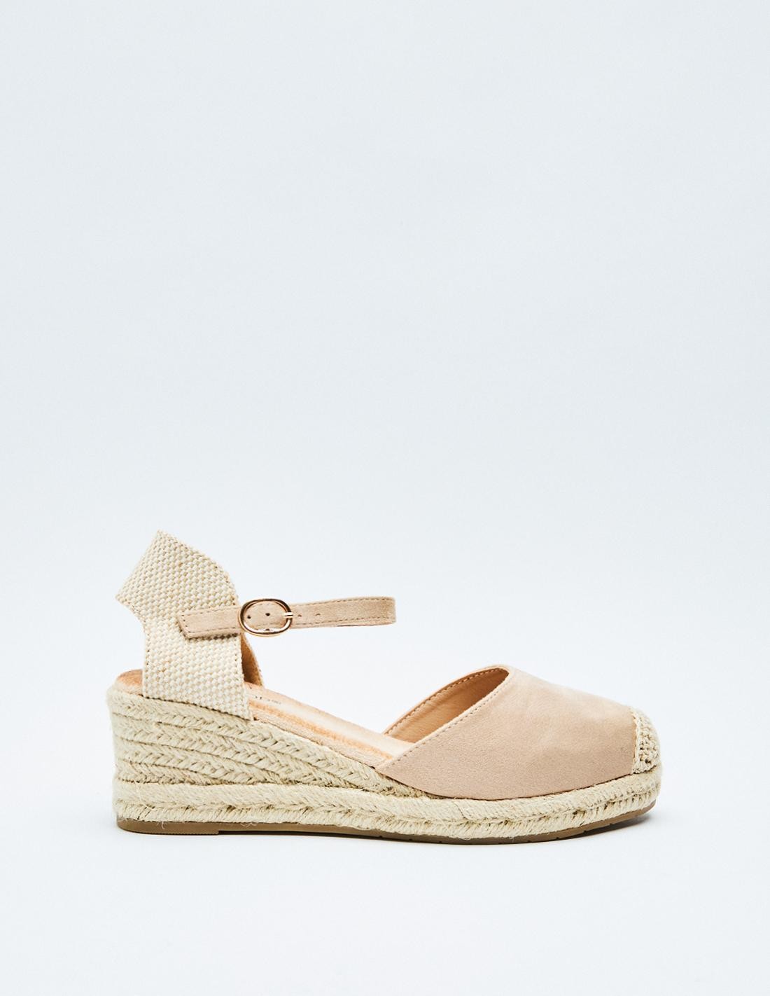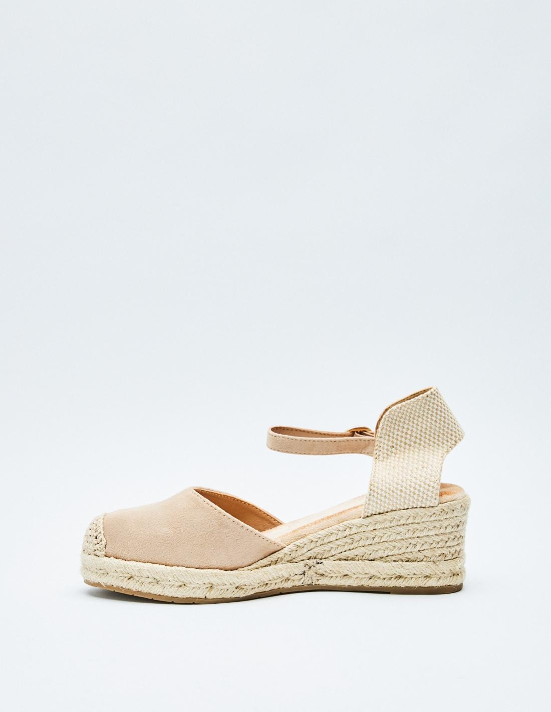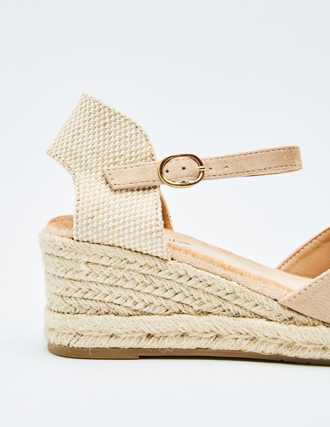 Zapato destalonado tipo alpargata en serraje . Tacón alto en forma de cuña. Cierre mediante pulsera con hebilla en el tobillo. Suela de goma con yute .