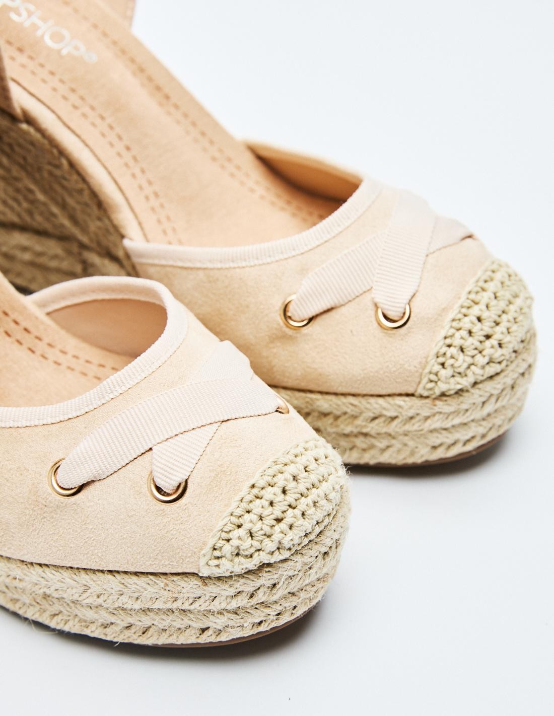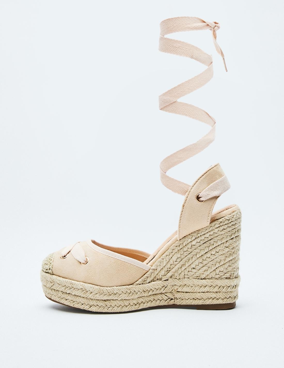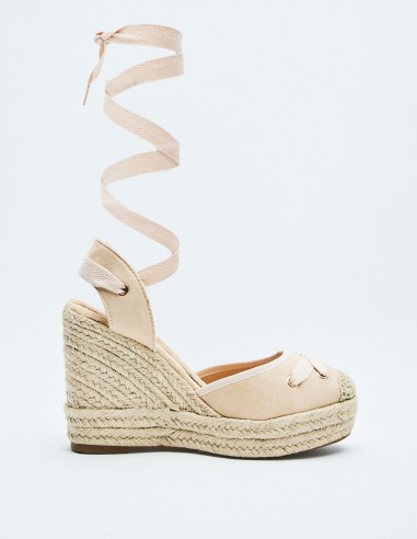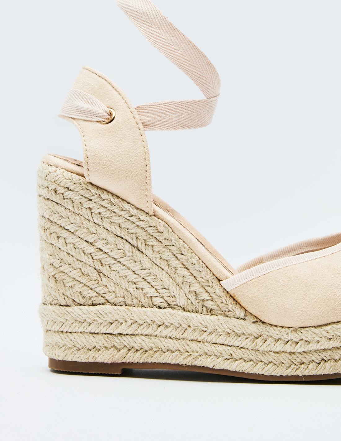 Zapato destalonado tipo alpargata en efecto serraje. Tacón alto en forma de cuña. Tiras de tejido para atar al tobillo. Altura del tacón: 11 cm.