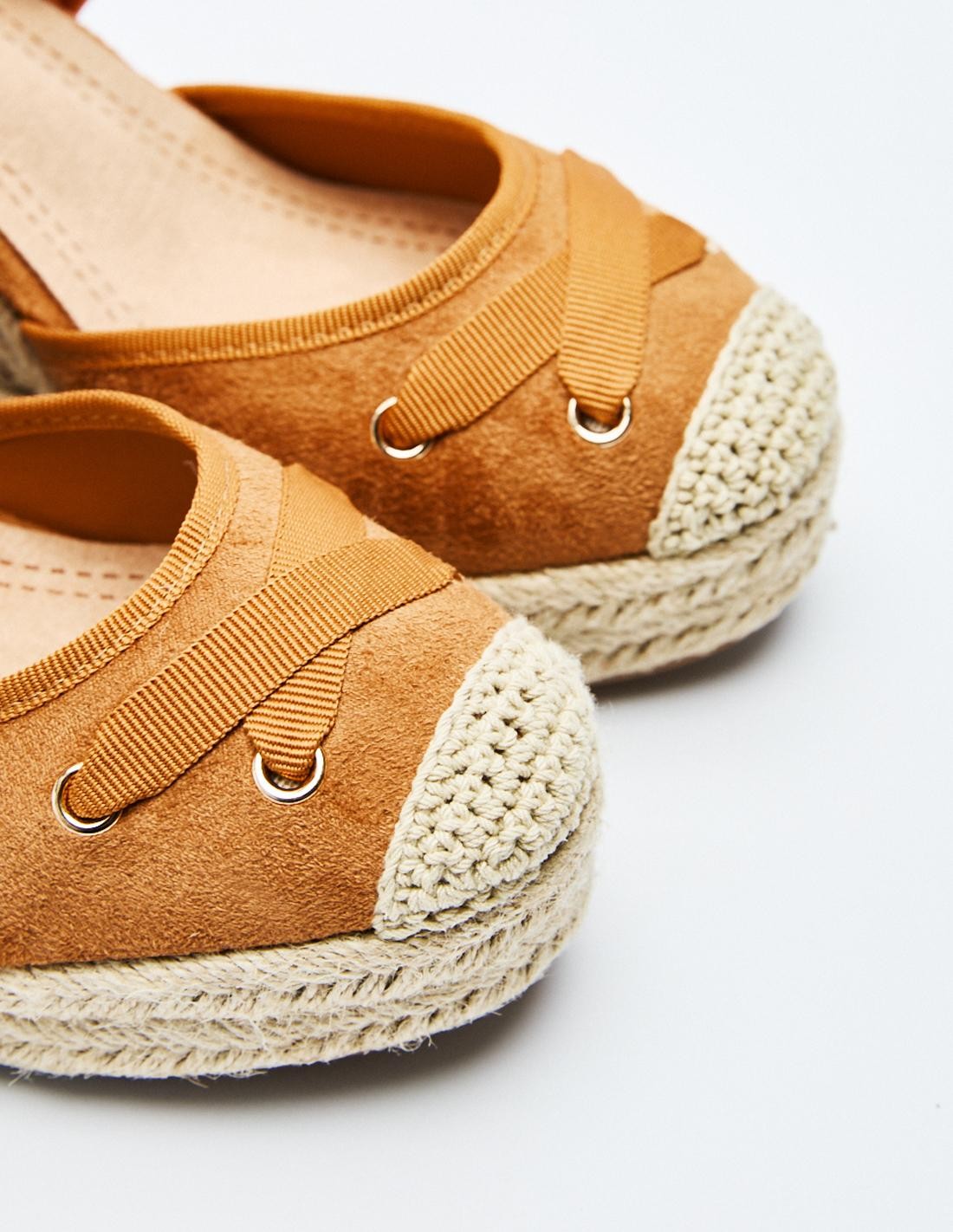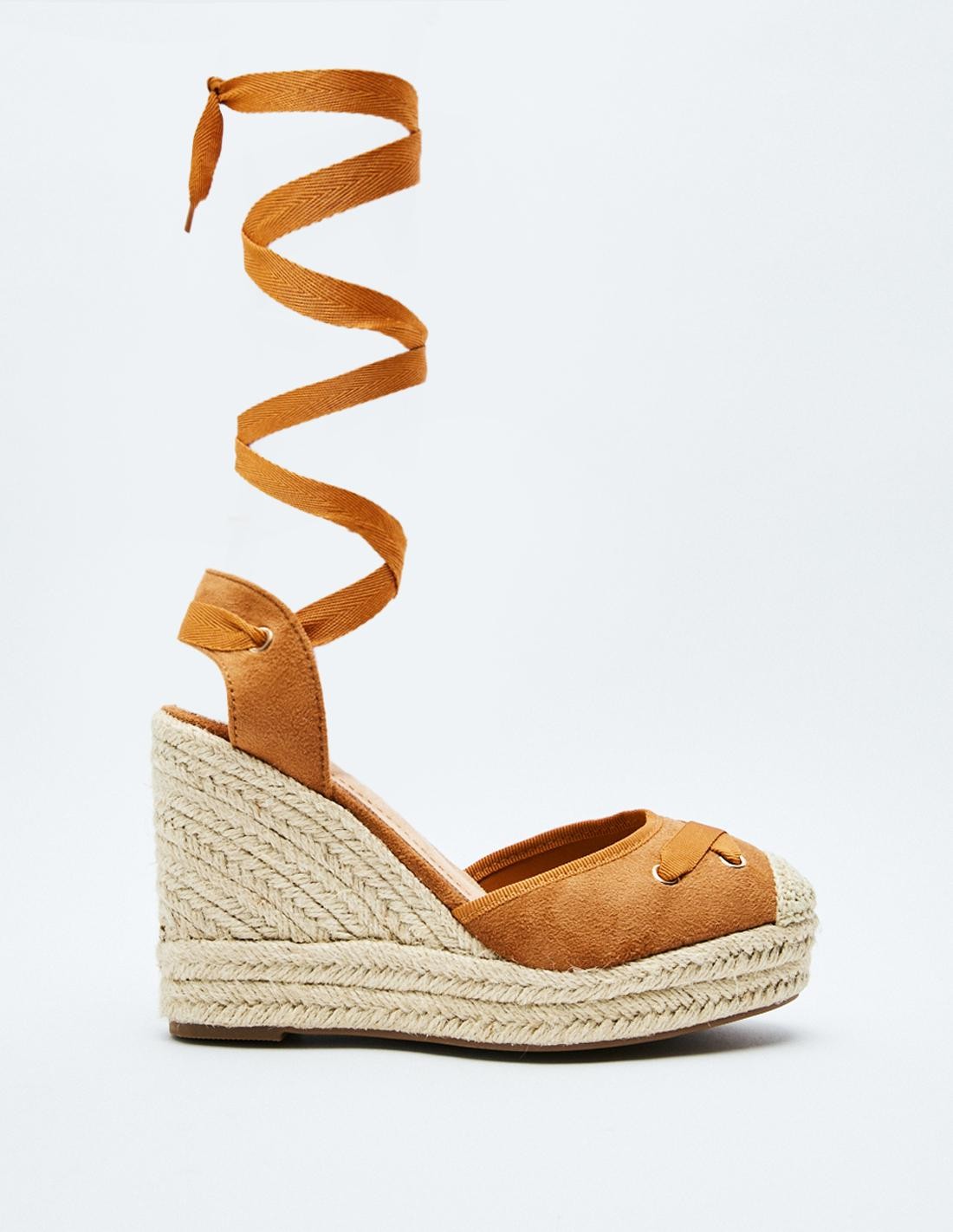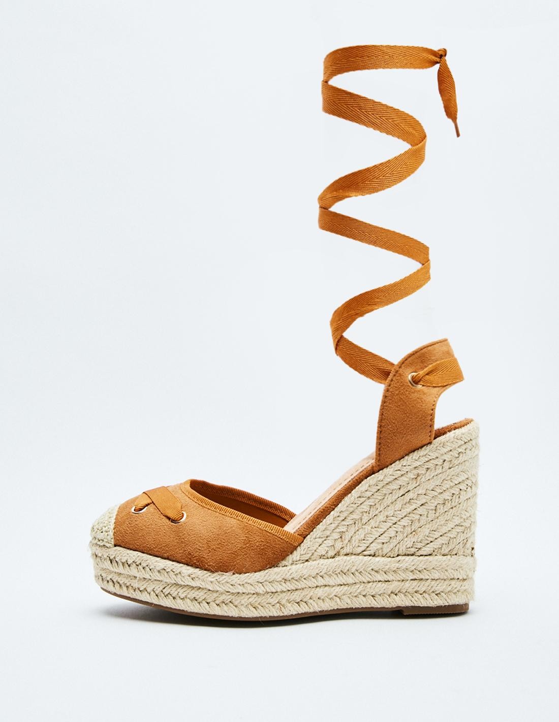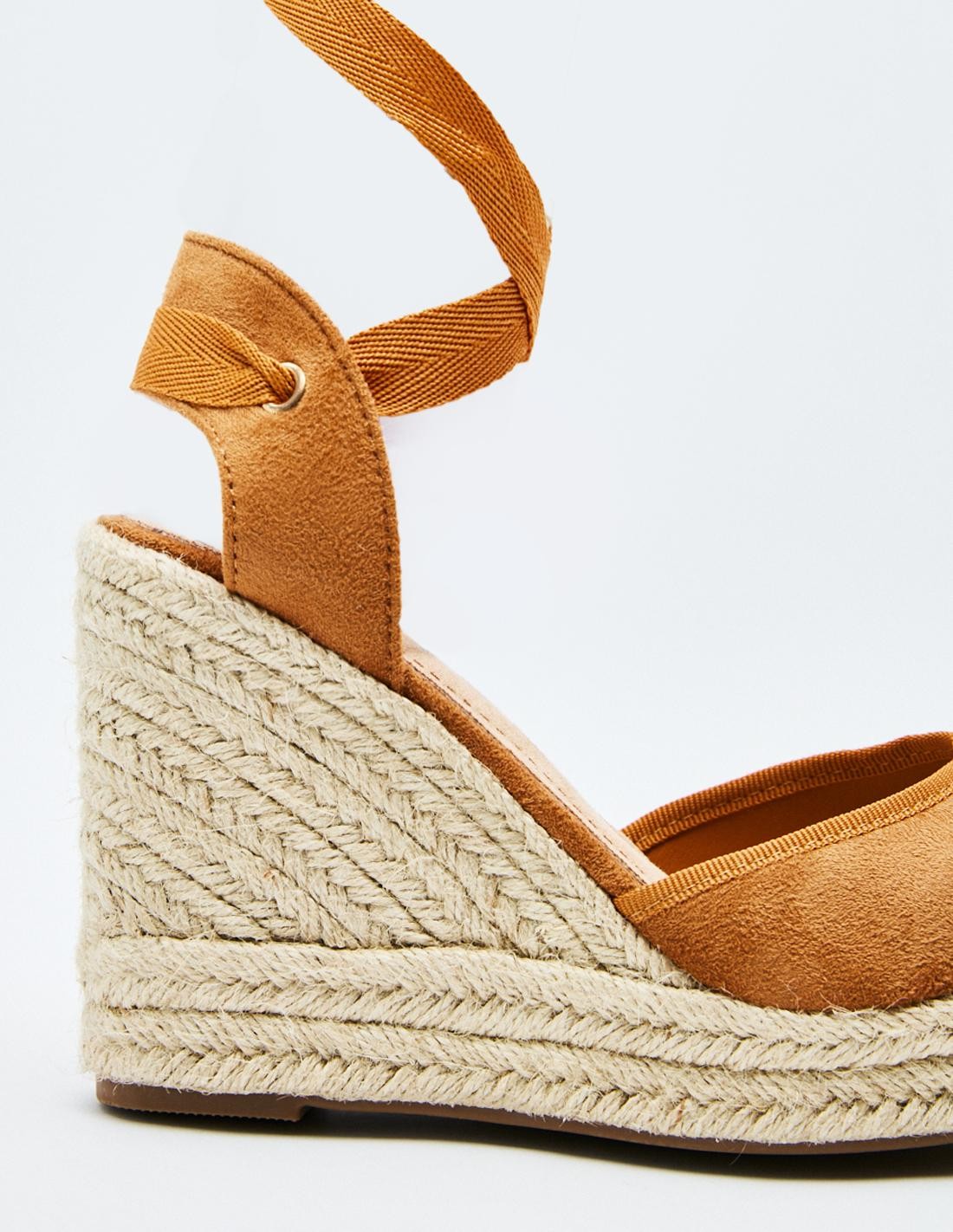 Zapato destalonado tipo alpargata en efecto serraje. Tacón alto en forma de cuña. Tiras de tejido para atar al tobillo.