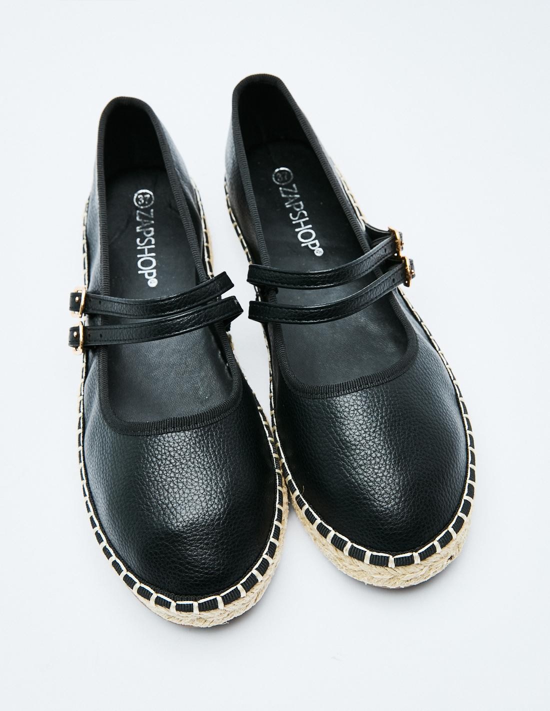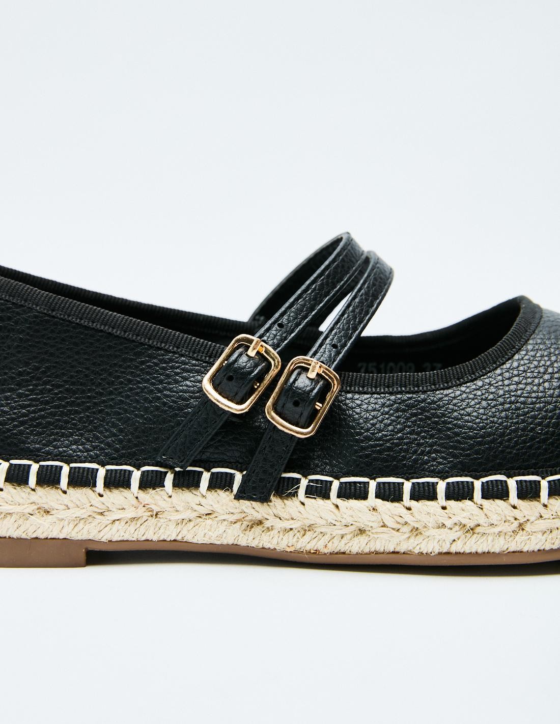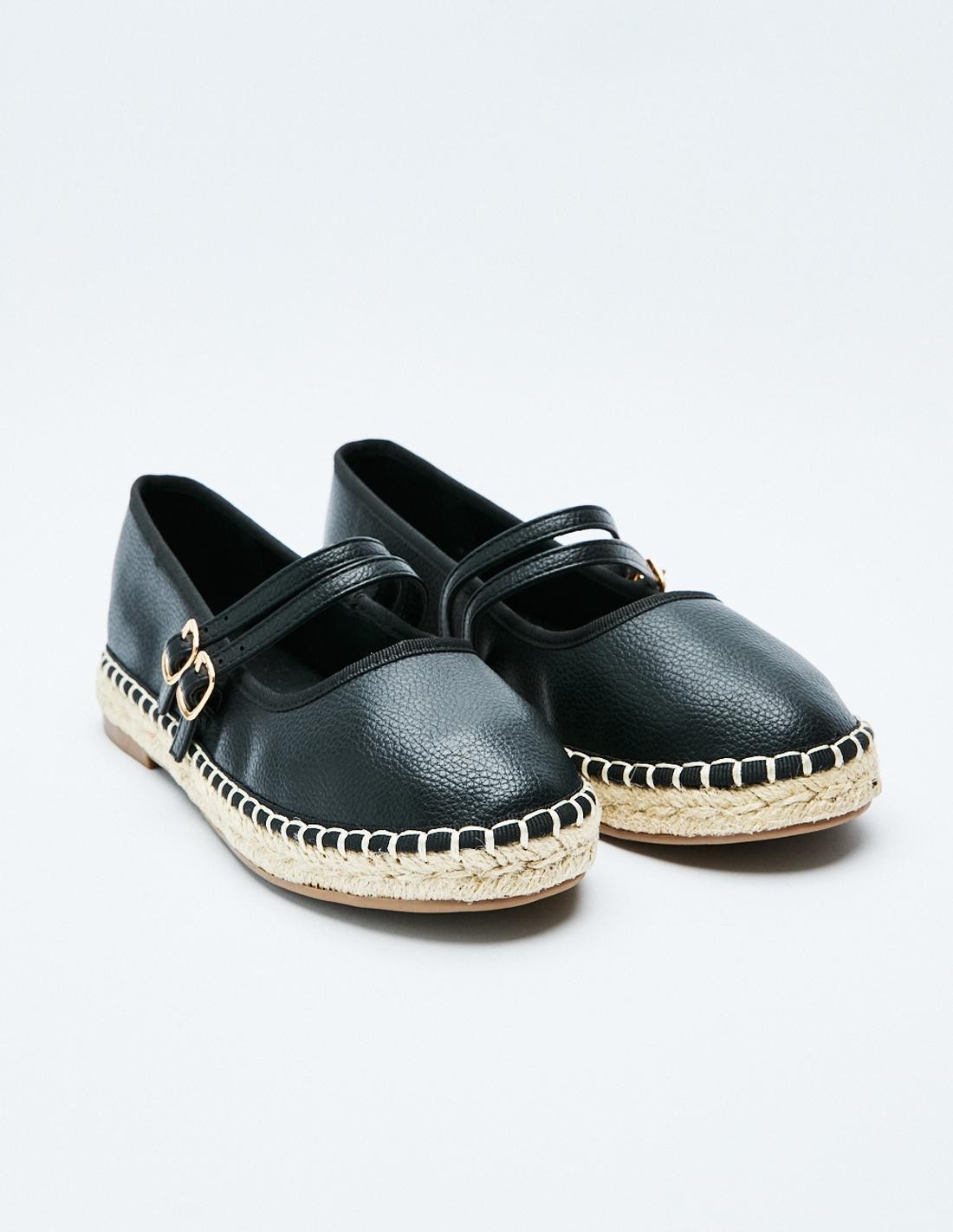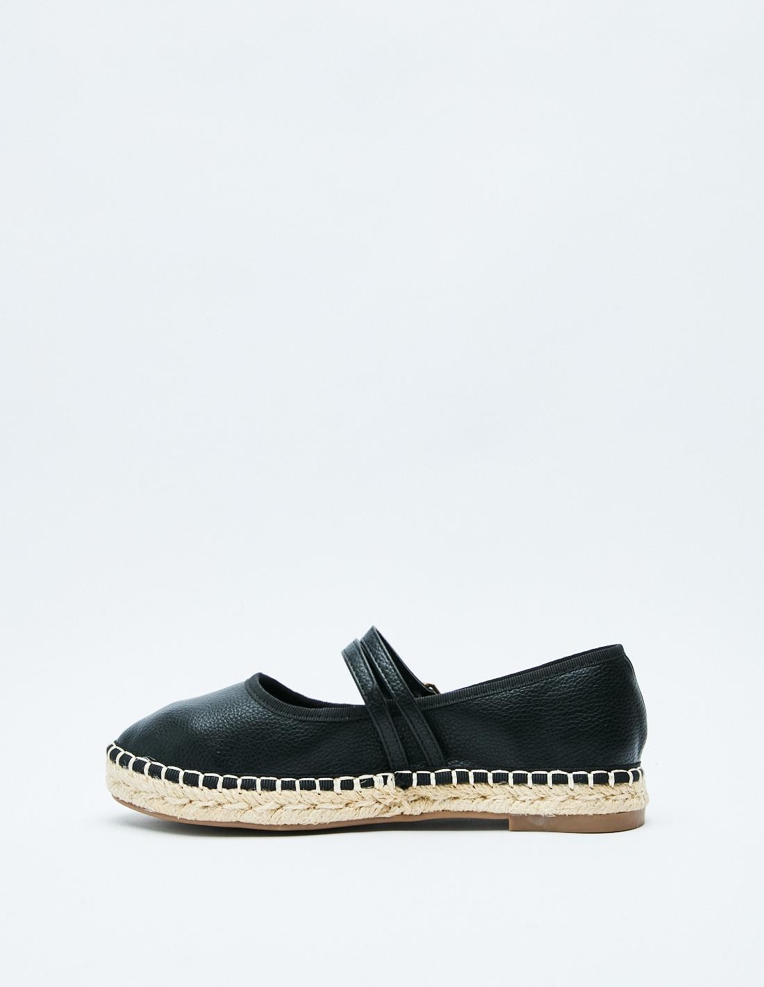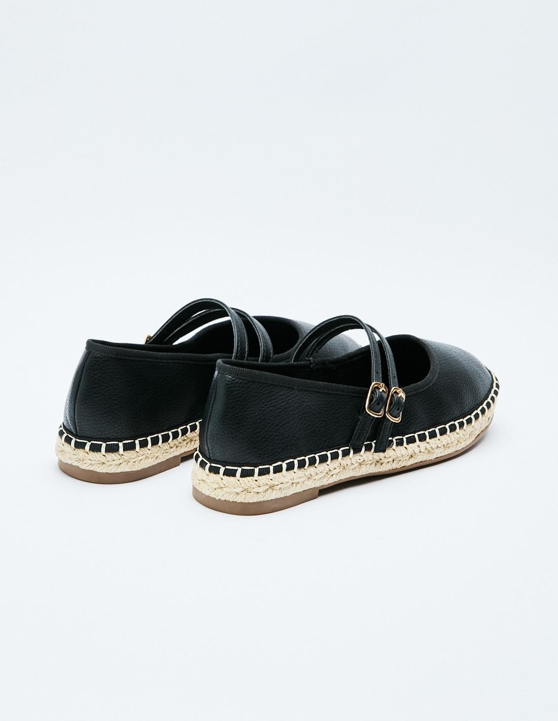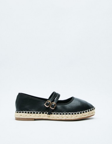 Zapato tipo bailarina . Efecto en piel . Doble tira con hebilla en la parte delantera. Acabado en punta redonda.