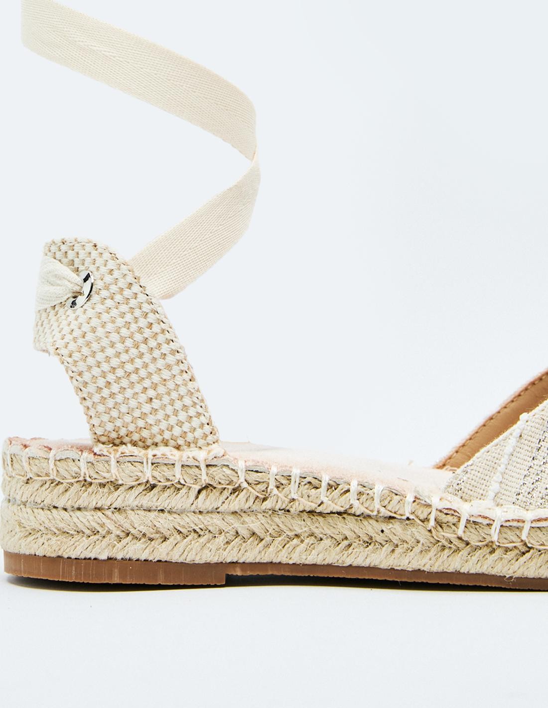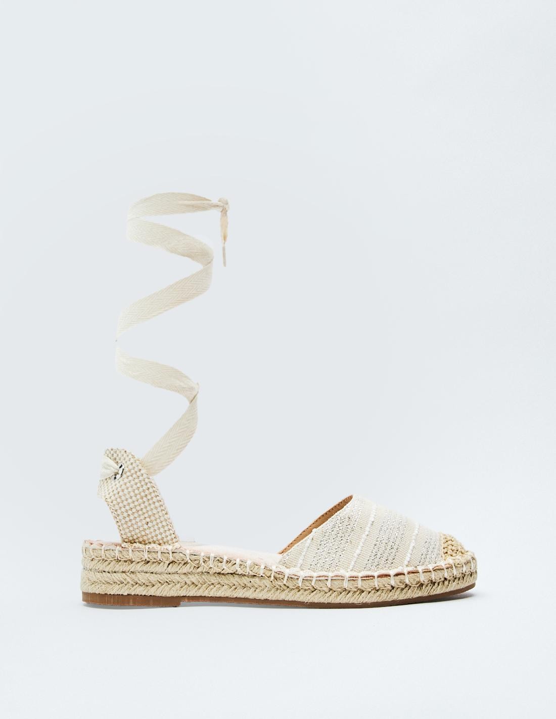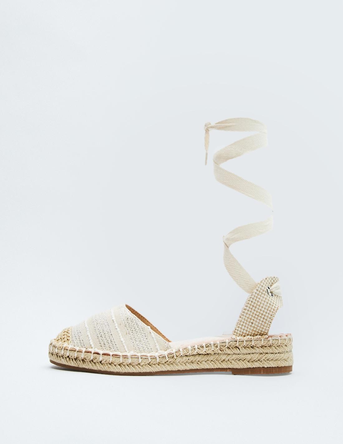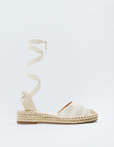 Zapato tipo alpargata en combinación de materiales. Tiras de tejido para atar al tobillo.