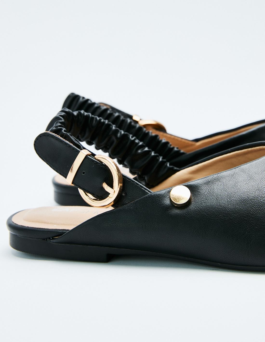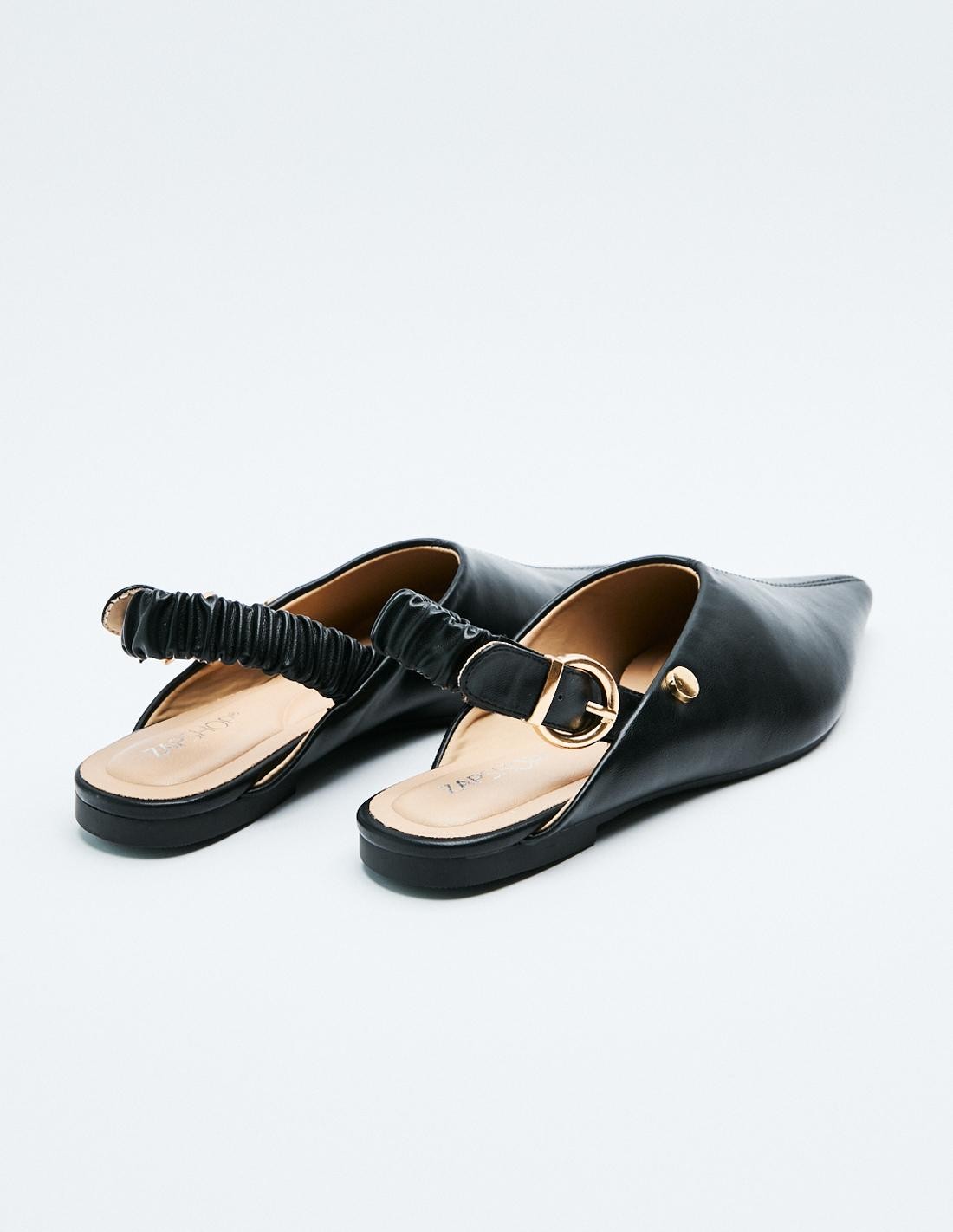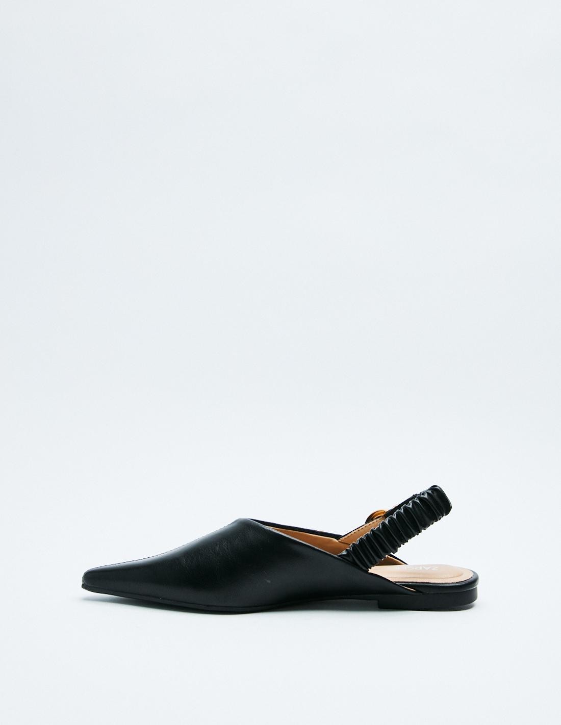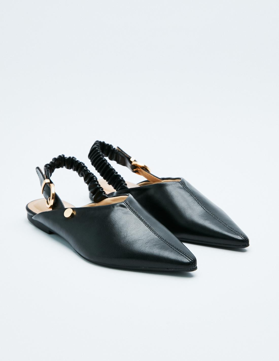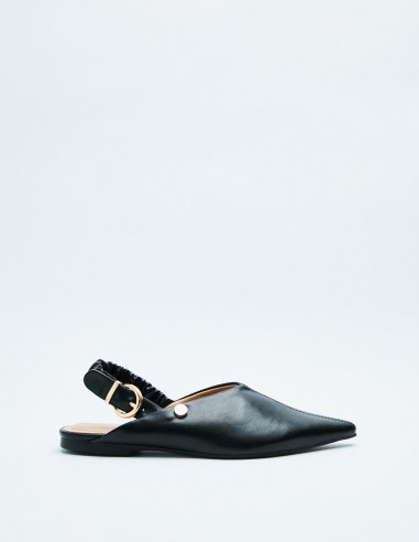 Zapato tipo destalonado en efecto piel. Detalle de pespunte en el corte. Tira trasera con elástico latera. Acabado en punta.