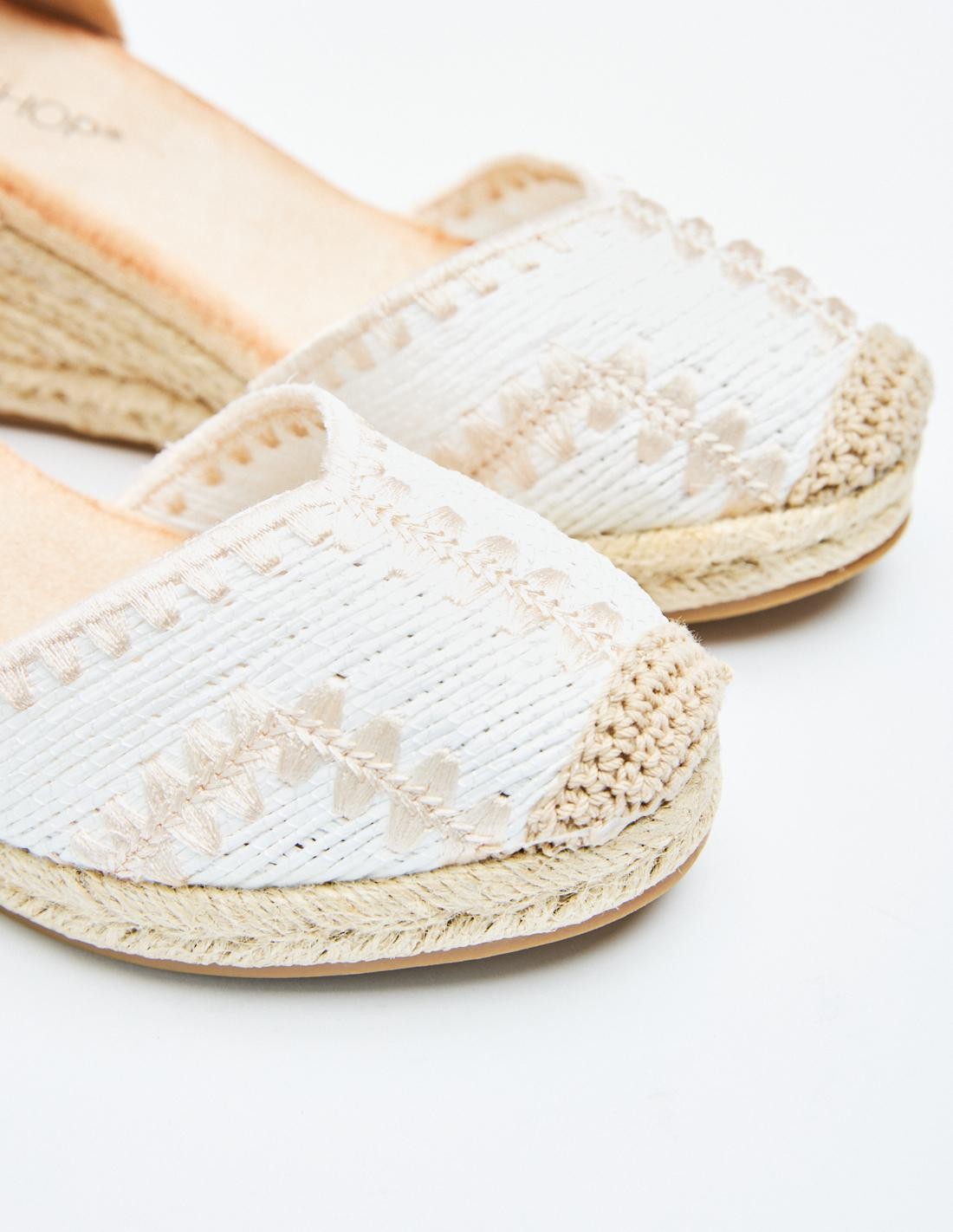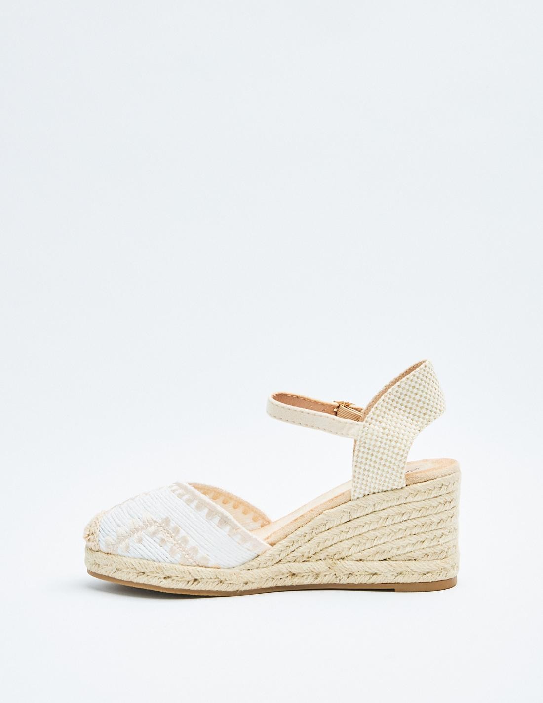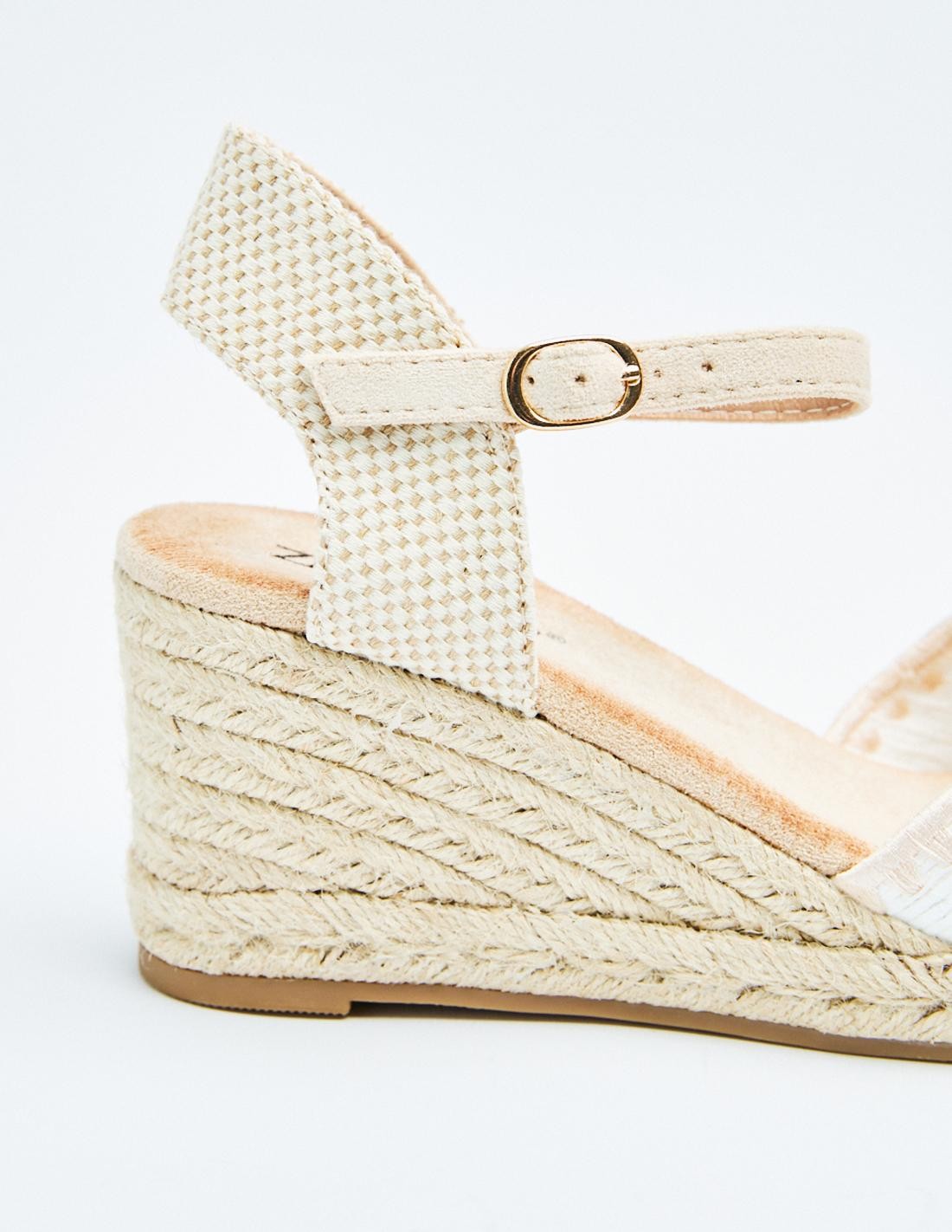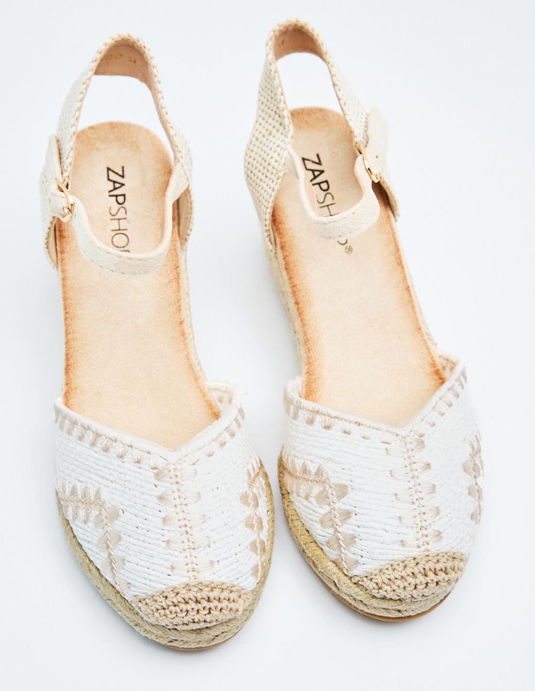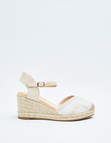 Zapato destalonado con tacón tipo cuña en tejido . Cierre mediante hebilla en la pulsera al tobillo.