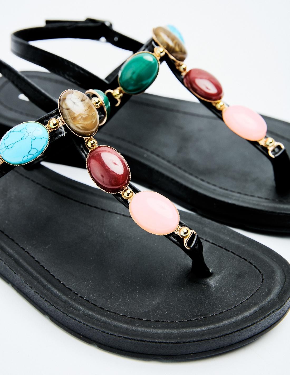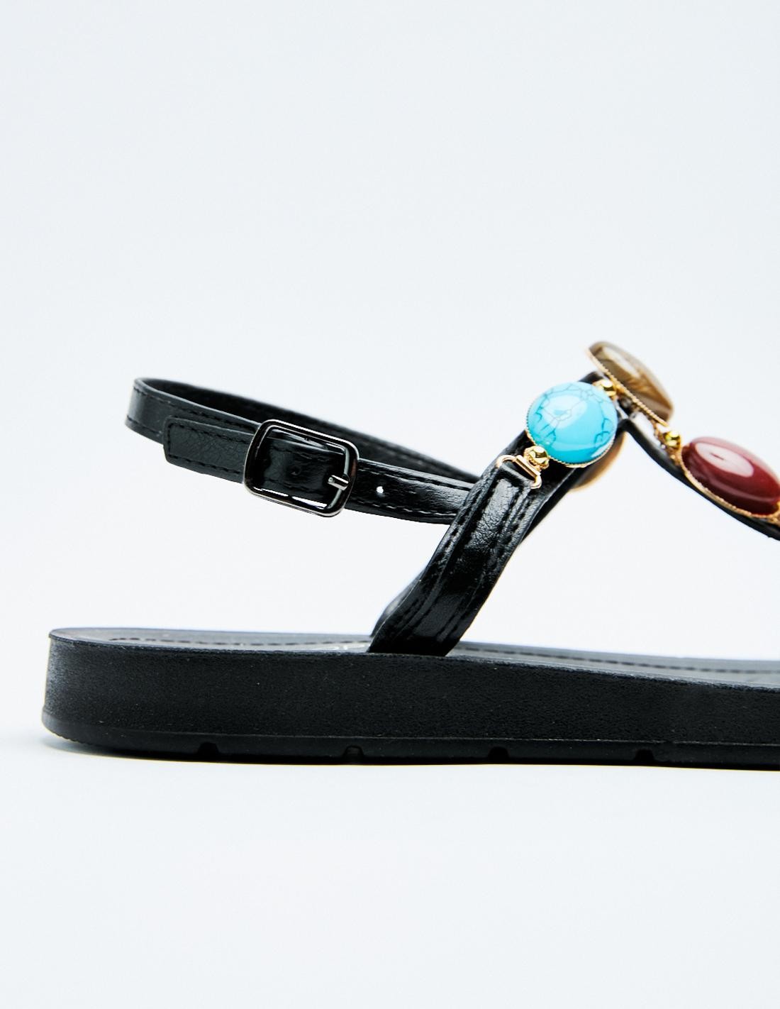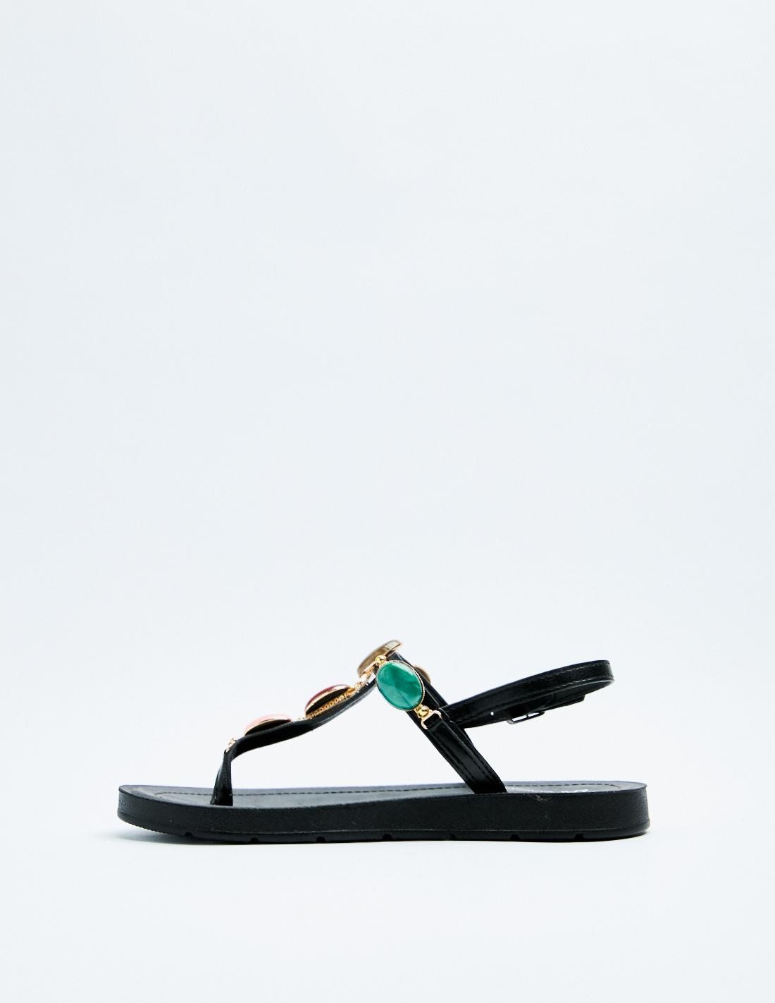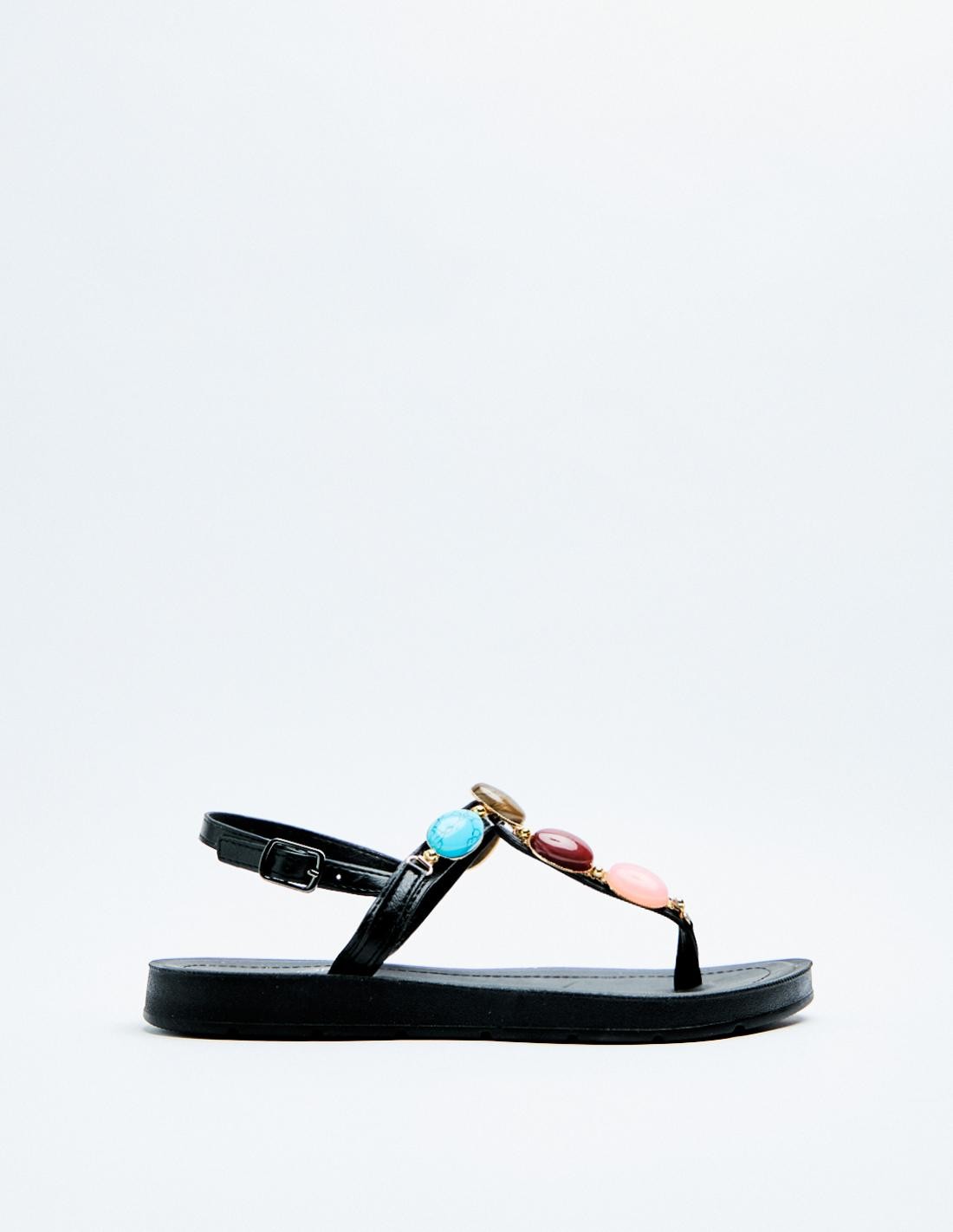 Sandalia plana en efecto piel con detalle en piedra.Suela plana del mismo material. Cierre mediante pulsera en la parte de atras. Acabado en punta redonda.