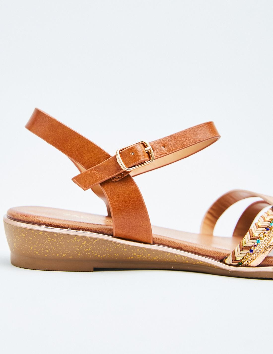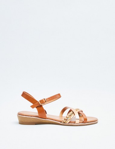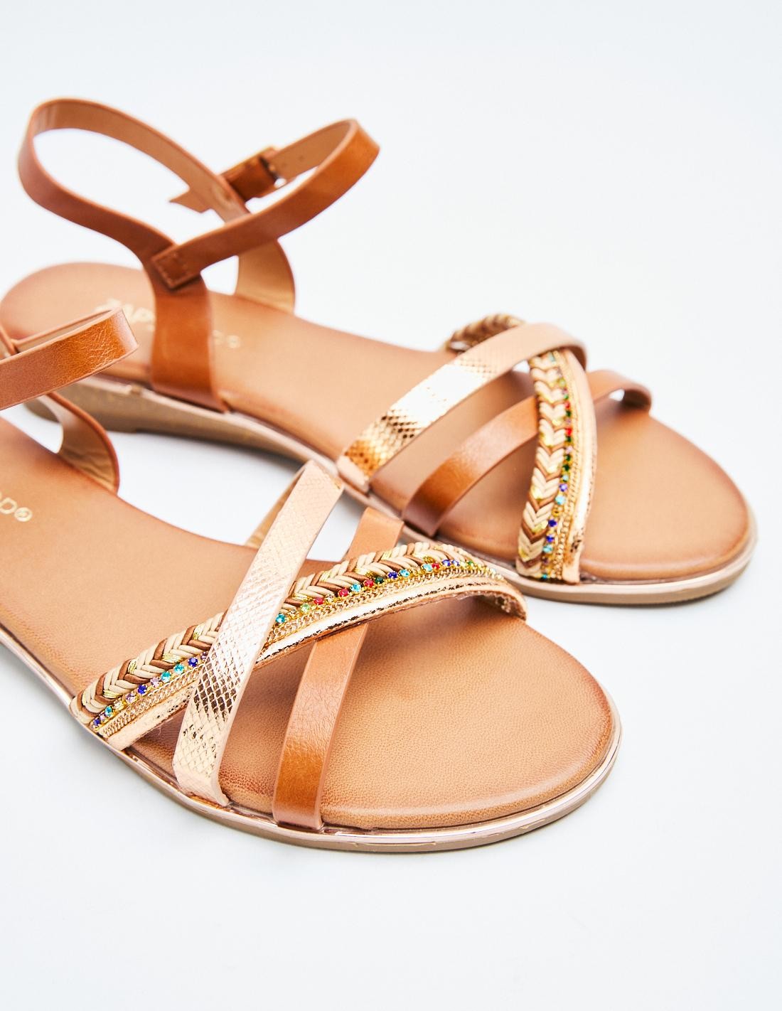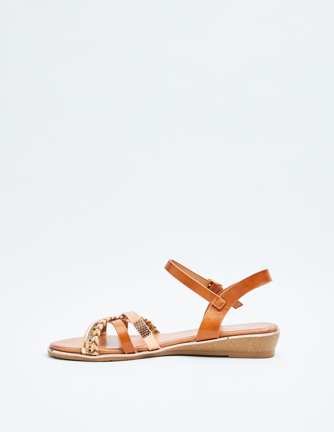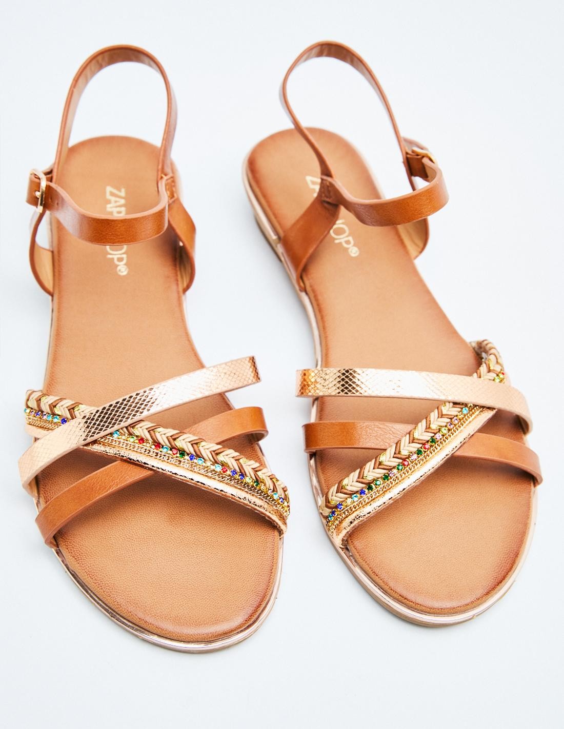 Sandalia plana efecto piel. Detalles de cruces de tiras en distintos materiales. Cierre mediante puelsera.