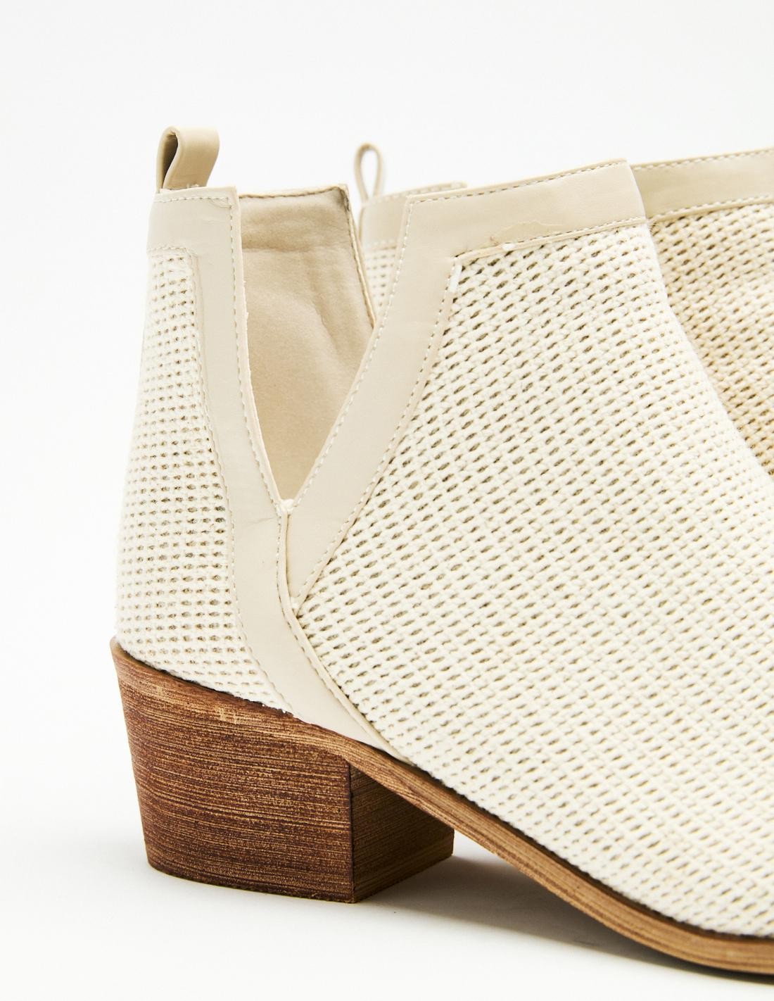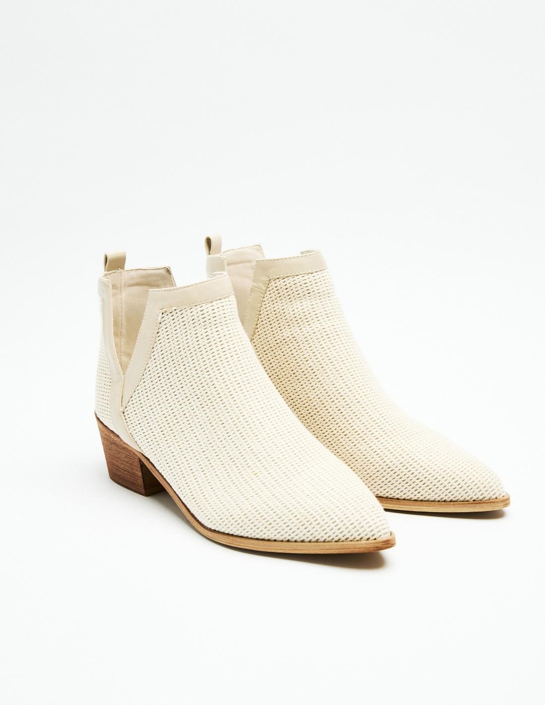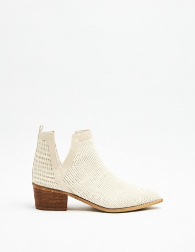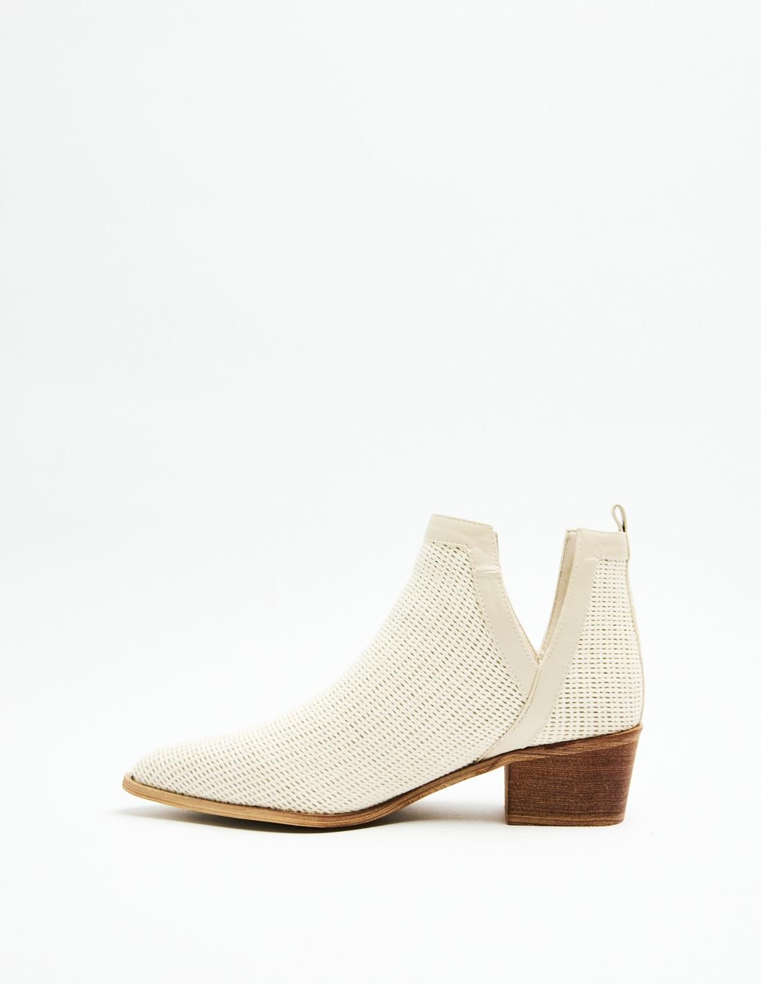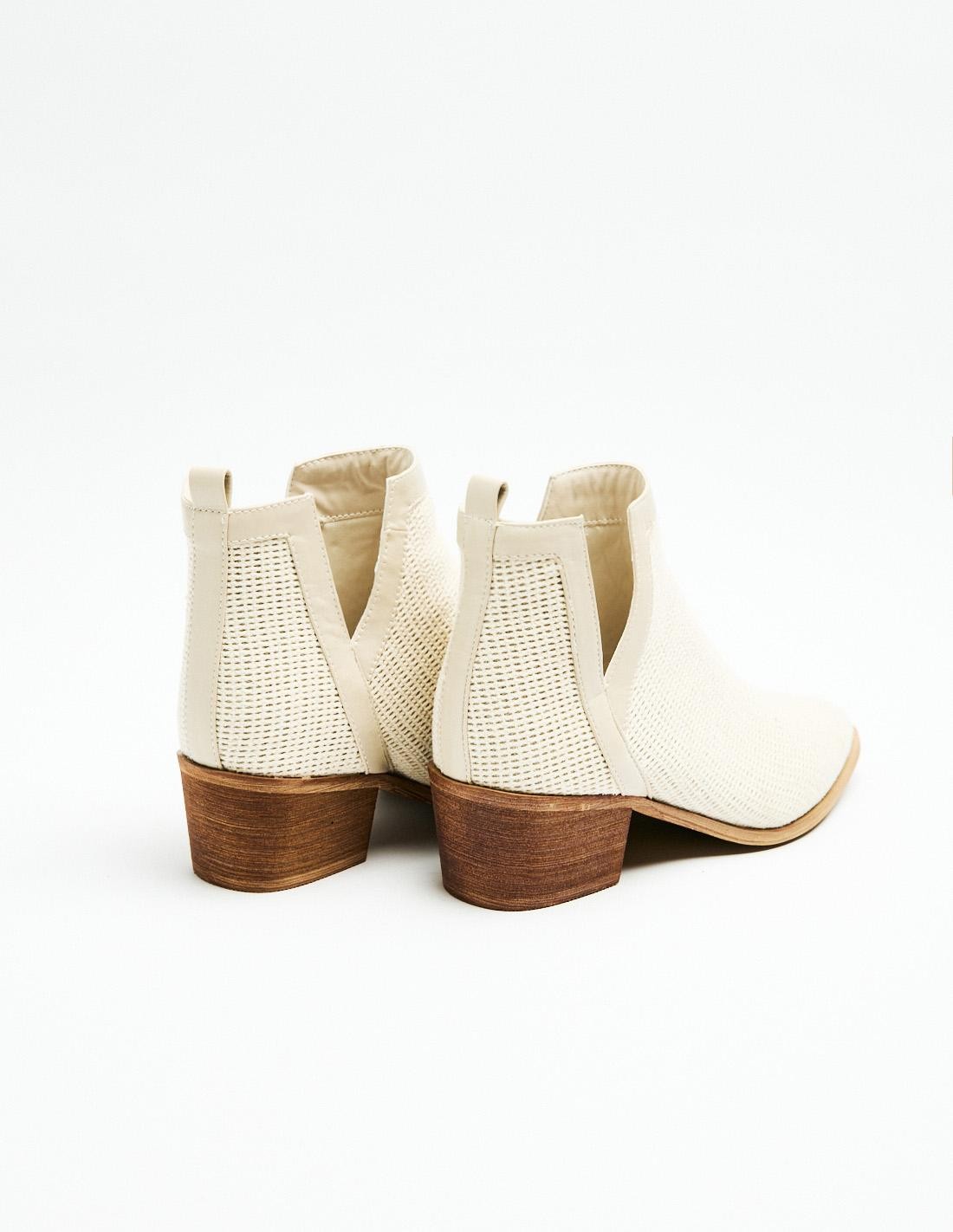 Zapato de tacón tipo botín en efecto tejido . Tacón cuadrado . Acabado en punta. Abertura en los laterales para mayor comodidad.