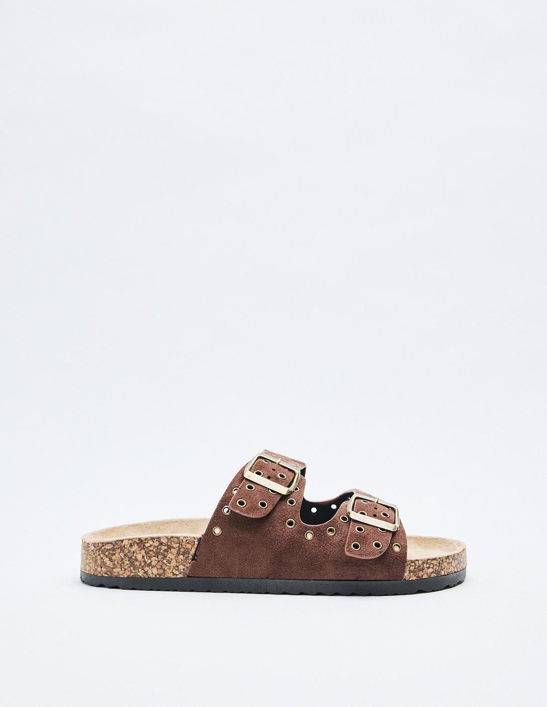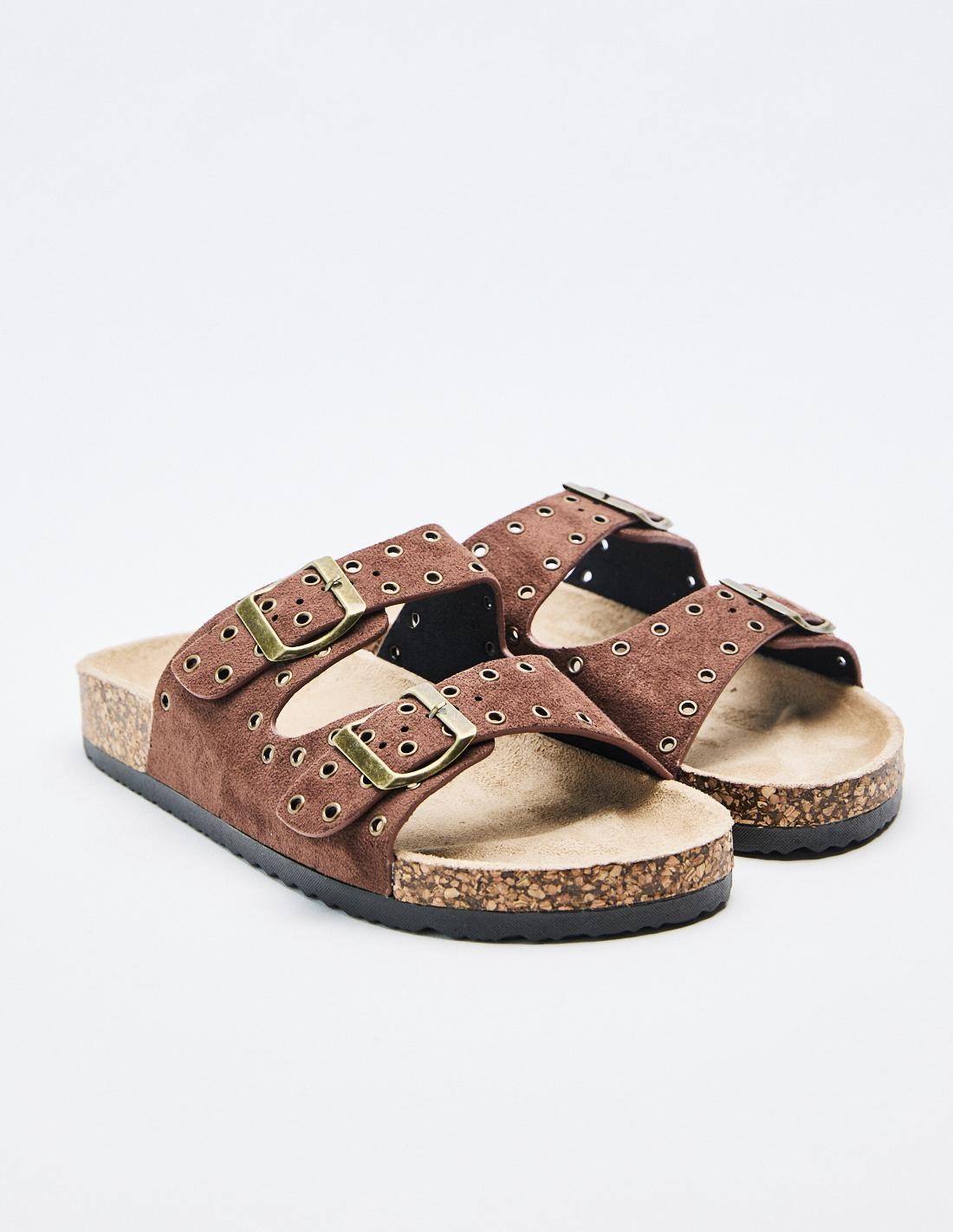 Sandalia fabricada en efecto serraje . Cuenta con dos tiras anchas en el empeine con detalle de hebilla. Suela con volumen.