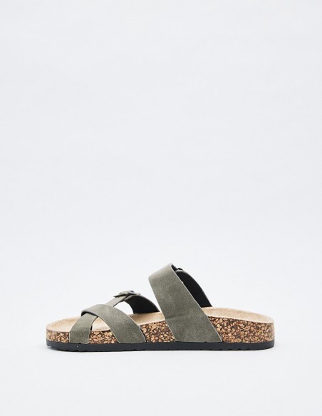 Sandalia fabricada en efecto piel . Cuenta con tira anchas en el empeine con detalle de hebilla. Suela con volumen.