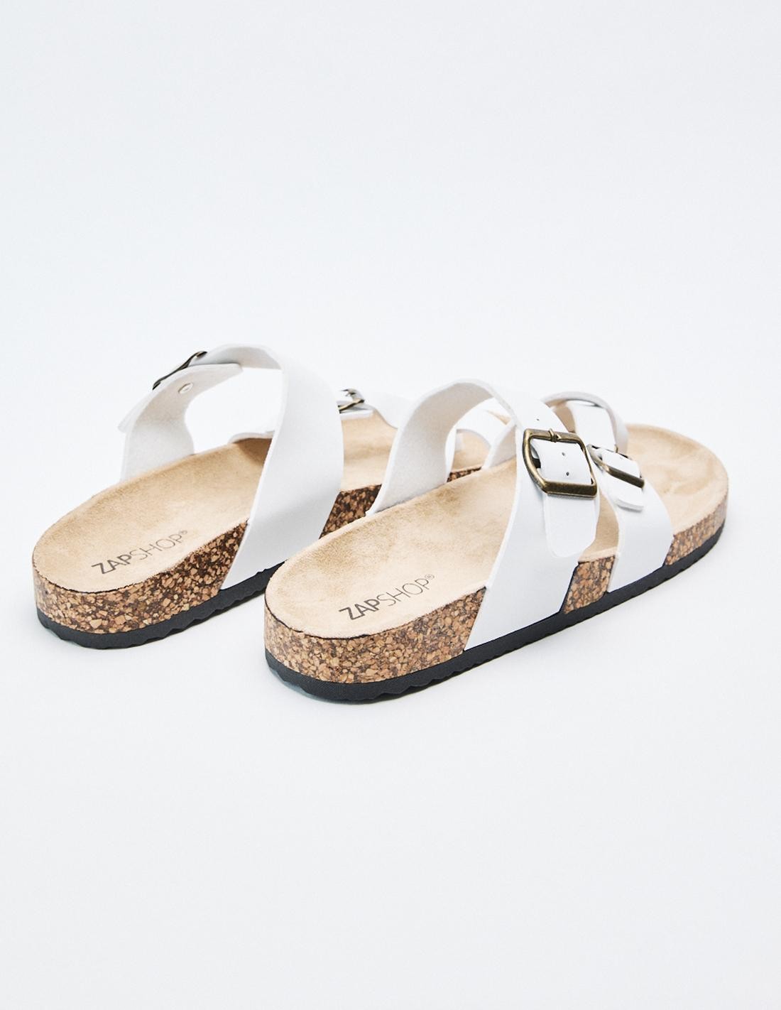Sandalia fabricada en efecto piel . Cuenta con tira ancha en el empeine con detalle de hebilla. Suela con volumen.