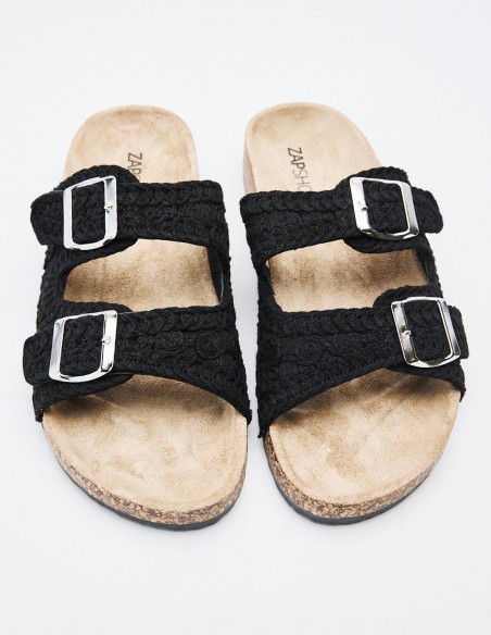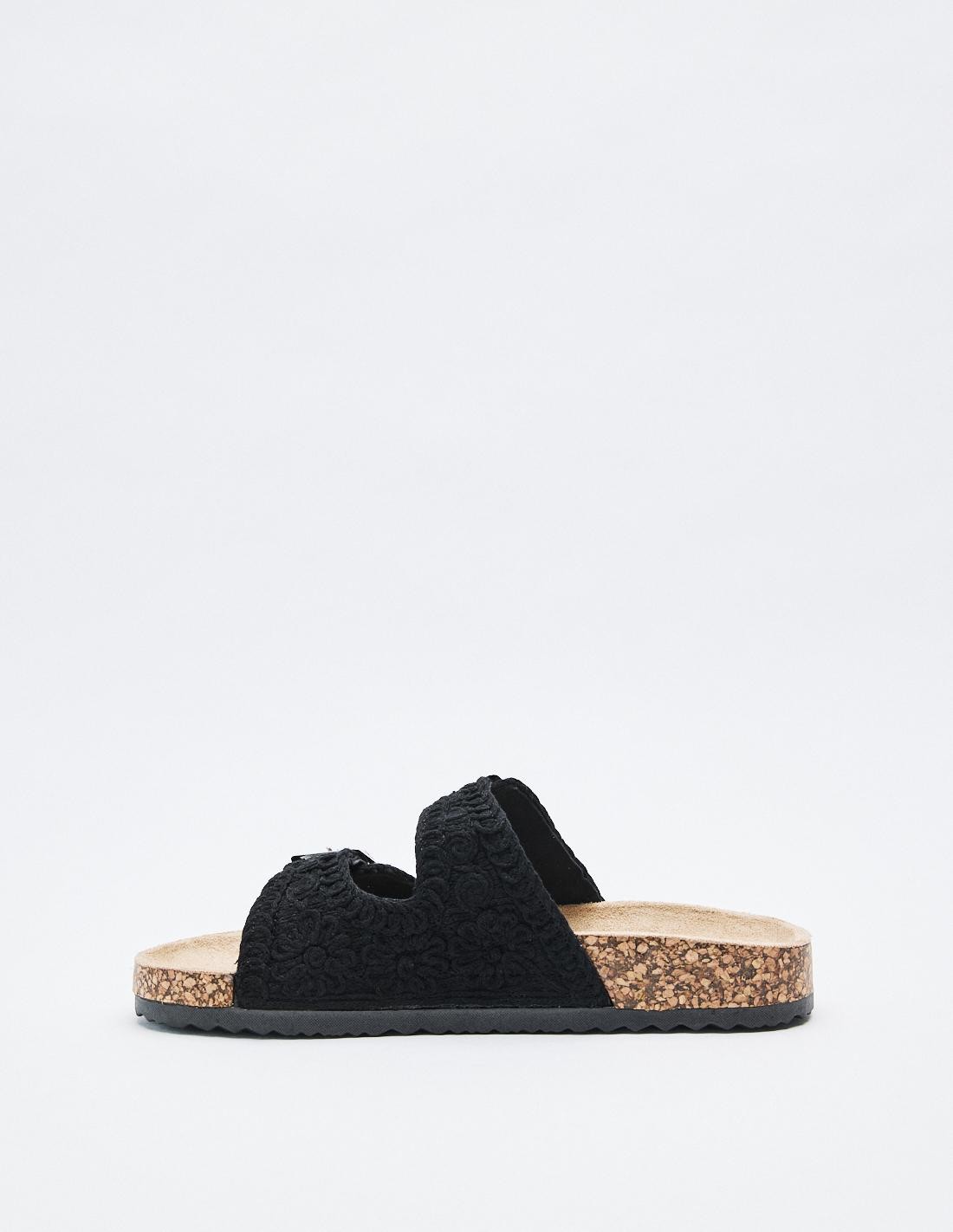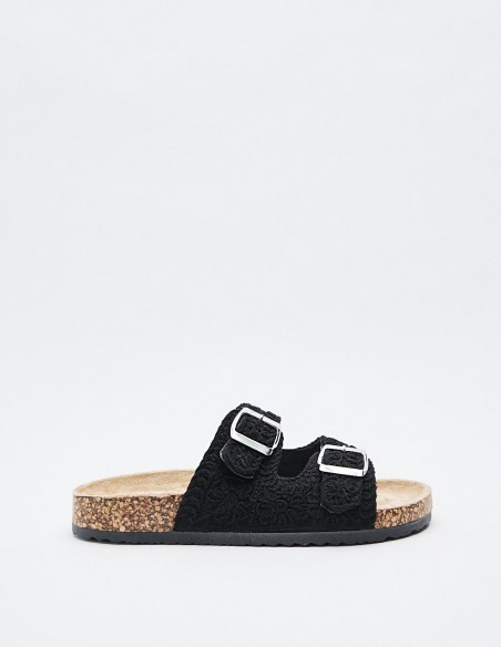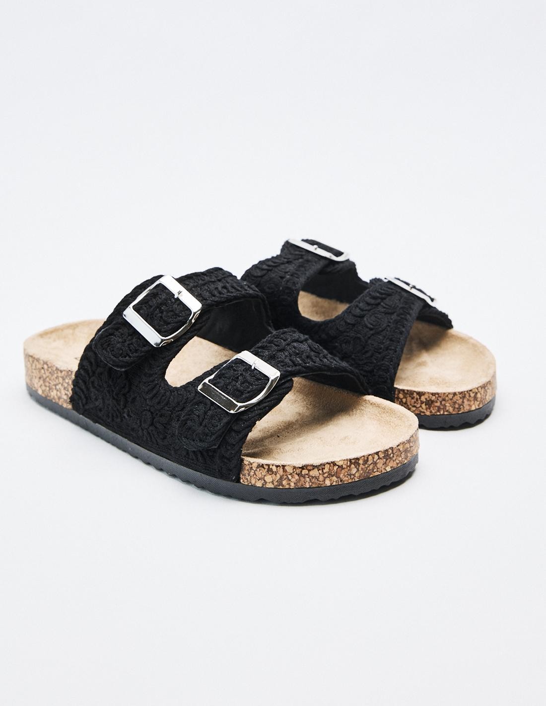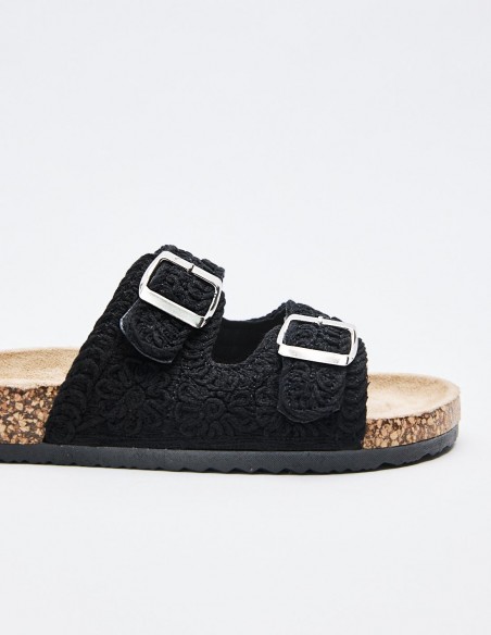 Sandalia fabricada en efecto crochet. Cuenta con dos tiras anchas en el empeine con detalle de hebilla. Suela con volumen.