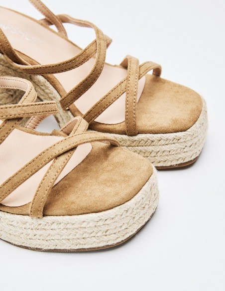 Sandalia en efecto serraje . Tiras finas y cierre mediante hebilla. Tacón grueso de yute Altura del tacón: 10 cm.