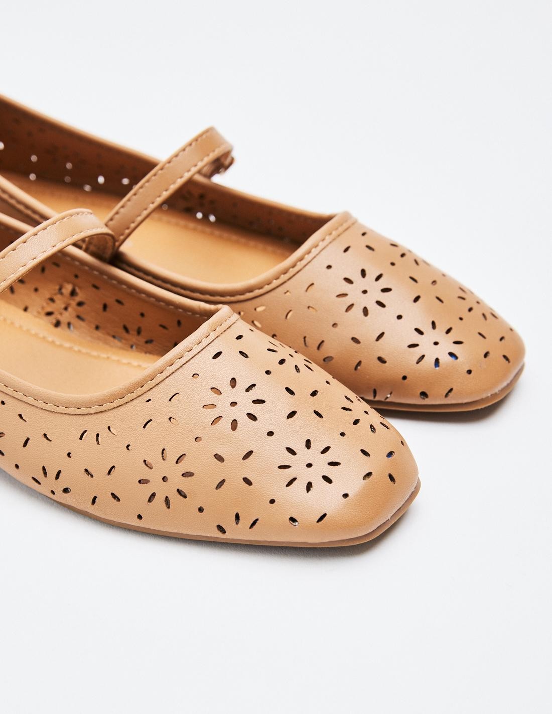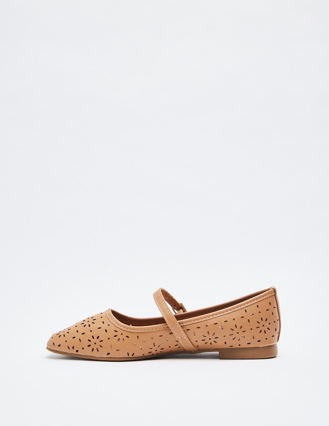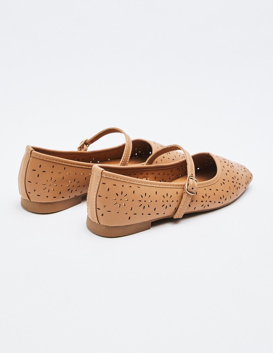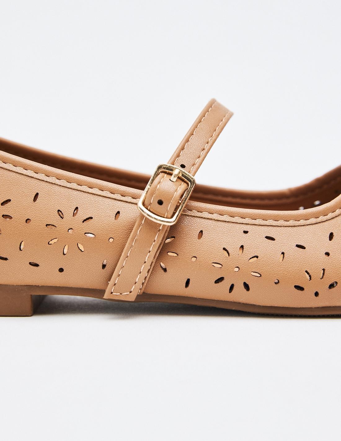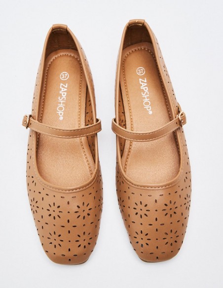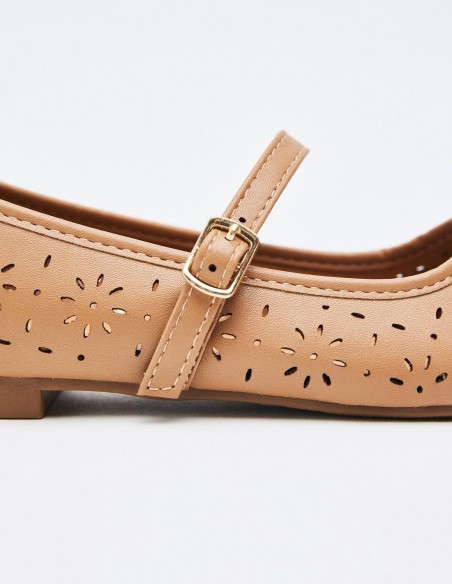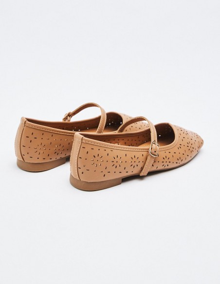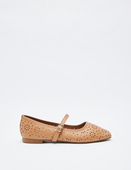 Zapato tipo bailarina en efecto piel. Detalle floral en todo el zaapto. Tira con hebilla en la parte delantera. Acabado en punta cuadrada. Altura de la suela: 0,5 cm