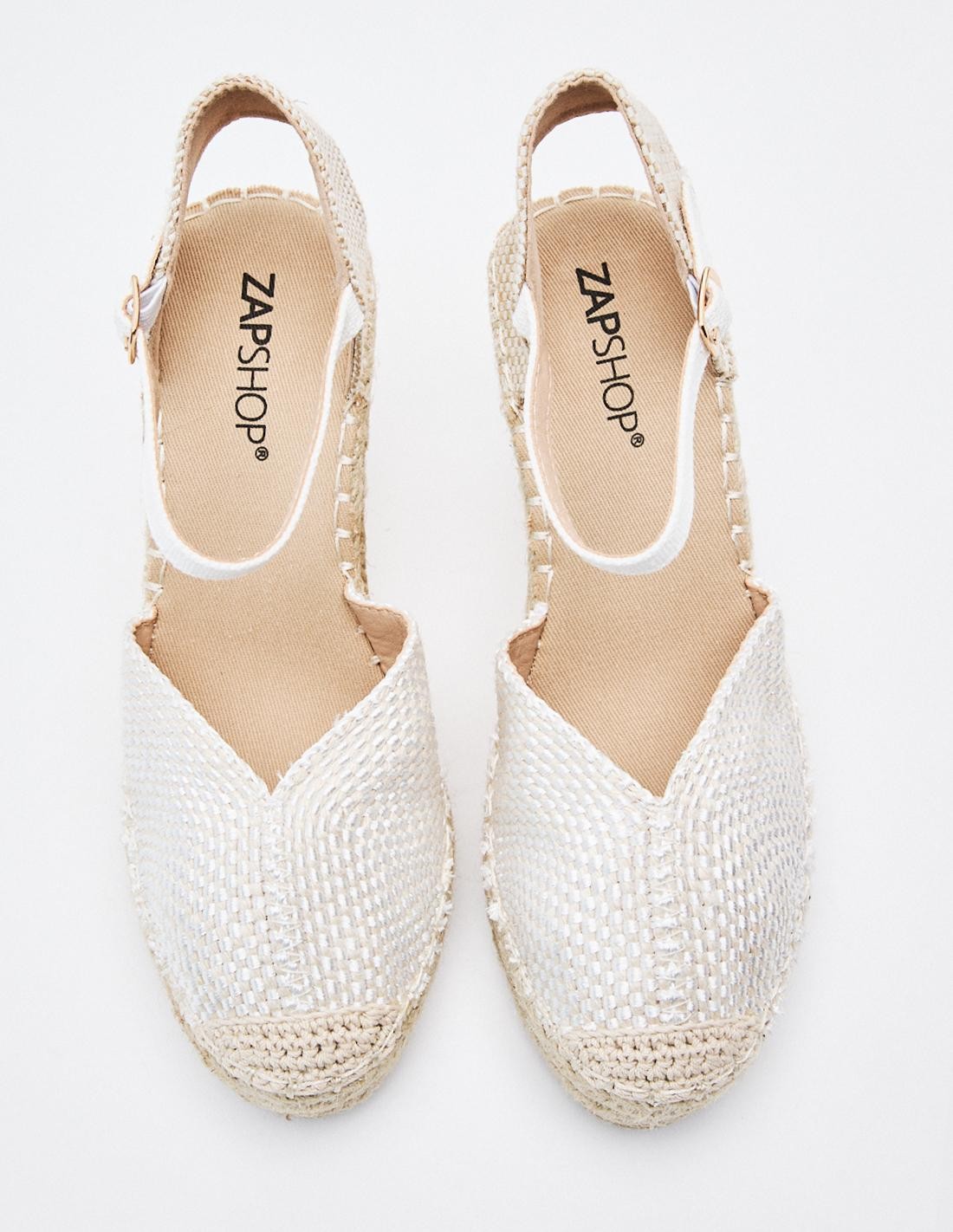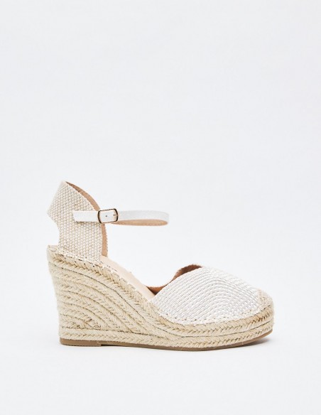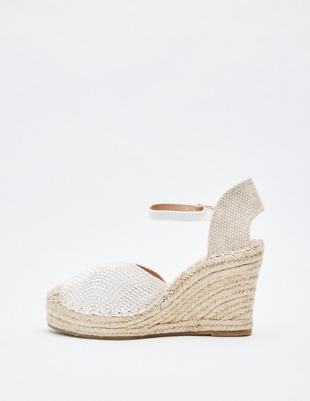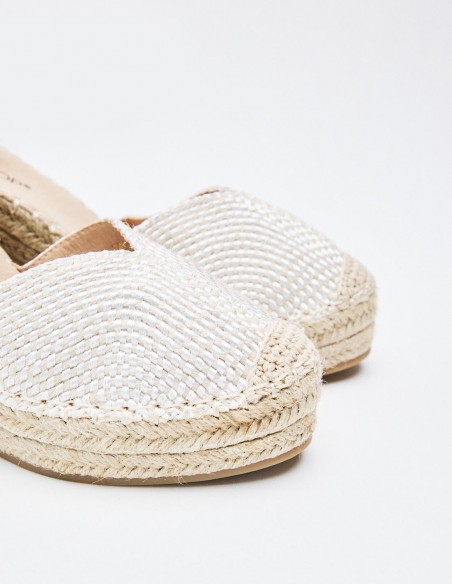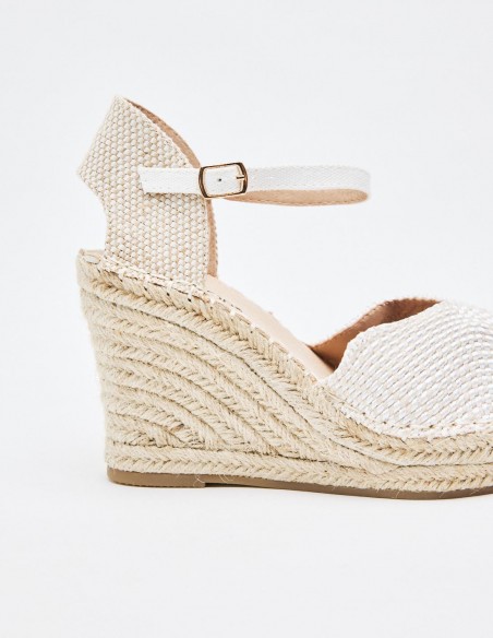 Zapato destalonado tipo alpargata en efecto tejido. Tacón alto en forma de cuña. Cierre mediante hebilla en la pulsera del tobillo.