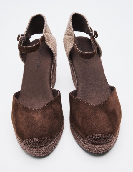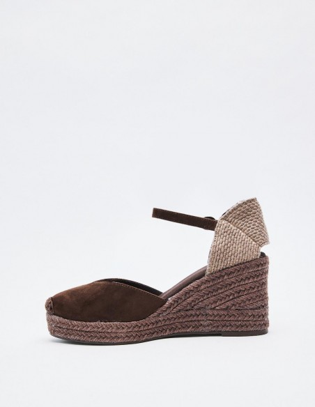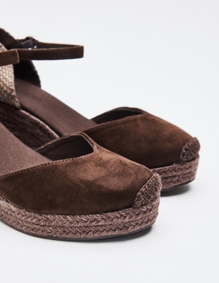 Zapato destalonado tipo alpargata en efecto serraje . Tacón alto en forma de cuña. Cierre mediante pulsera con hebilla en el tobillo. Suela de goma con yute . Altura del tacón: 6.8 cm