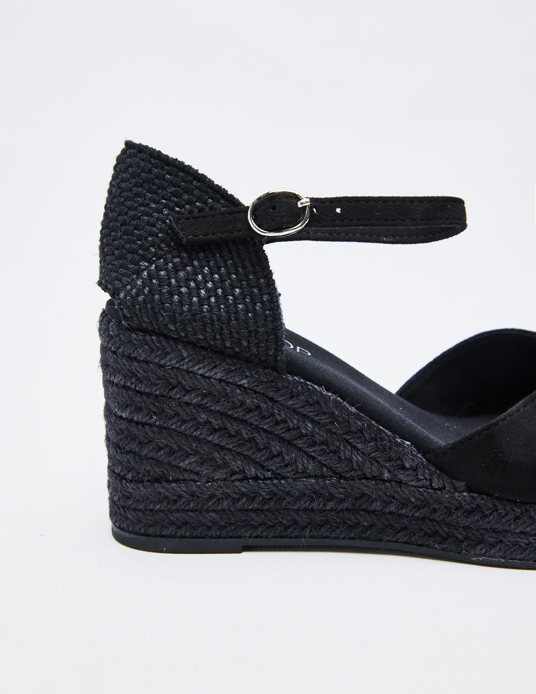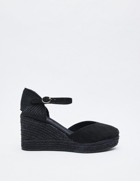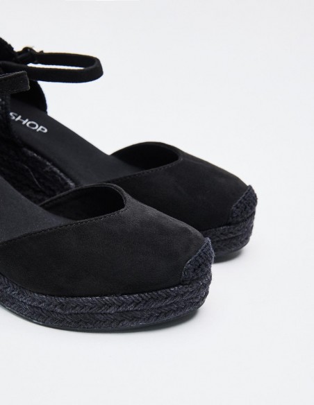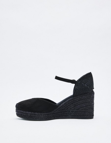 Zapato destalonado tipo alpargata en efecto serraje . Tacón alto en forma de cuña. Cierre mediante pulsera con hebilla en el tobillo. Suela de goma con yute . Altura del tacón: 6.8 cm