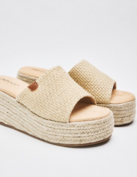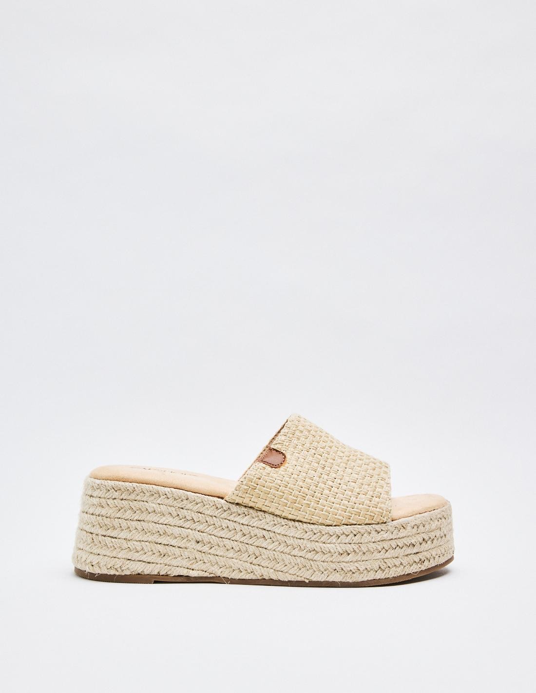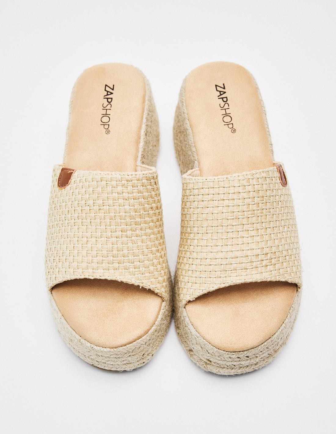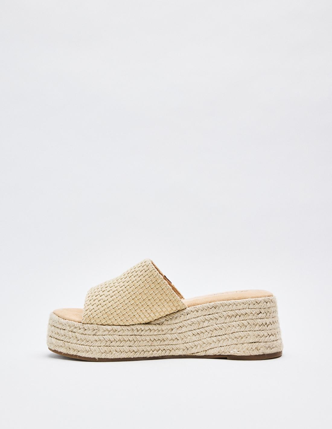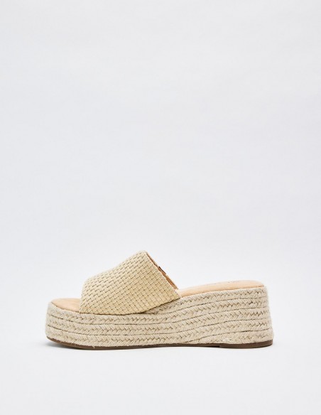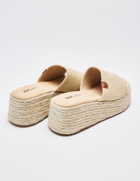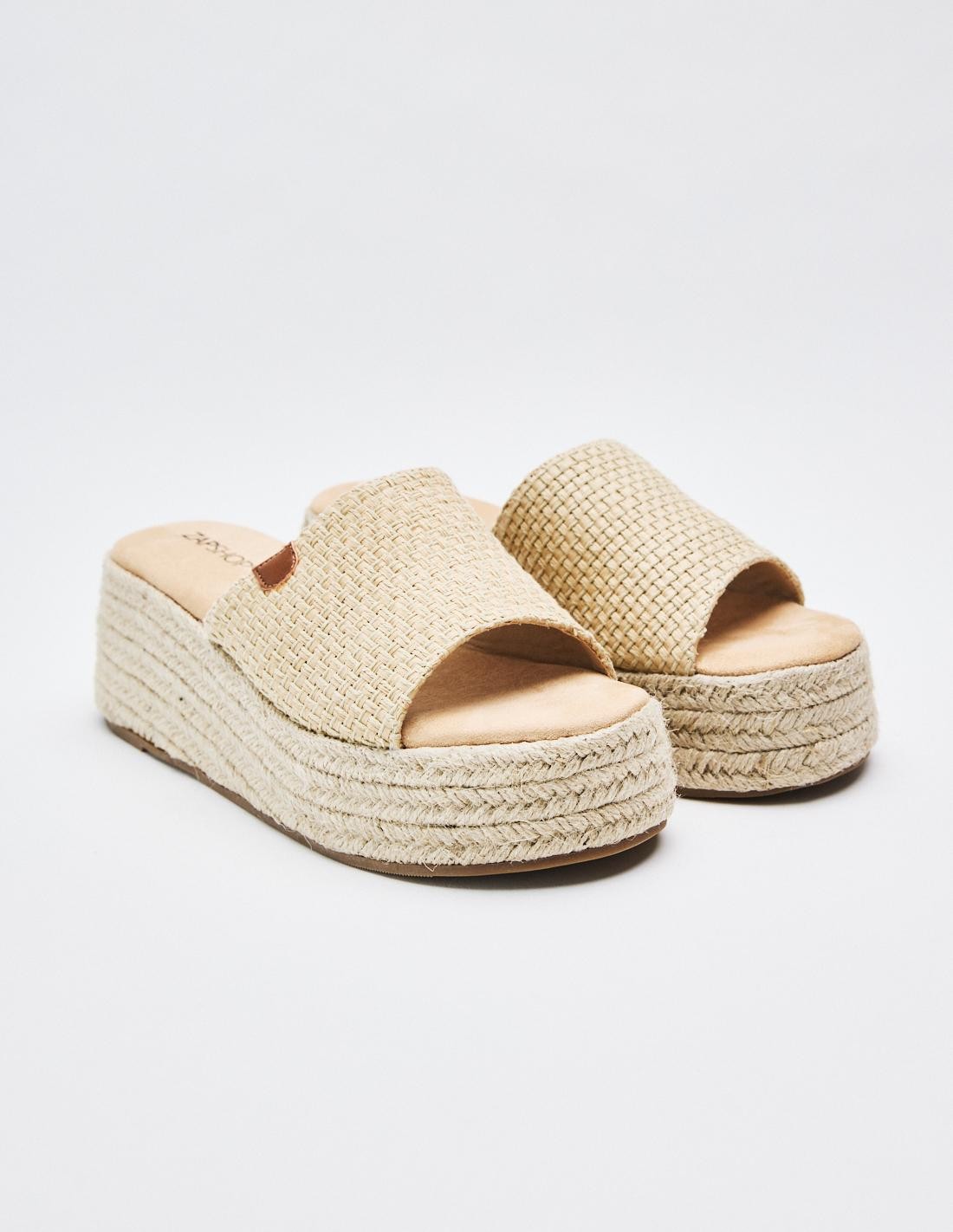Zapato tipo sandalia en efecto trenzado. Tacón en forma de plataforma. Banda ancha en la parte delantera . Acabado en punta redonda.