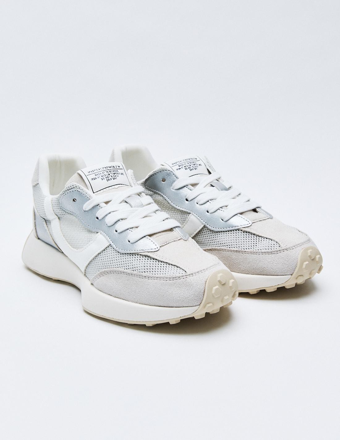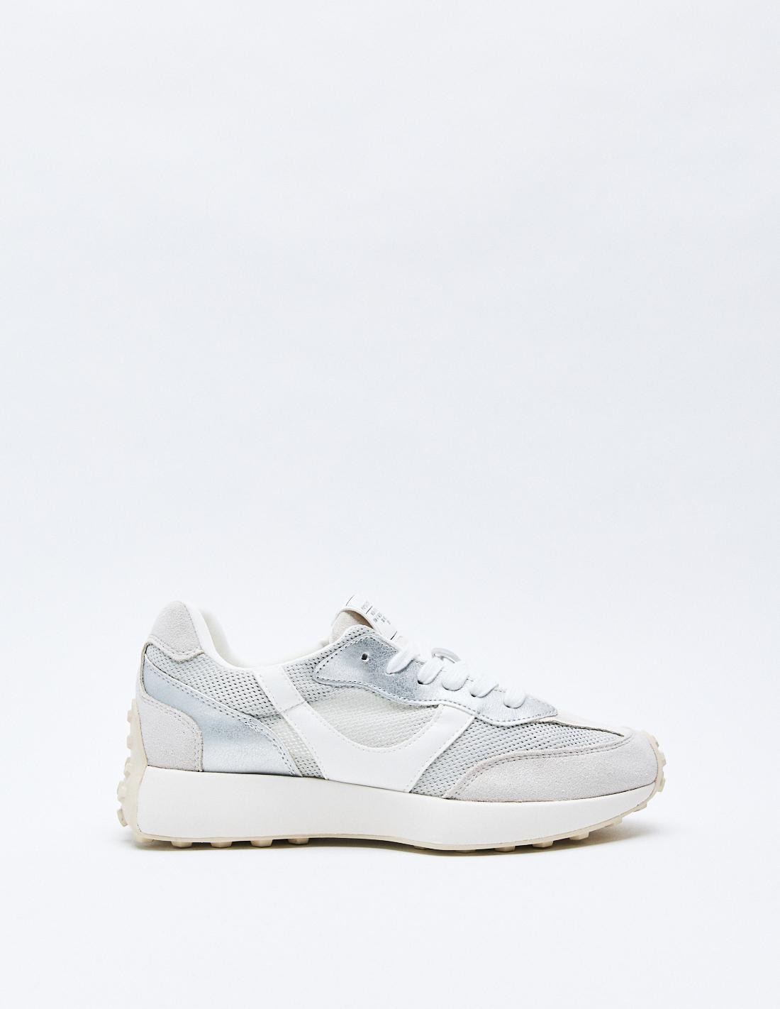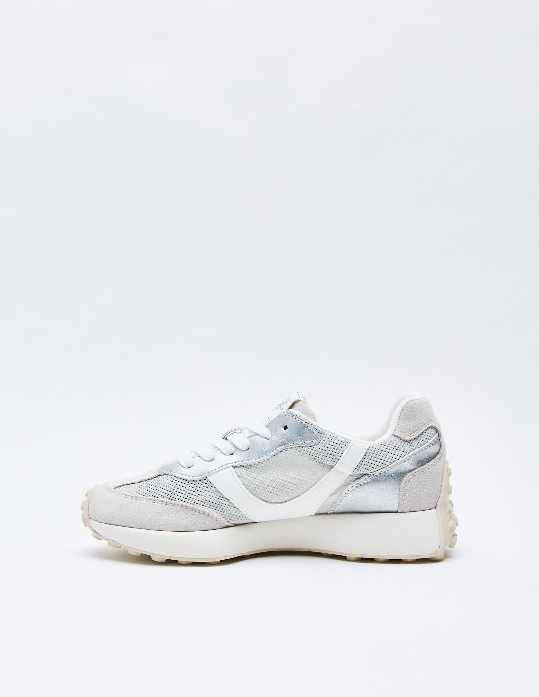 Zapato tipo running deportivo. Combinación de materiales. Pespunte en el cuerpo. Cierre mediante cordones. Acabado en punta redonda. Altura de la suela: 3 cm