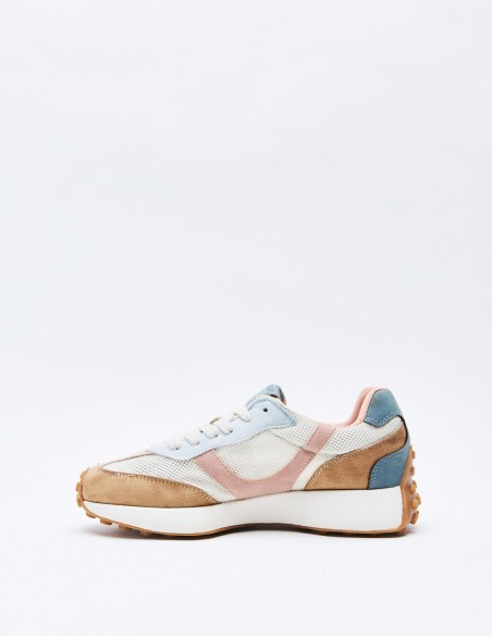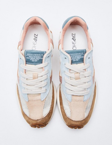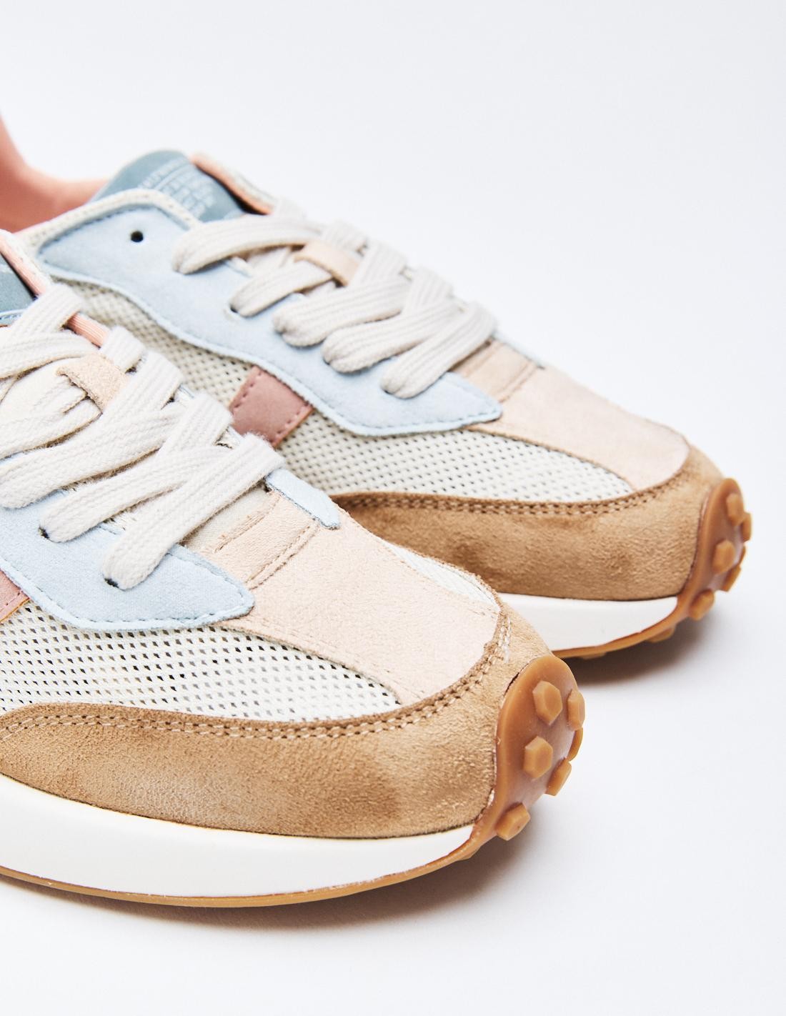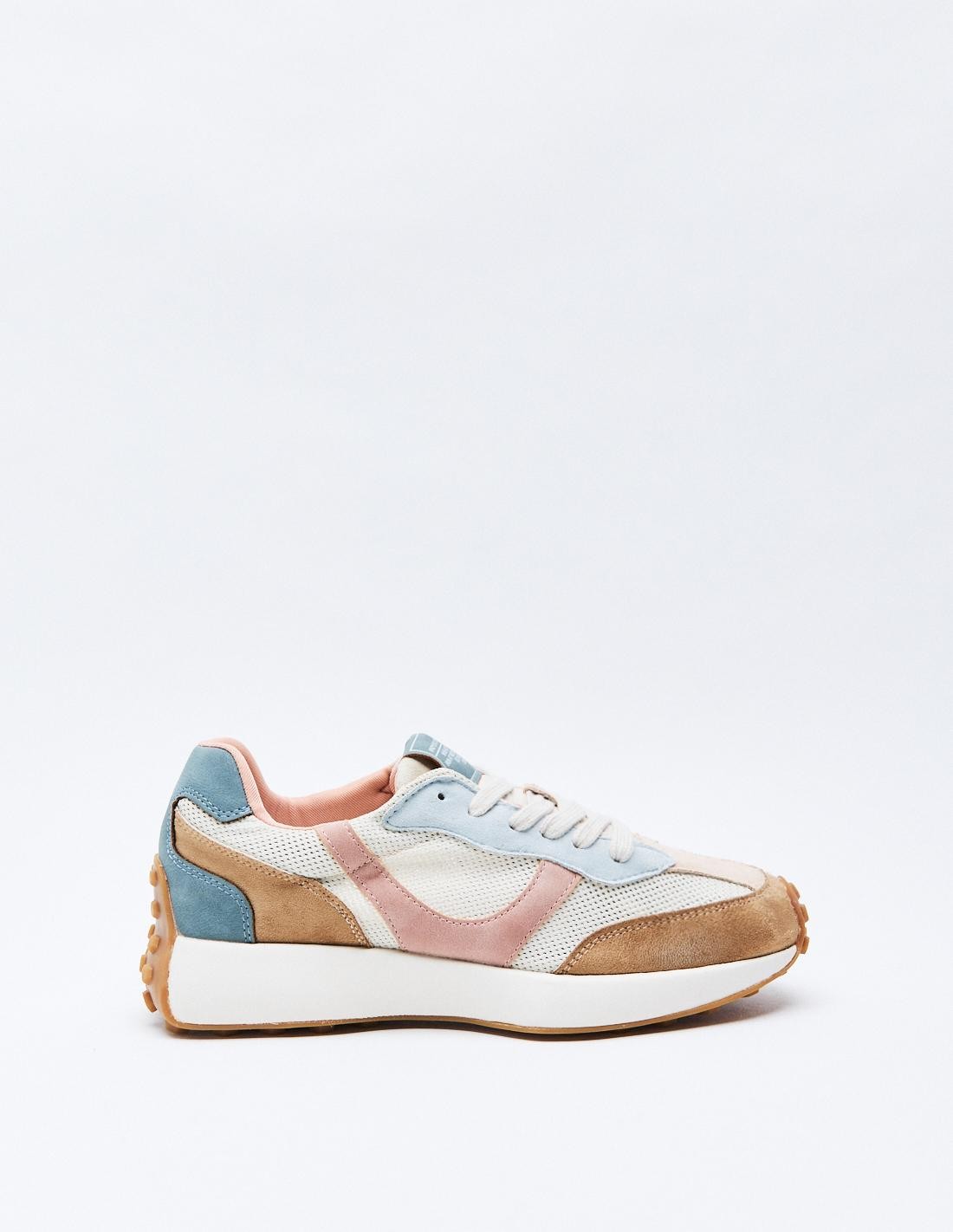 Zapato tipo running deportivo. Combinación de materiales. Pespunte en el cuerpo. Cierre mediante cordones. Acabado en punta redonda.