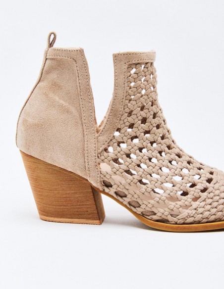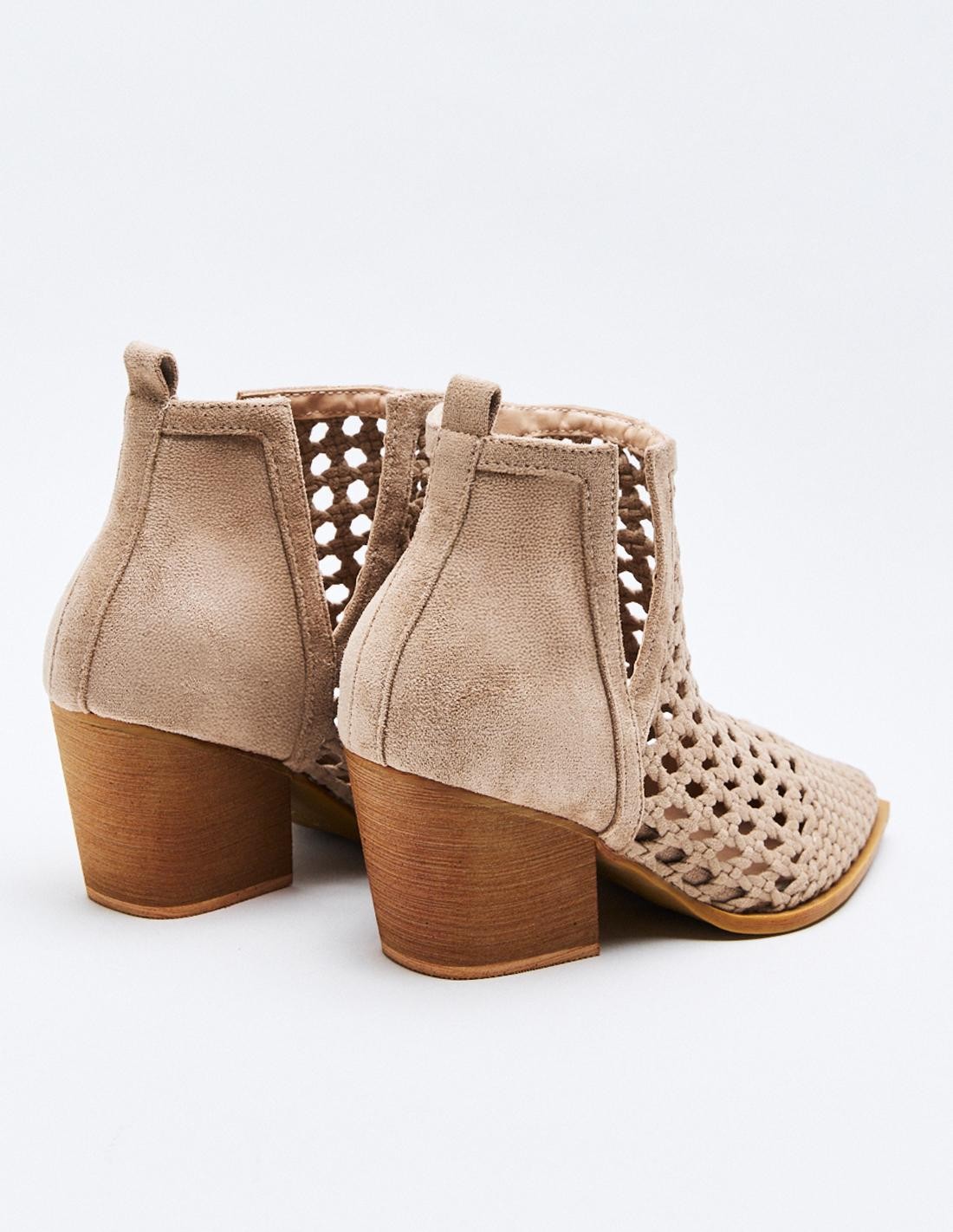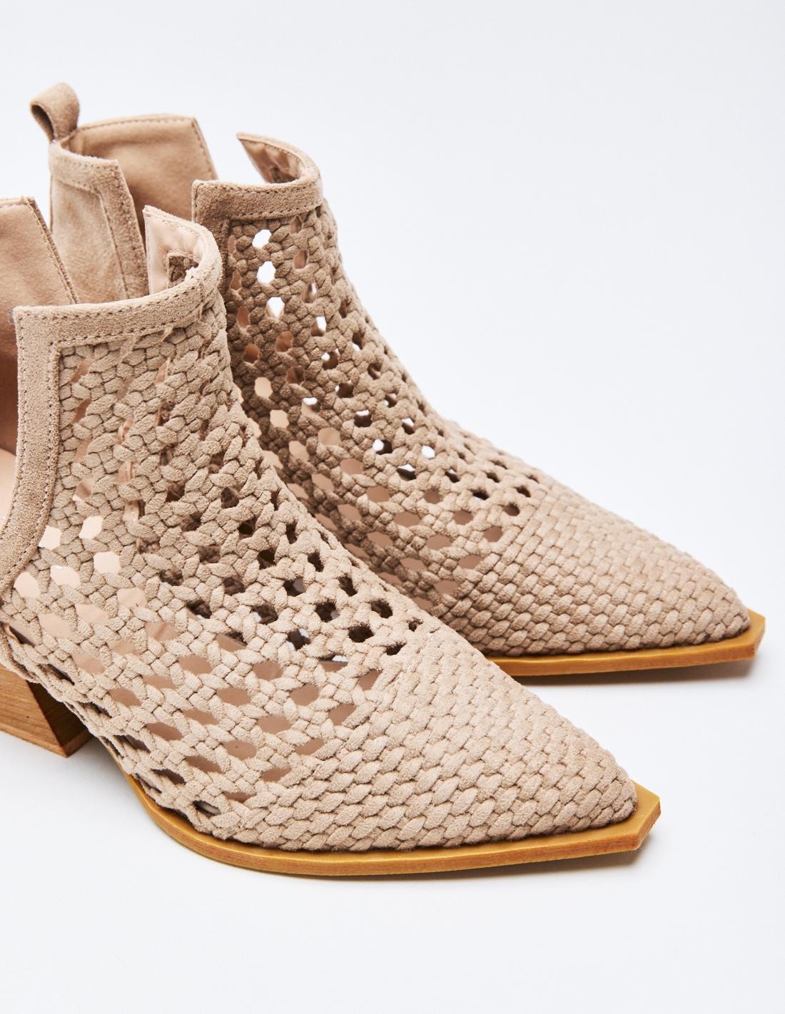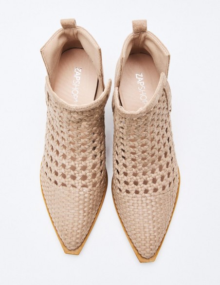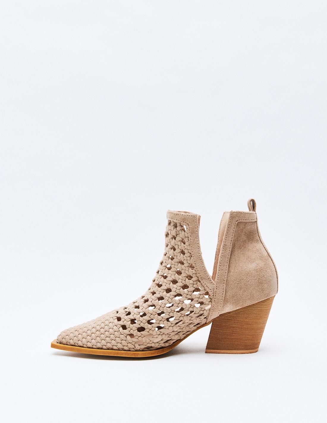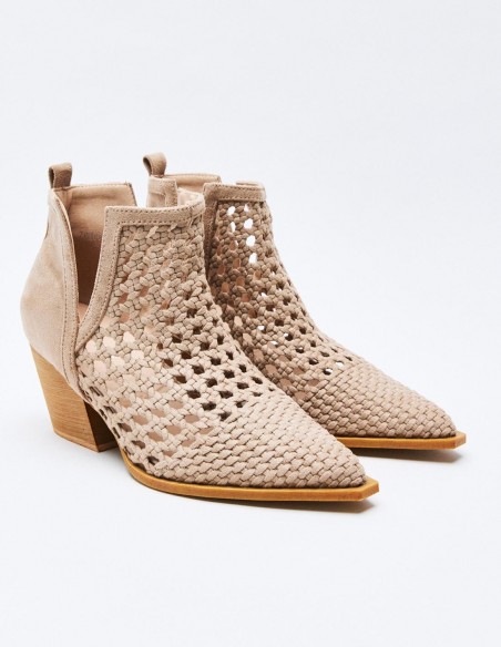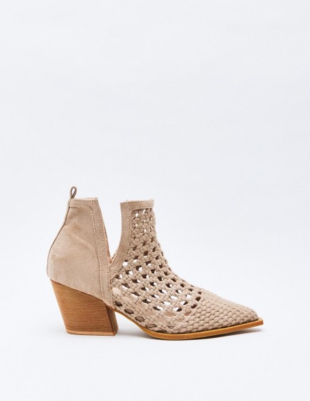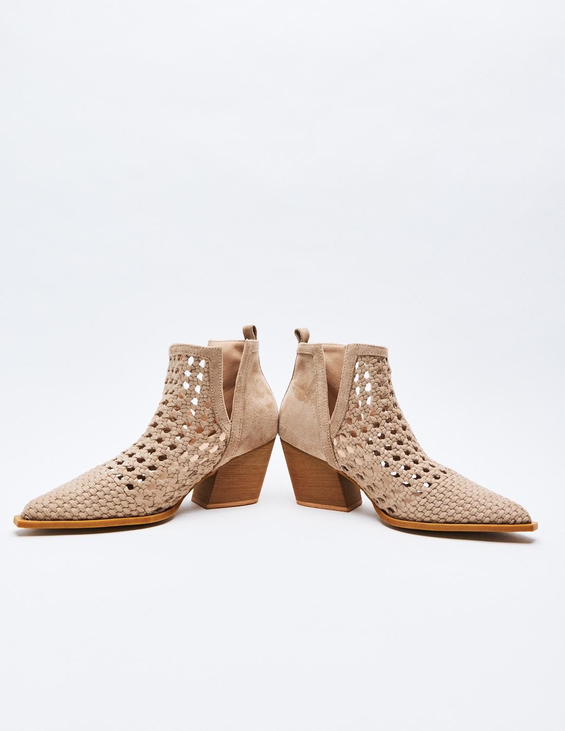 Zapato de tacón tipo botín de estilo cowboy en efecto serraje. Acabado en punta. Tacón ancho geométrico. Cierre mediante cremallera en el lateral.