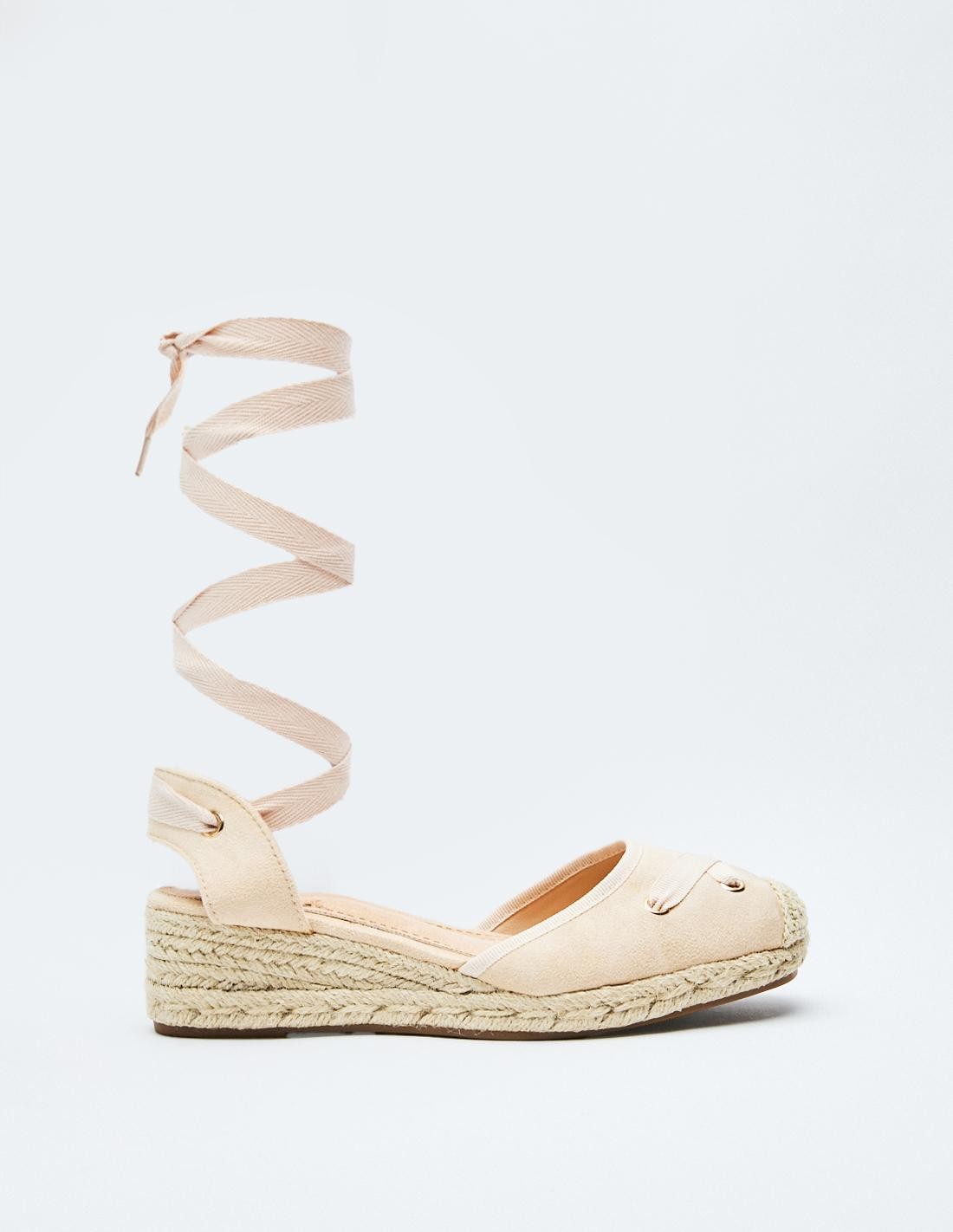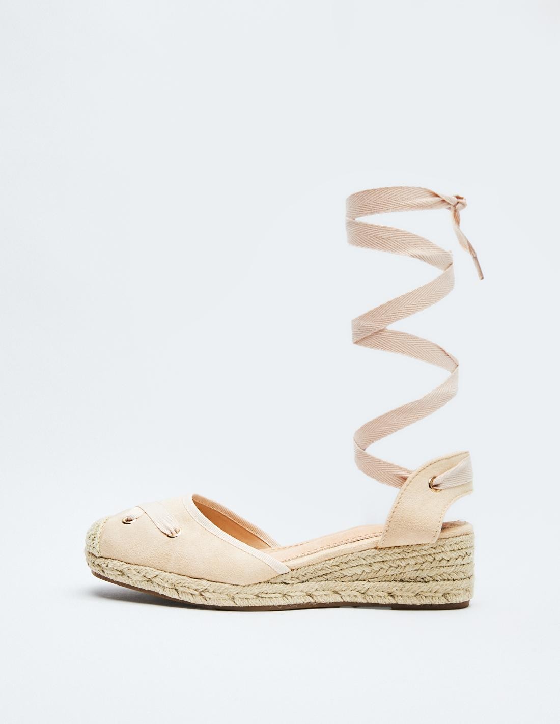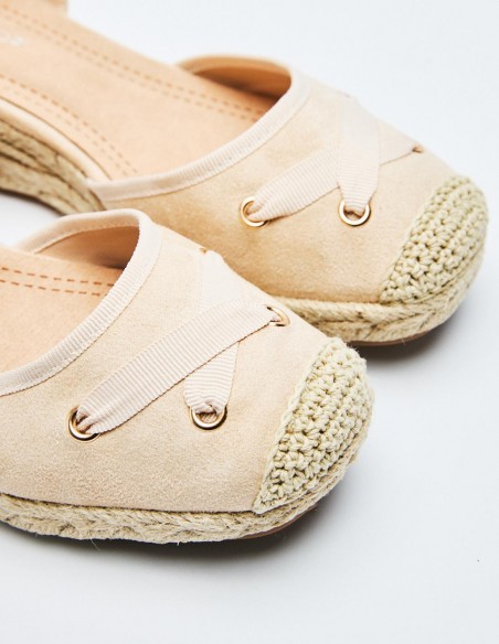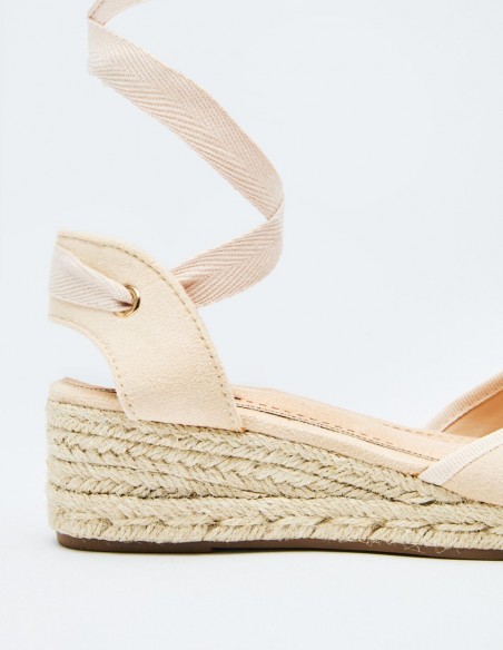 Zapato destalonado tipo alpargata en efecto serraje. Tacón alto en forma de cuña. Tiras de tejido para atar al tobillo. Altura del tacón: 5 cm.